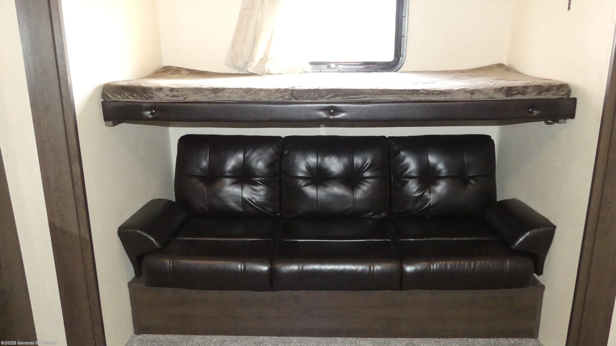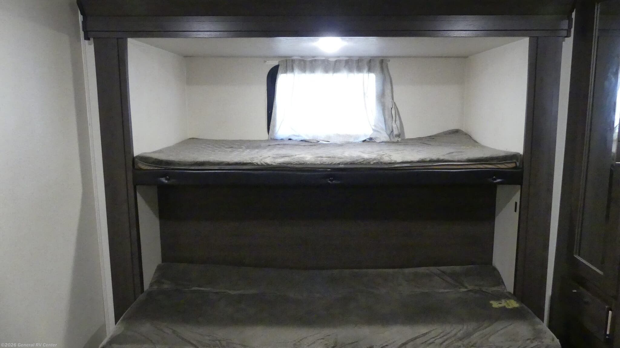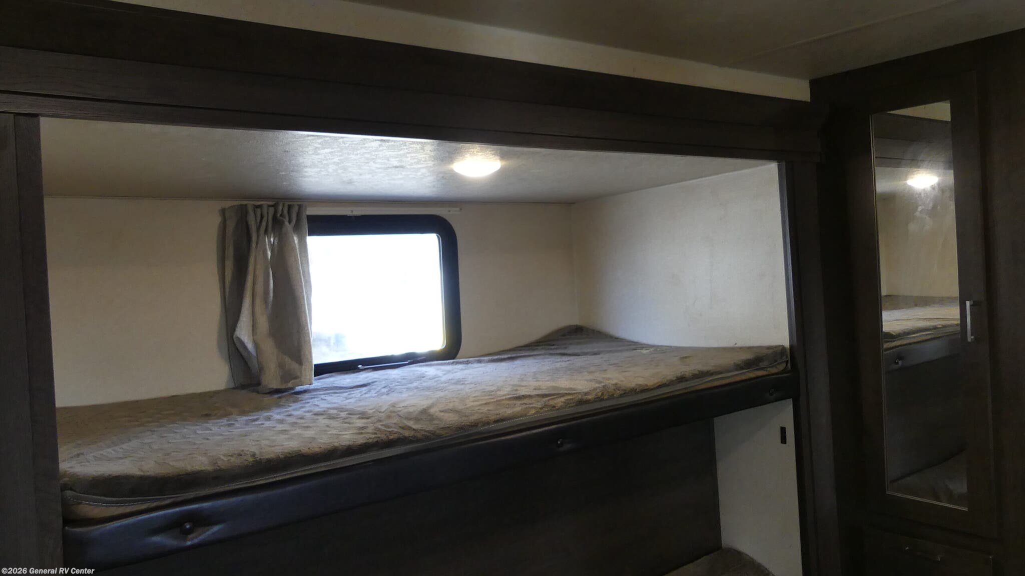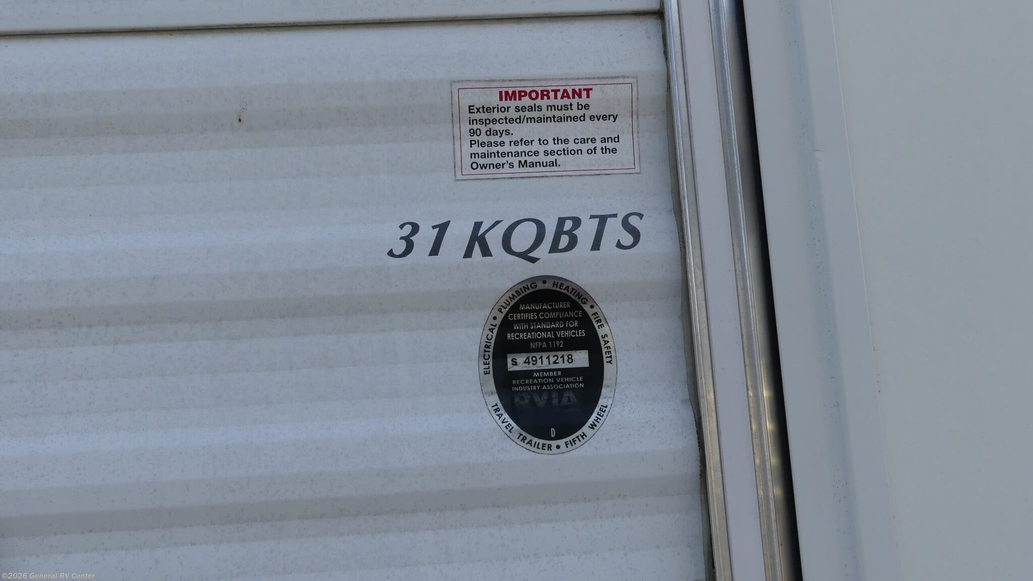 Experience the ultimate in family-friendly camping with the 2018 Forest River Wildwood 31KQBTS. This spacious RV is designed for adventure and comfort, boasting a remarkable capacity to sleep up to 11 guests. Its clever layout features a private front bedroom with a cozy queen bed, ensuring restful nights. At the rear, a dedicated bunkhouse with four bunks offers a perfect haven for the kids or extra guests, making it an ideal choice for family getaways. The heart of this RV is its well-appointed center kitchen and living area, where you can gather for meals and relaxation. The kitchen comes equipped with a three-burner cooktop and a mid-size refrigerator, perfect for preparing and storing your favorite meals. The U-shaped dinette and sofa provide ample seating for dining or lounging. Step outside and enjoy the convenience of the 18-foot powered retractable awning, which creates a perfect outdoor living space for enjoying the great outdoors. With three slides, this RV offers plenty of room to move and entertain, making it a true home away from home. For more details and to explore this fantastic RV in person, visit your nearest General RV dealership.