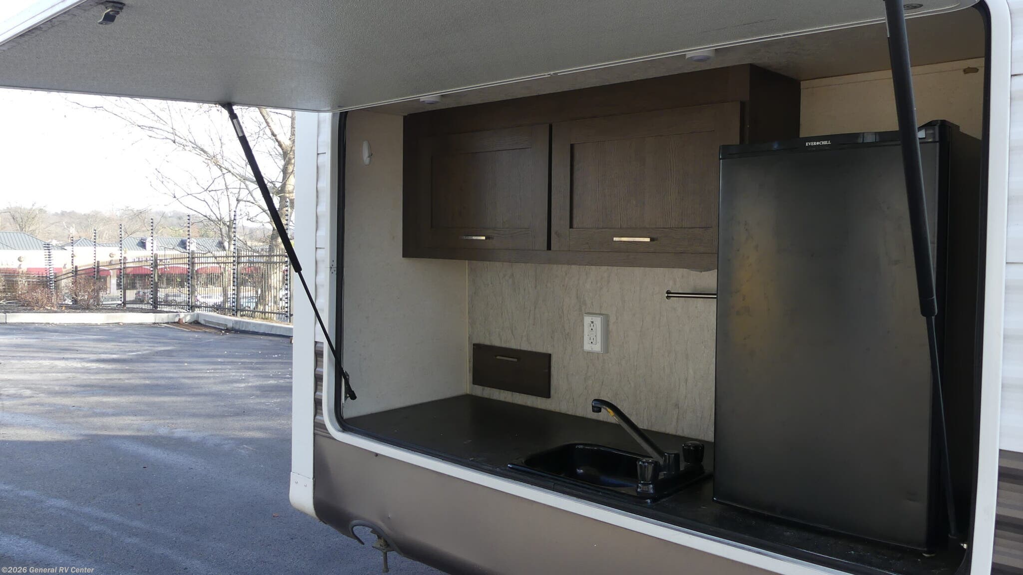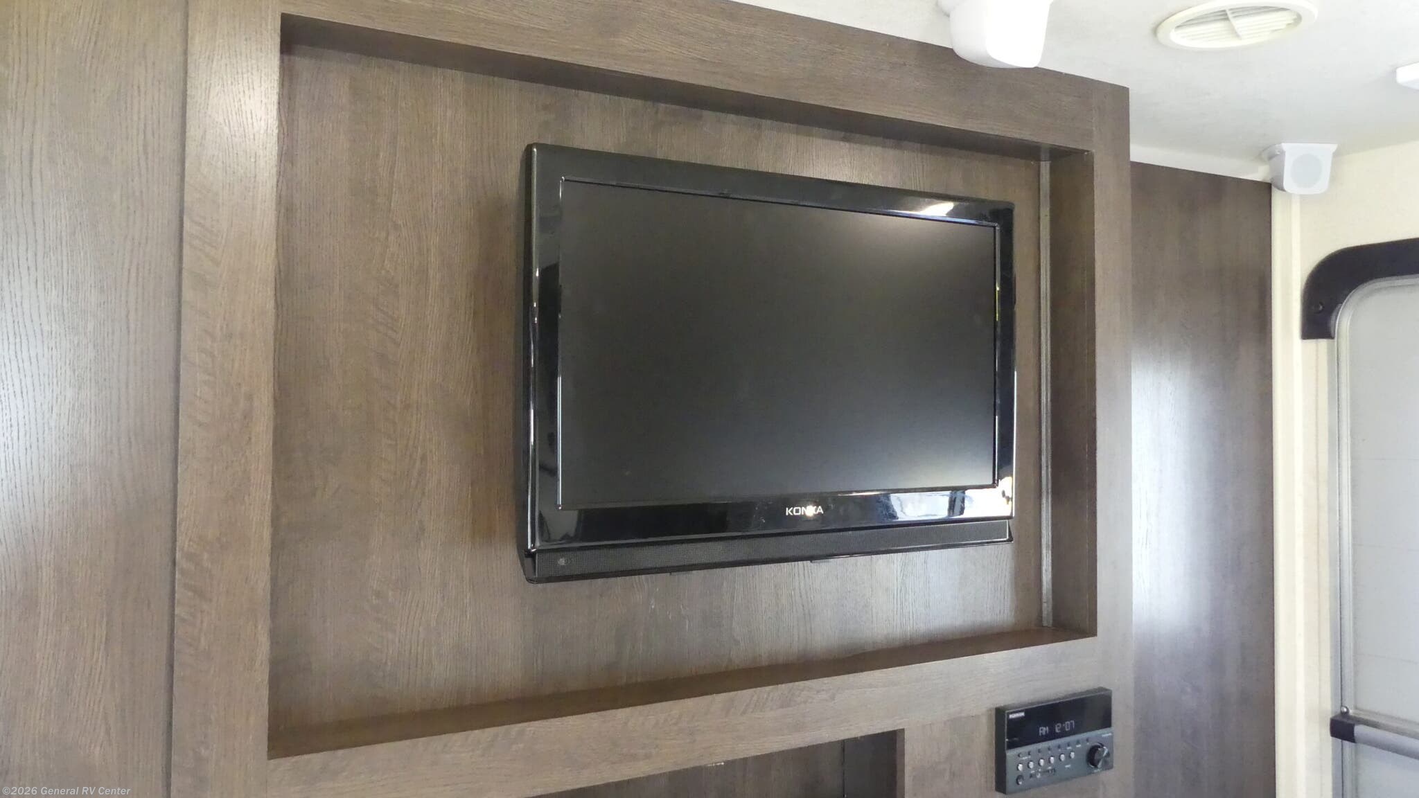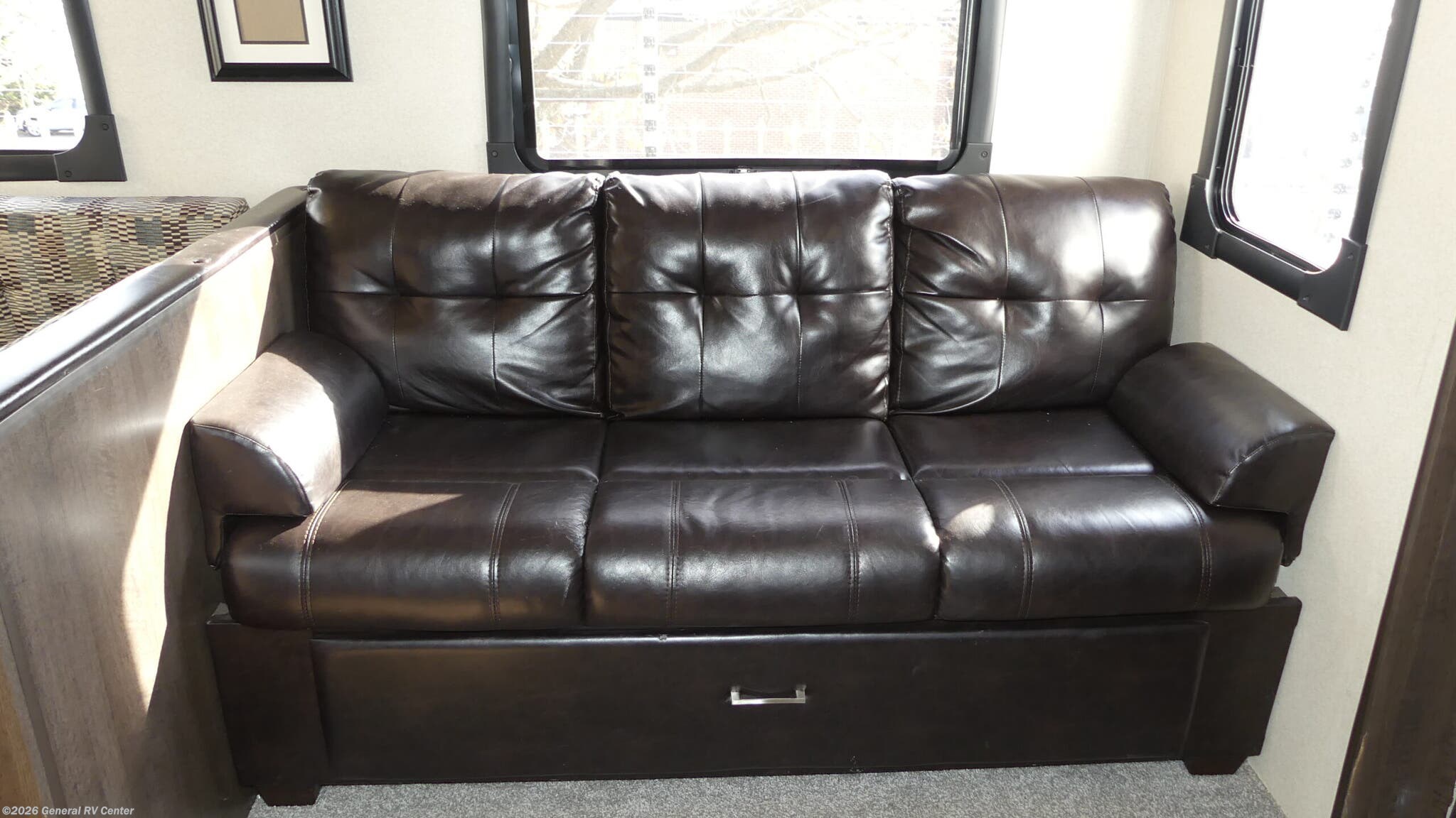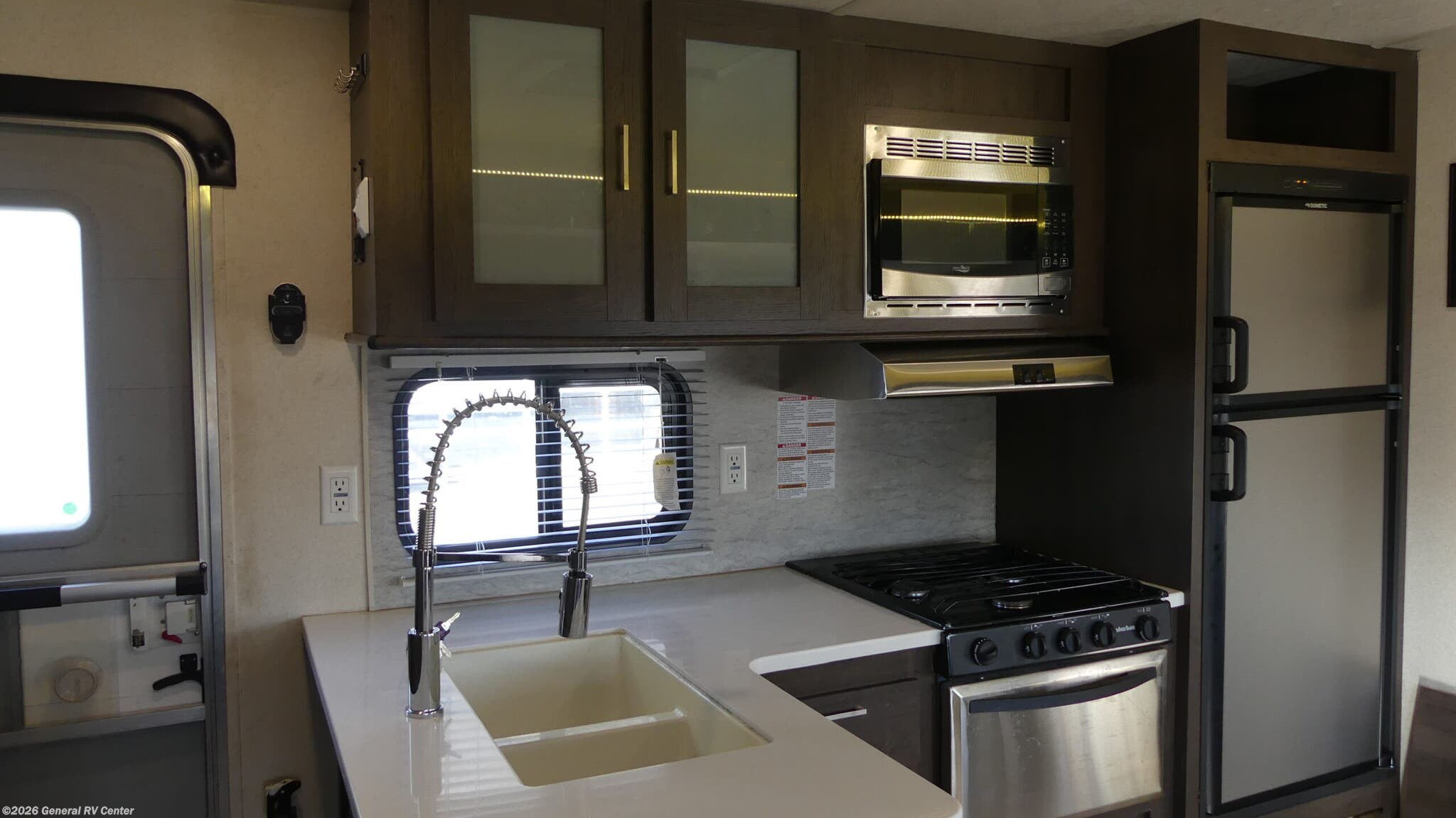 Experience the ultimate in family-friendly camping with the 2018 Forest River Wildwood 31KQBTS. This spacious RV is designed for adventure and comfort, boasting a remarkable capacity to sleep up to 11 guests. Its clever layout features a private front bedroom with a cozy queen bed, ensuring restful nights. At the rear, a dedicated bunkhouse with four bunks offers a perfect haven for the kids or extra guests, making it an ideal choice for family getaways. The heart of this RV is its well-appointed center kitchen and living area, where you can gather for meals and relaxation. The kitchen comes equipped with a three-burner cooktop and a mid-size refrigerator, perfect for preparing and storing your favorite meals. The U-shaped dinette and sofa provide ample seating for dining or lounging. Step outside and enjoy the convenience of the 18-foot powered retractable awning, which creates a perfect outdoor living space for enjoying the great outdoors. With three slides, this RV offers plenty of room to move and entertain, making it a true home away from home. For more details and to explore this fantastic RV in person, visit your nearest General RV dealership.