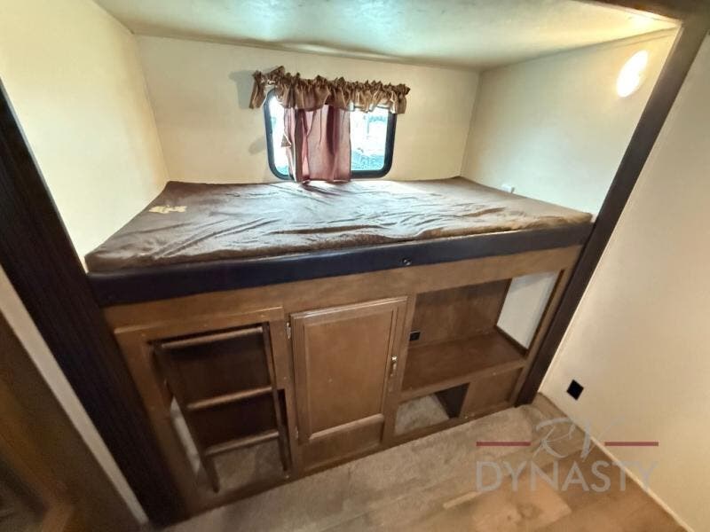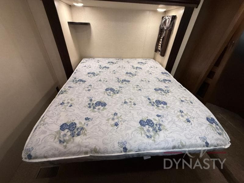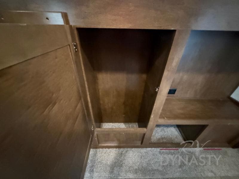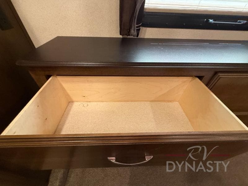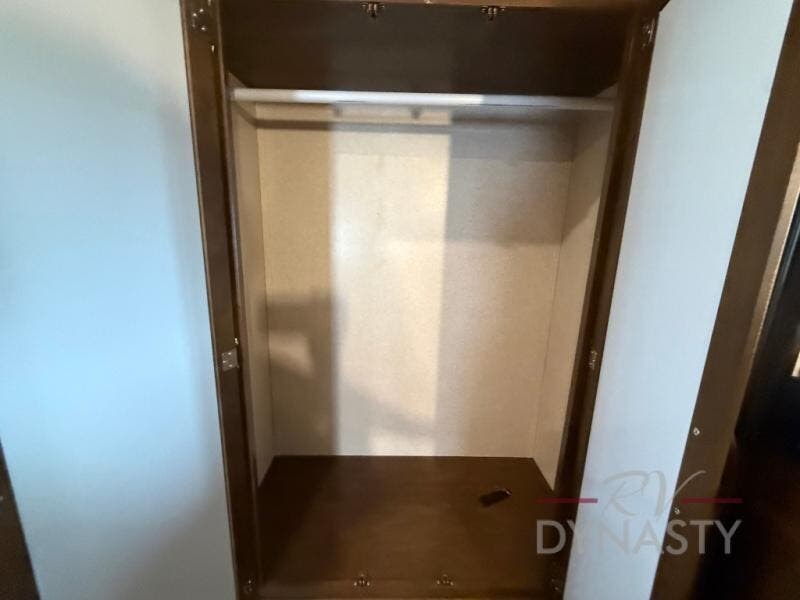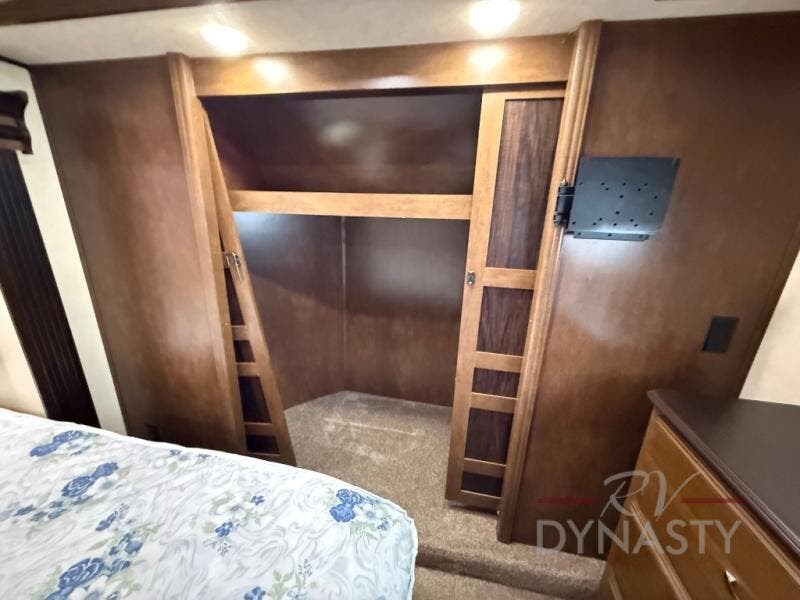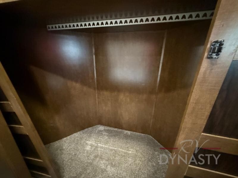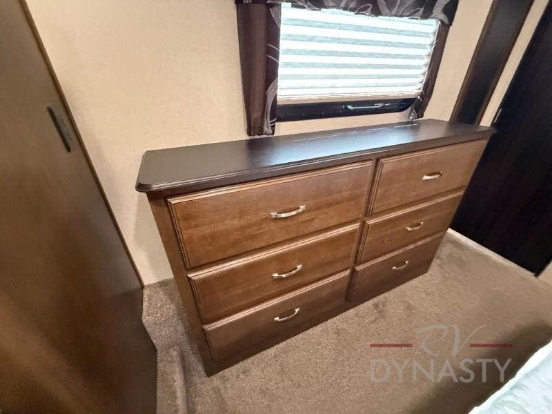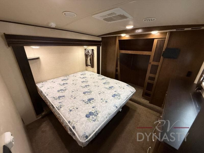 The front master bedroom offers a custom king bed slide with corner shelf, and a dresser at the foot of the bed. Along the front wall you will find a full wall wardrobe with shelf, plus the wardrobe offers an optional washer/dryer prep.
