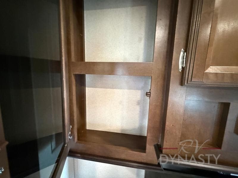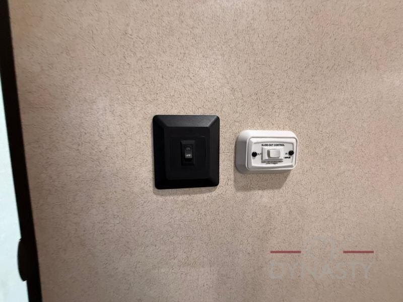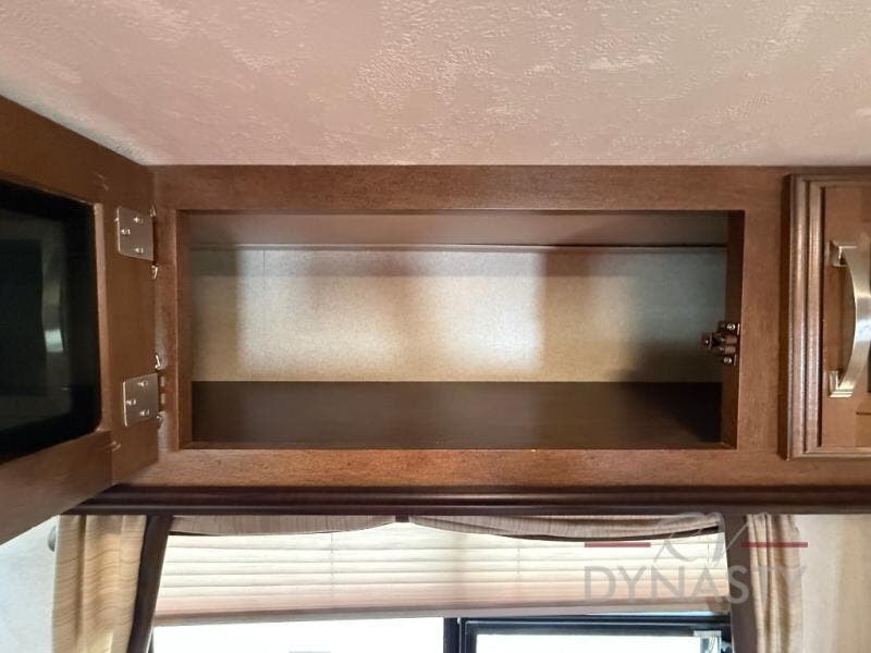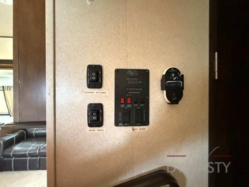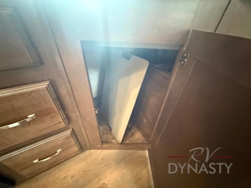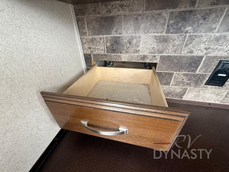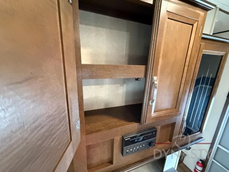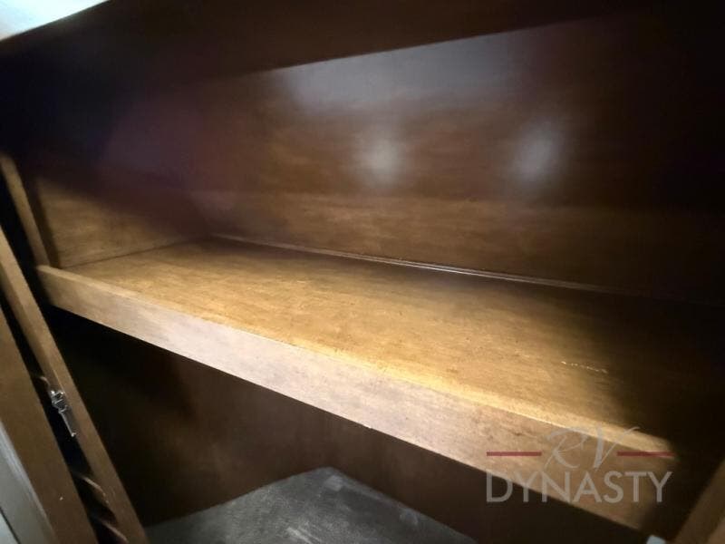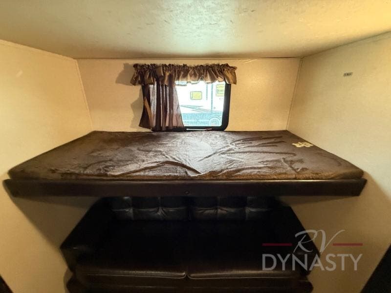 The front master bedroom offers a custom king bed slide with corner shelf, and a dresser at the foot of the bed. Along the front wall you will find a full wall wardrobe with shelf, plus the wardrobe offers an optional washer/dryer prep.