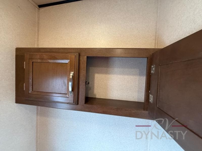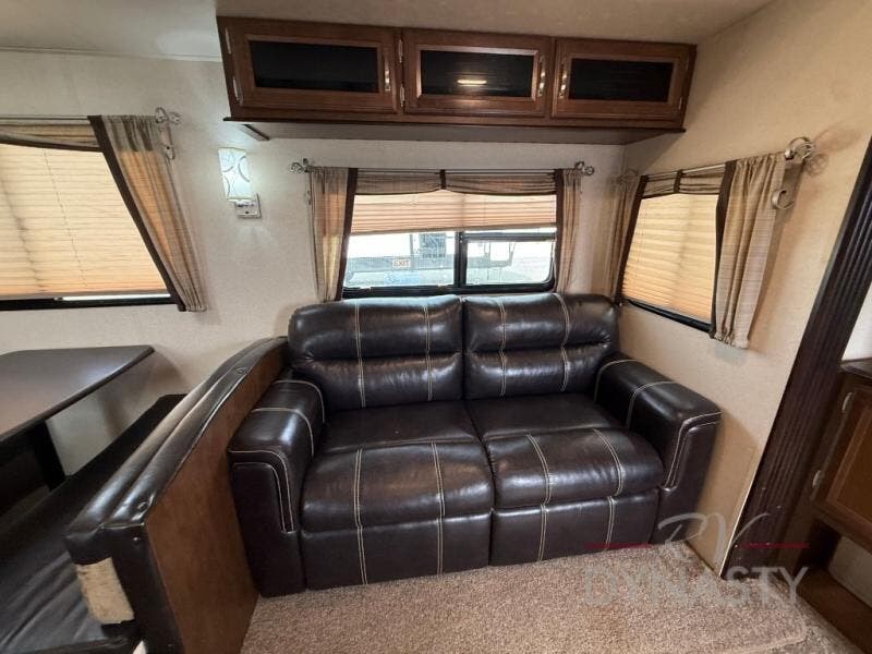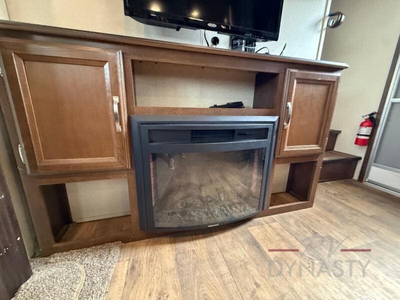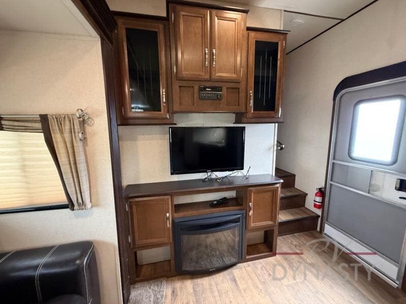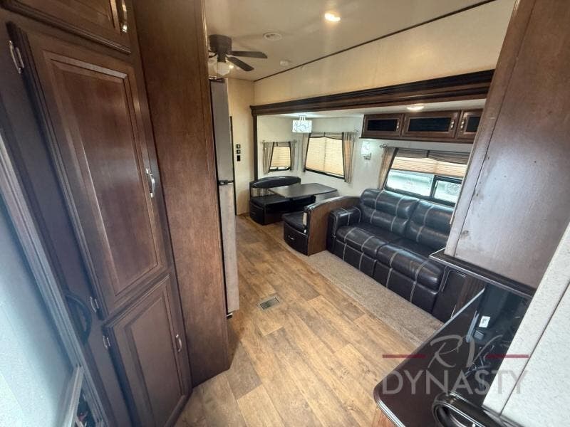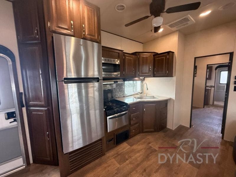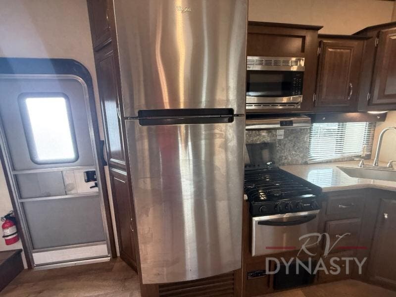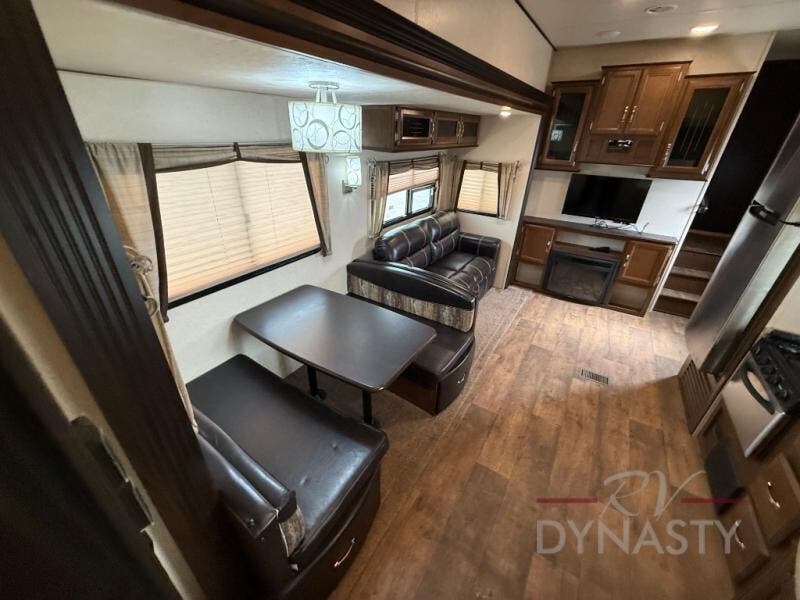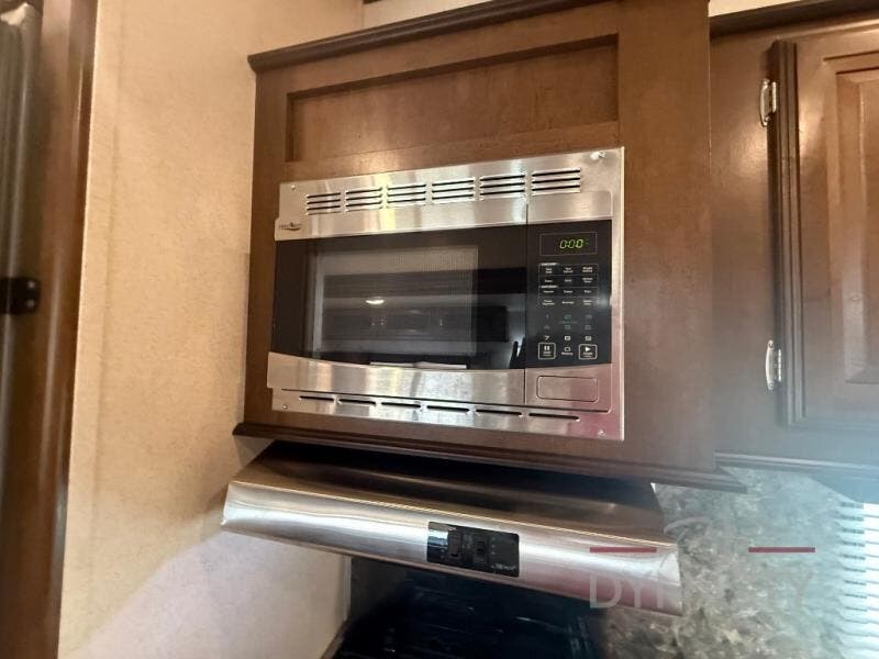 As you step inside the main entry to your left there is a pantry, refrigerator, three burner range, microwave, and a kitchen sink. On the opposite side of the fifth wheel you will find a slide out jumbo dinette and a tri-fold sofa. Next to the sofa you can enjoy relaxing while watching the entertainment center and fireplace. There are plenty of overhead cabinets in this combined kitchen and living area.