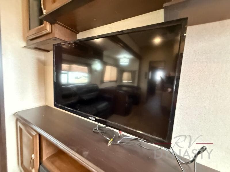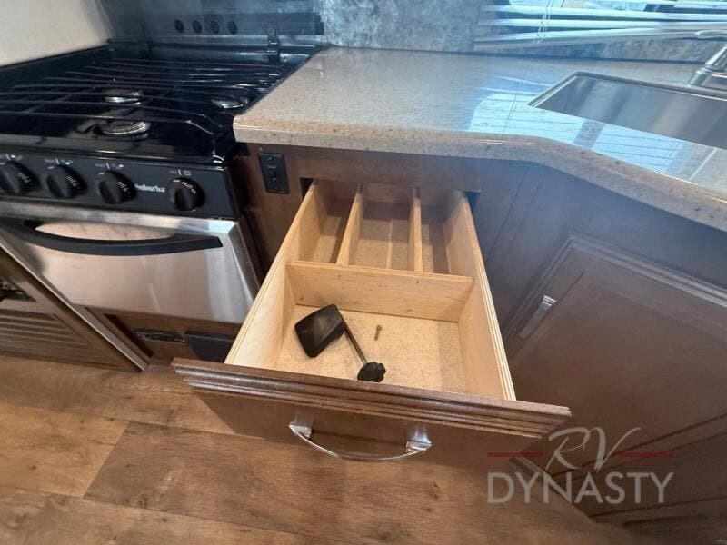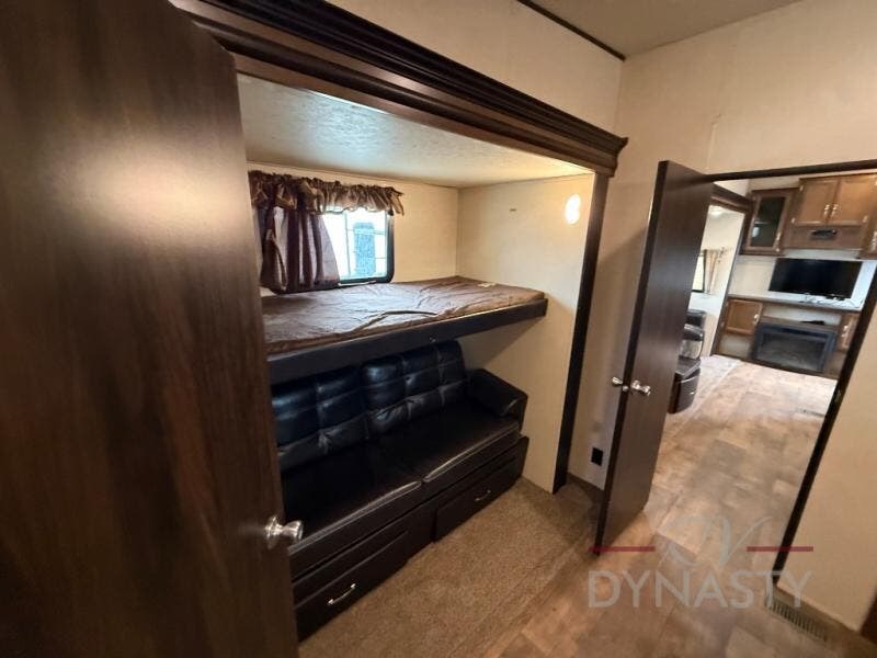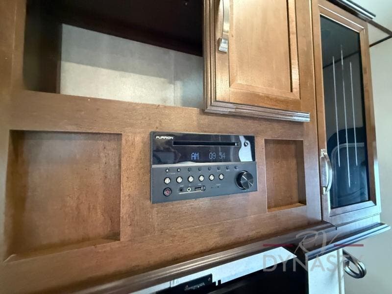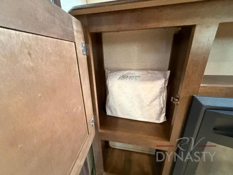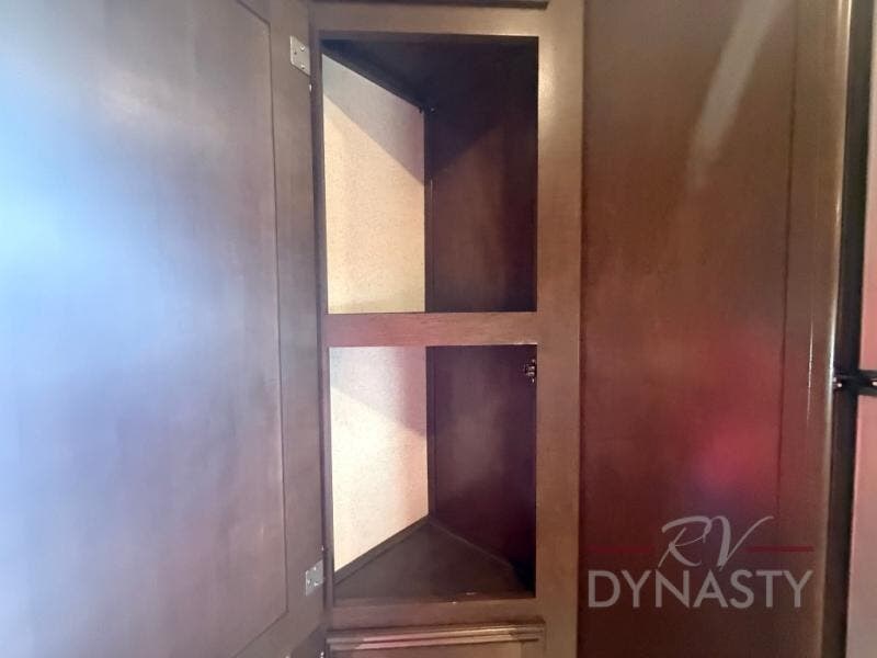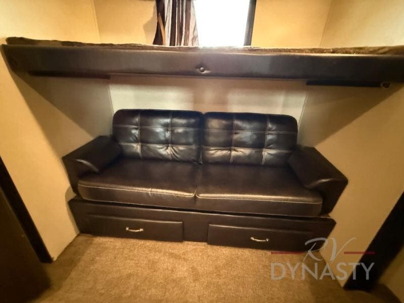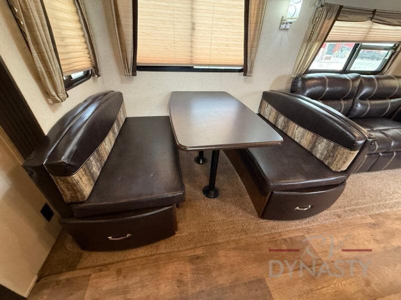 As you step inside the main entry to your left there is a pantry, refrigerator, three burner range, microwave, and a kitchen sink. On the opposite side of the fifth wheel you will find a slide out jumbo dinette and a tri-fold sofa. Next to the sofa you can enjoy relaxing while watching the entertainment center and fireplace. There are plenty of overhead cabinets in this combined kitchen and living area.