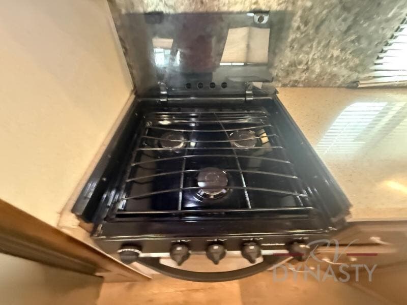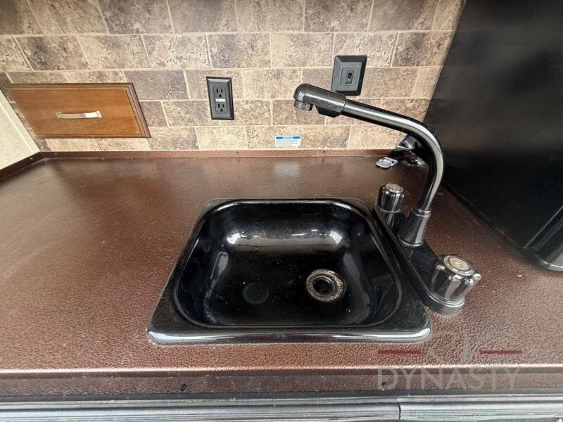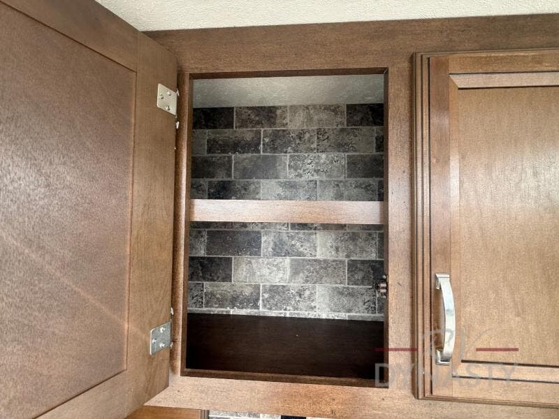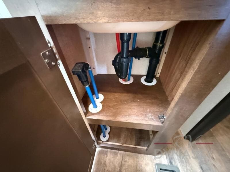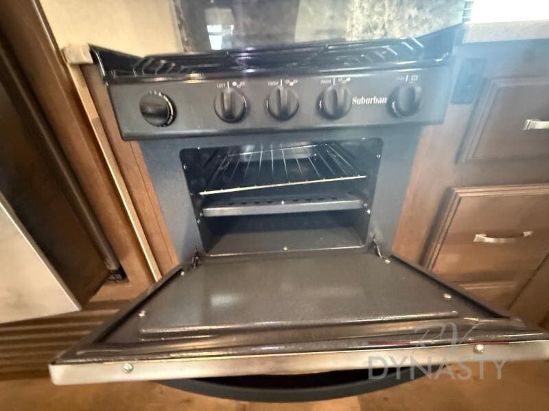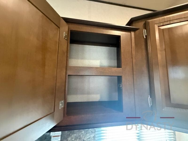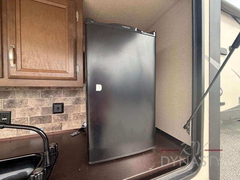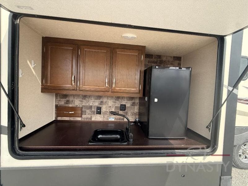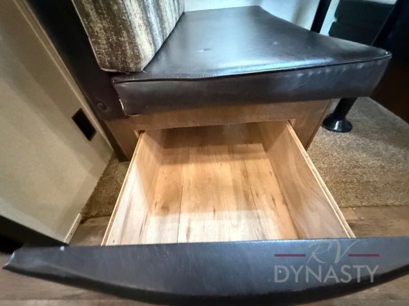 As you step inside the main entry to your left there is a pantry, refrigerator, three burner range, microwave, and a kitchen sink. On the opposite side of the fifth wheel you will find a slide out jumbo dinette and a tri-fold sofa. Next to the sofa you can enjoy relaxing while watching the entertainment center and fireplace. There are plenty of overhead cabinets in this combined kitchen and living area.