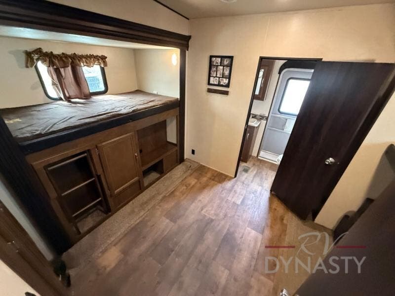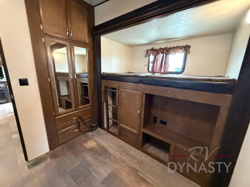 It's time to have "double" the fun in this Wildwood Heritage Glen 356QB fifth wheel by Forest River. There are TWO full baths including a residential tub/shower in the front bathroom, dual entry doors with a rare rear bathroom entry into the fifth wheel, a bunkhouse with twin beds, quad slide outs, plus a custom king bed in the master bedroom, and there is more!