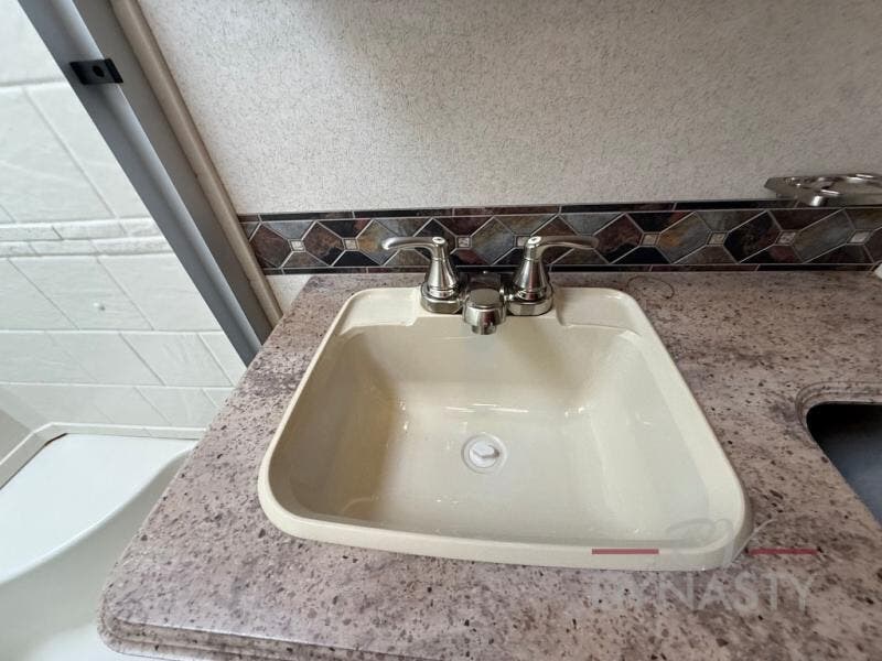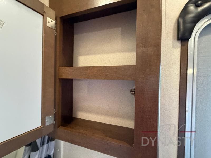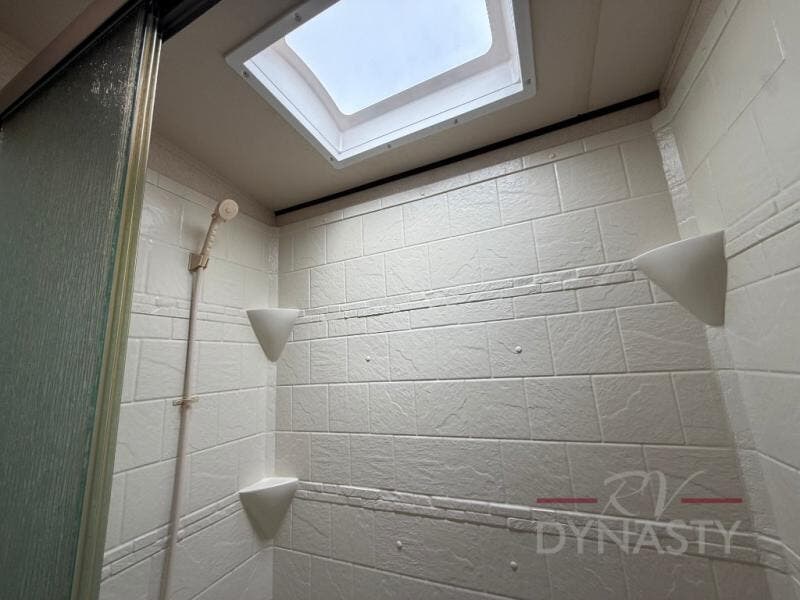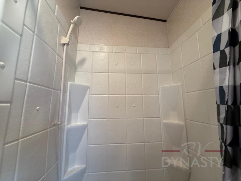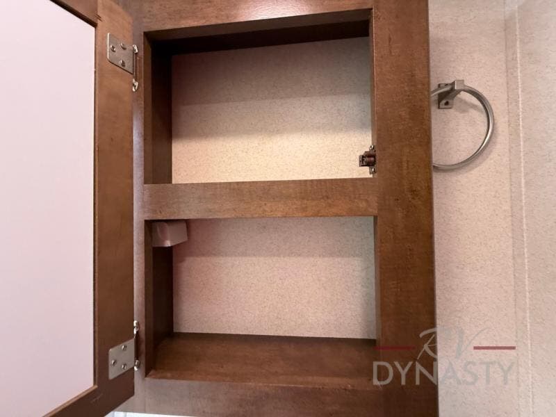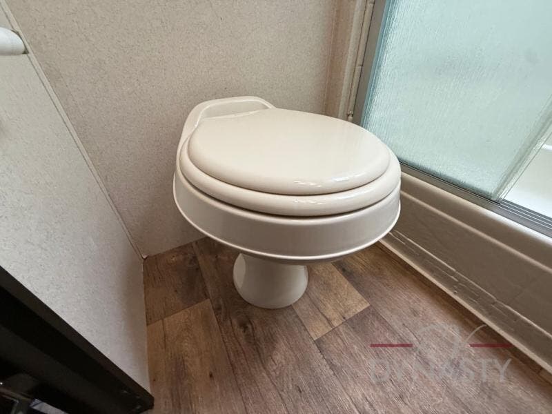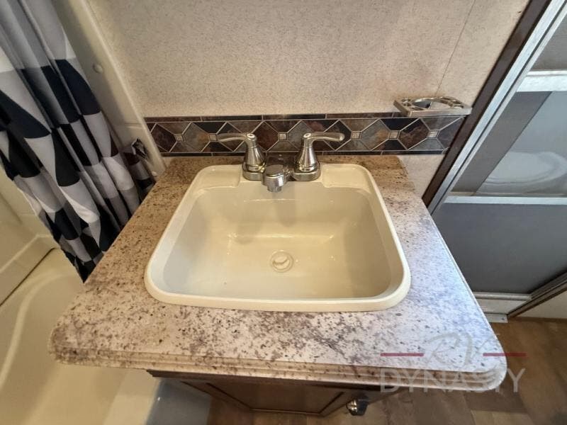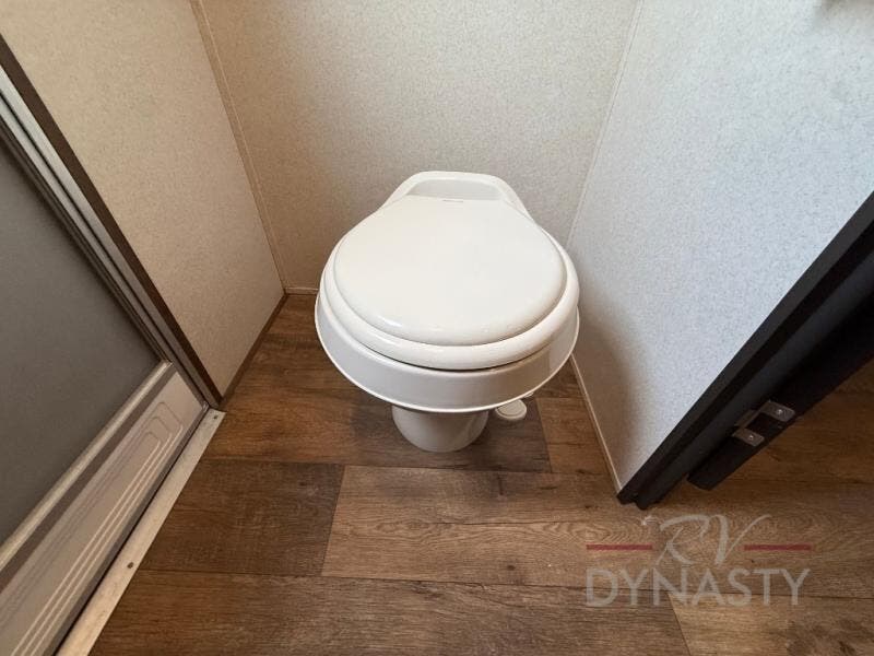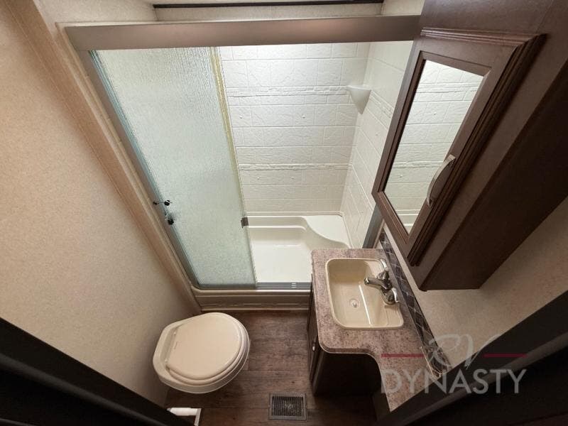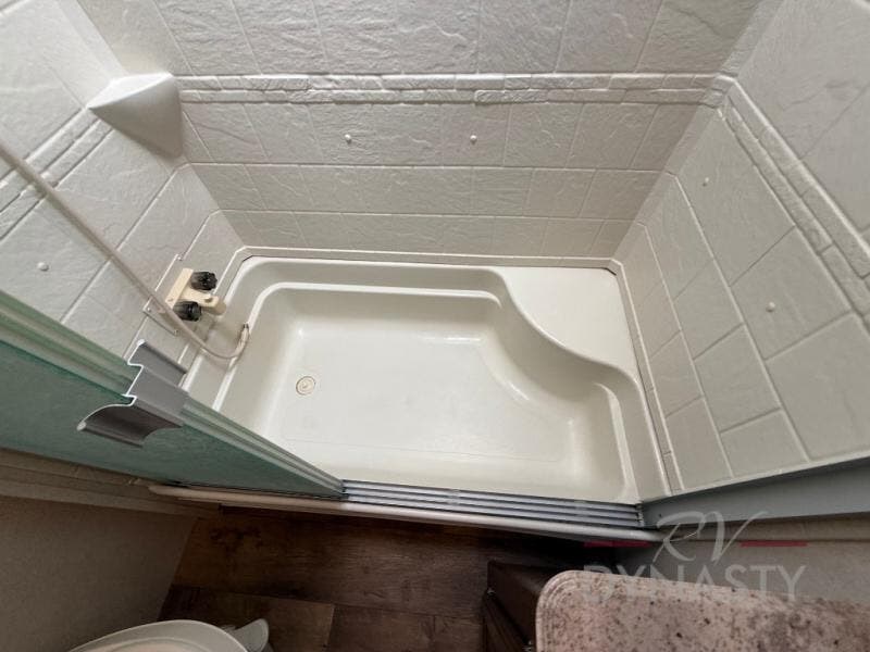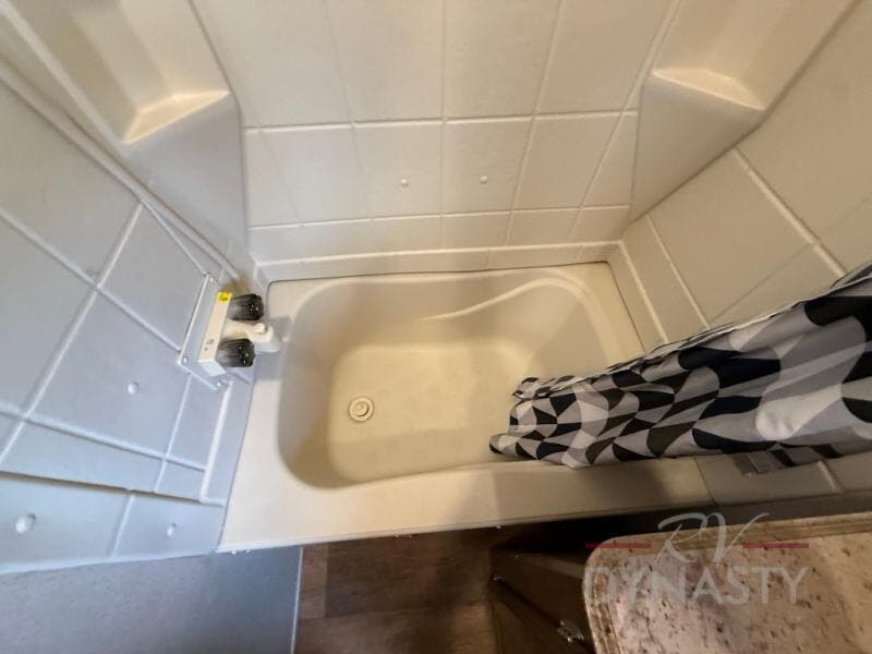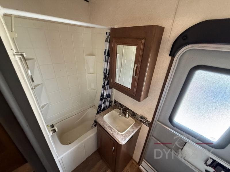 As you proceed through the front of the fifth wheel, and step up the stairs, the other full bathroom is on your left. Inside this bathroom you will find a residential tub/shower with seat, toilet, sink, and medicine cabinet.