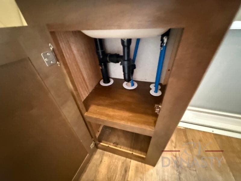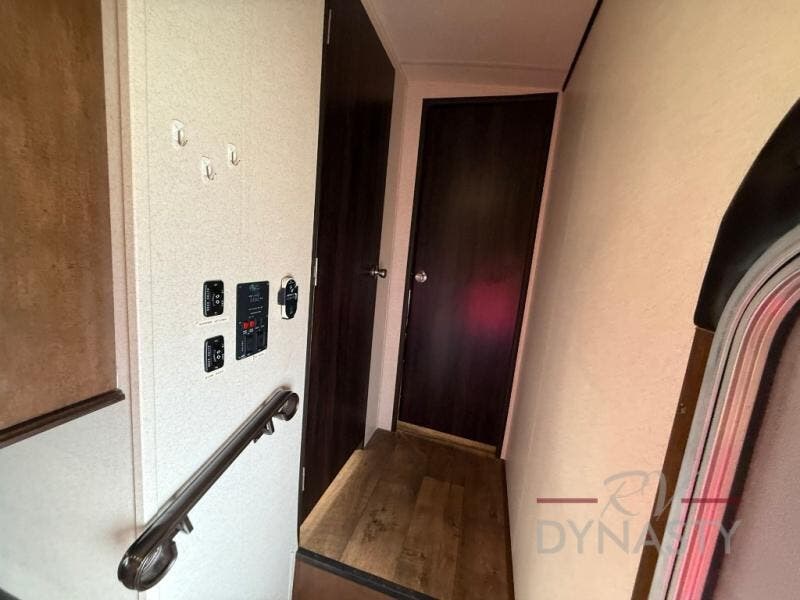 In the rear, you will find one of the full bathroom after you wall through the bunkhouse. There is a toilet, sink, medicine cabinet, and tub. There is also a rare rear entry door from the outside. This convenient entry allows for easy access to the bathroom or bunkhouse.