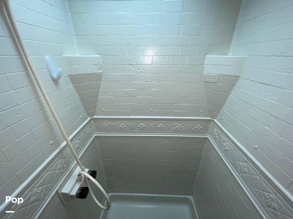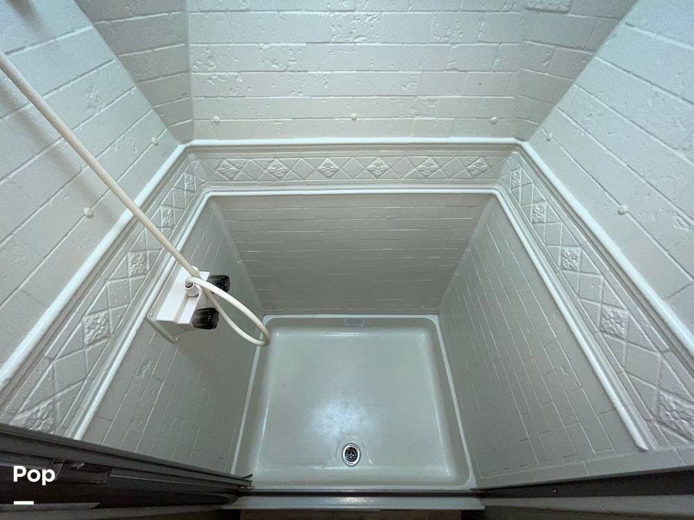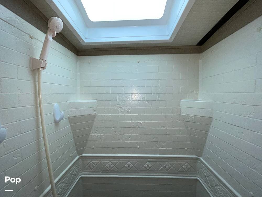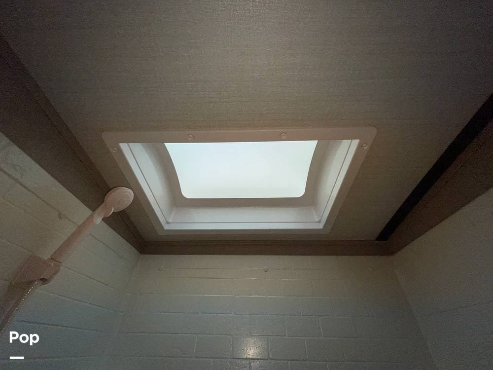 It is outfitted with a foot-flush toilet, a shower with a skylight, a vanity sink with medicine cabinet and a ceiling vent fan.