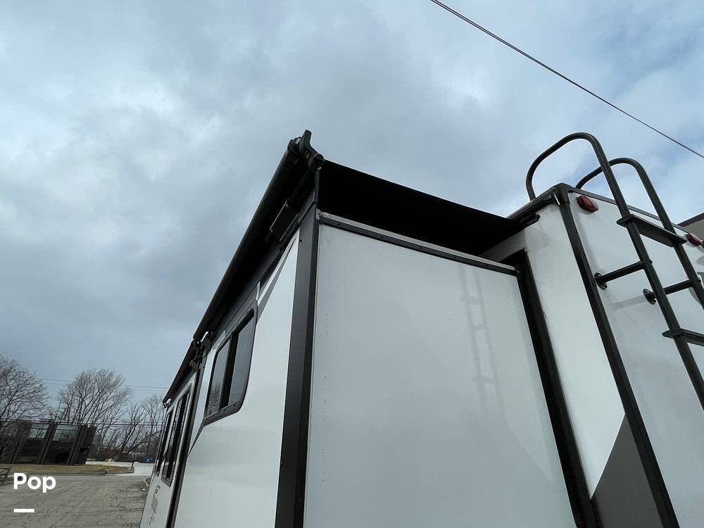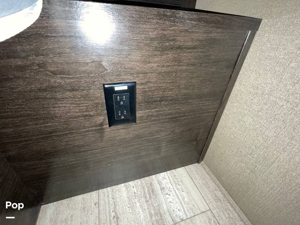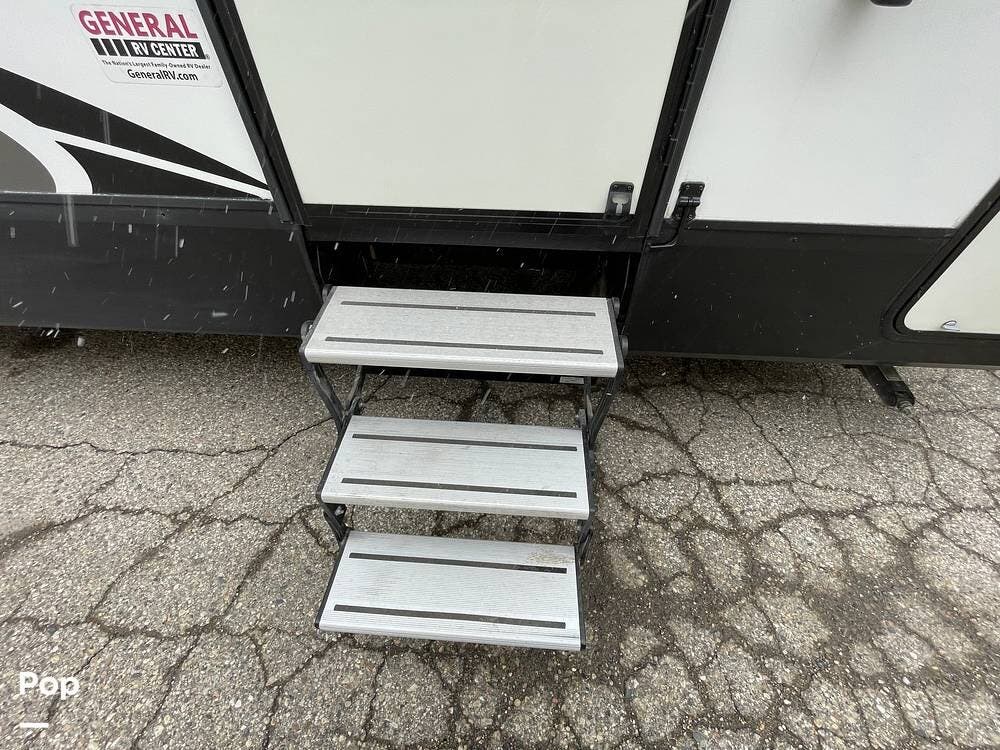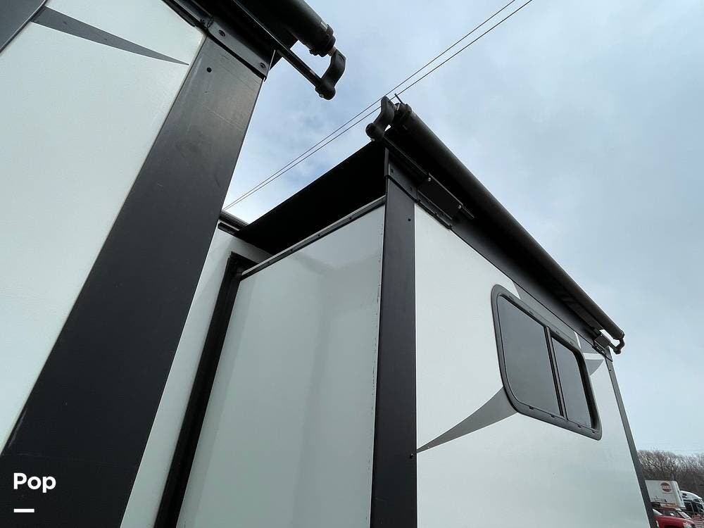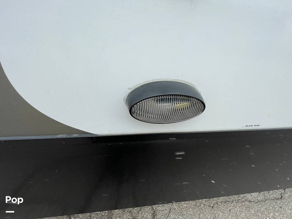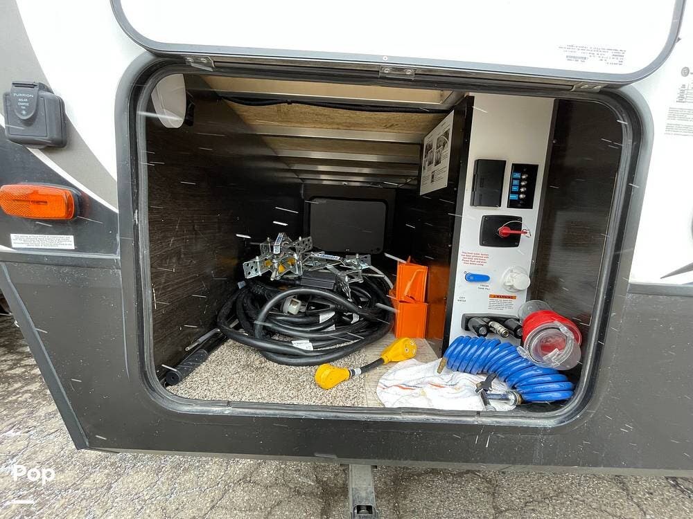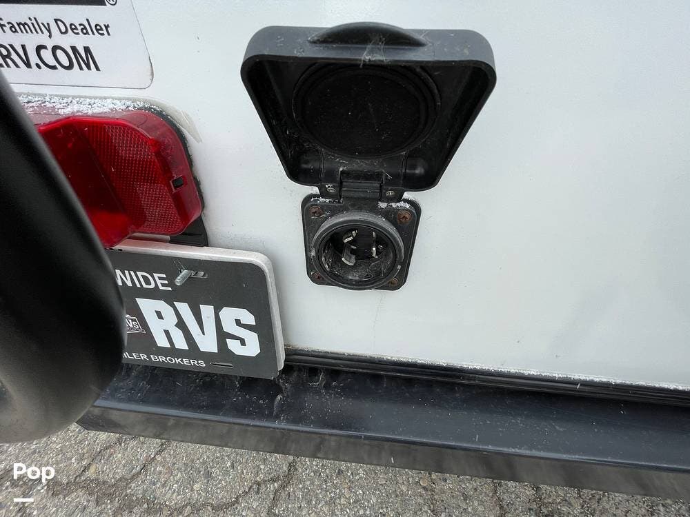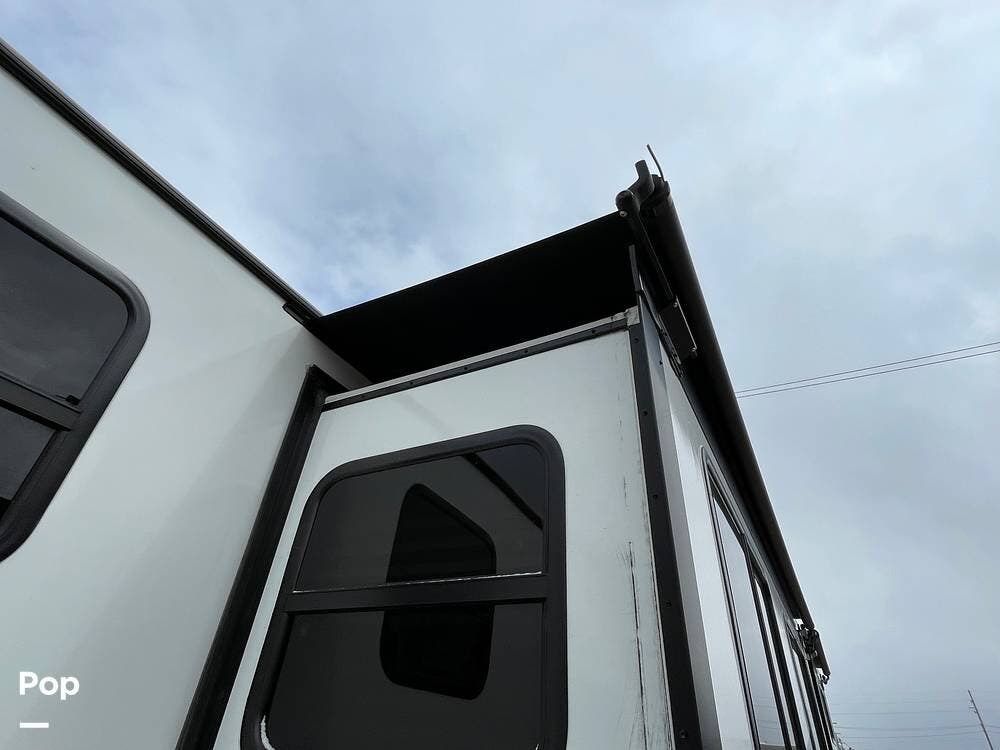 The exterior standards include a power awning with LED light stripping, a power tongue jack, black tank flush, and exterior speakers.