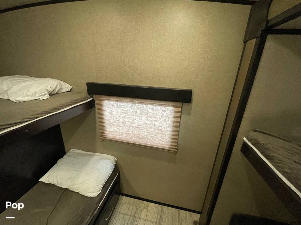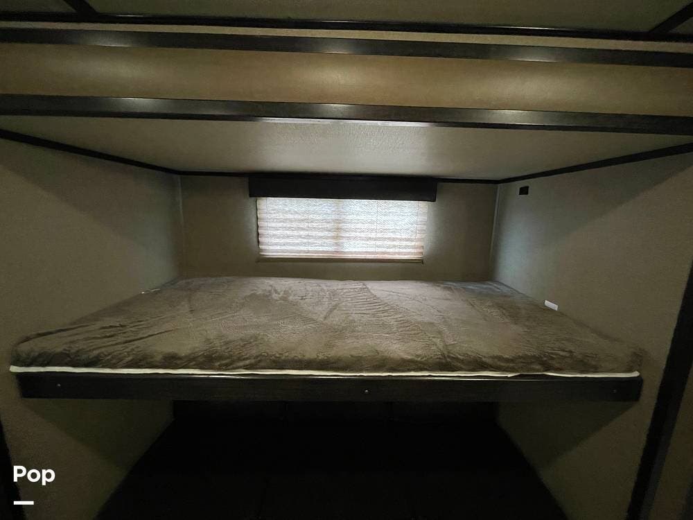 The bunkhouse is equipped with bunks on the left and right side of the RV.