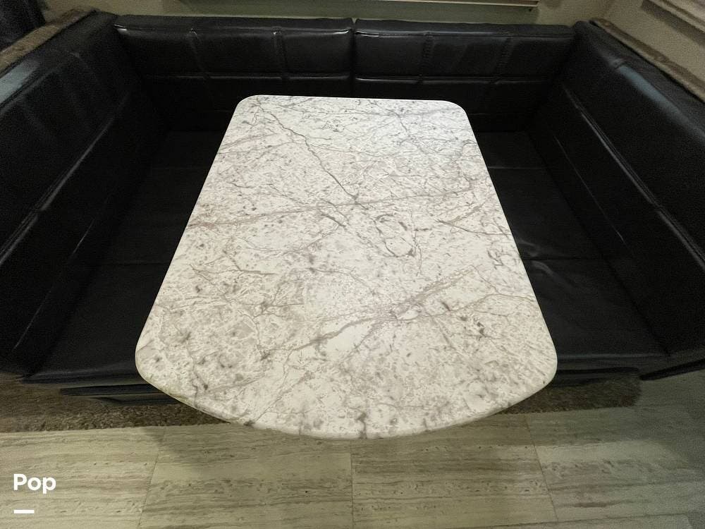An entertainment center with a LED TV faces a pair of theatre seats and the U-shaped dinette.