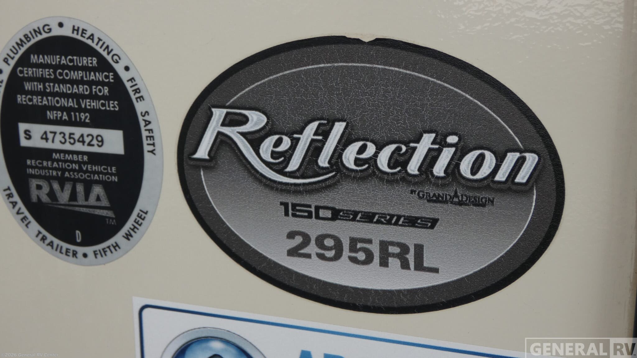 Grand Design Reflection 150 Series 295RL fifth wheel highlights: Kitchen Island Fireplace Tri-Fold Sofa Theatre Seating This Reflection 150 Series 295RL fifth wheel is the answer to your camping needs if you are a couple or family of five. You can be preparing the sack lunches on the kitchen island, while the kids are planning the adventure for the day. When the outside fun is over, the fireplace and 40" TV will provide a nice space for everyone to gather before bedtime. Then imagine yourself sleeping in a queen bed while the kids fold down the furniture in the living area for their own sleeping space. There is plenty of storage inside, and outside in the exterior unobstructed pass-through compartment for everyone's camping items, plus more. With any Reflection 150 Series fifth wheel by Grand Design you will enjoy the ease of towing behind a short bed half-ton truck thanks to the 90 degree turning radius swivel pin box. The Universal All-In-One docking station, LP Quick Connect, and One-Touch electric awning with LED light make setting up and packing up easy for those weekenders or full-timers that like to move around to see the countryside. Inside you will find the bedroom is complete with a panoramic window, queen bed, and plenty of storage for your clothes and such. The Arctic 4-Seasons Protection package allows you to camp anywhere and anytime of the year. Come choose your favorite model today!
