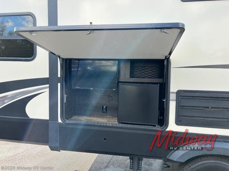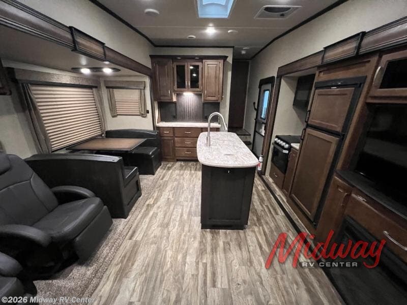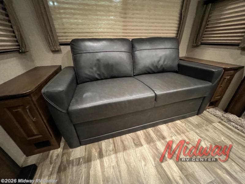 This Refection 29RS fifth wheel is perfect for a couple that enjoys traveling the countryside with their own accommodations including several luxury items just like at home. If you can imagine cooking in a gourmet kitchen with a center island and farm sink, plus watching a 40" TV with fireplace below then this model is for you. Your spouse may even be watching the TV from the theatre seats or napping on the tri-fold sofa. When it's time for bed, you can get cleaned up in the radius shower, and sleep on a queen bed. You will find plenty of storage throughout for your clothes, dry goods, games, and blankets, plus there is an exterior unobstructed pass-through compartment that allows you to store larger items. It's time to get moving and start living the dream!