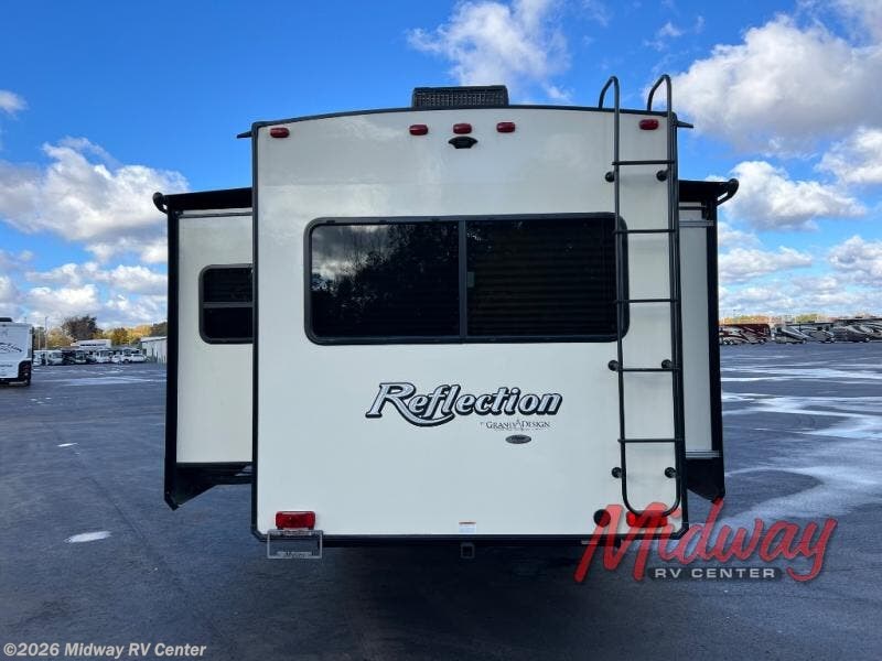 The Reflection by Grand Design offers luxury along with providing easy towing with the aerodynamic front cap with Max Turn radius to your favorite destinations. The Universal All-In-One docking station, LP Quick Connect, and One-Touch electric awning with LED light make setting up and packing up easy for those weekenders or full-timers that like to move around. Inside you will find the bedroom is complete with a pillowtop queen mattress, king size wardrobe, oversized underbed storage, and much more! The Arctic 4-Seasons Protection package allows you to camp anywhere and anytime of the year. Come choose your favorite model today!