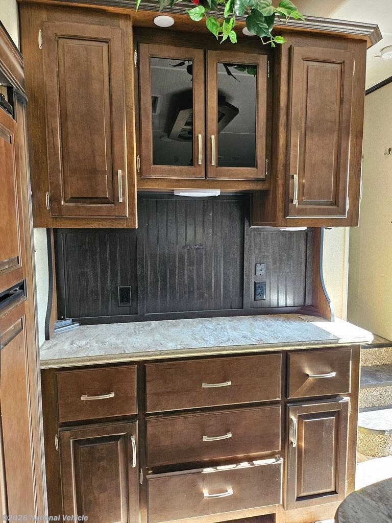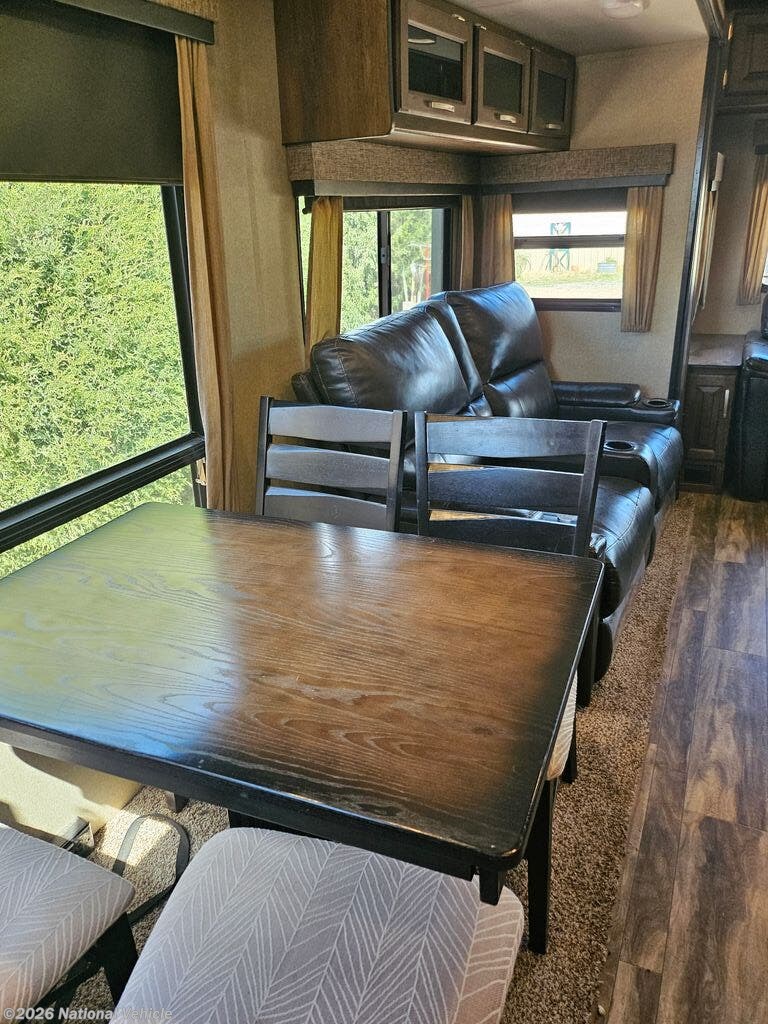 Step inside and you?re welcomed by a beautifully designed rear living area featuring opposing slide-outs that create an open, inviting space. Relax in the theater seating or on the tri-fold sleeper sofa while enjoying the entertainment center with fireplace, or gather around the free-standing dinette with 4 chairs for meals, work, or entertaining. Large panoramic windows bring in plenty of natural light, giving the interior a bright and comfortable atmosphere.