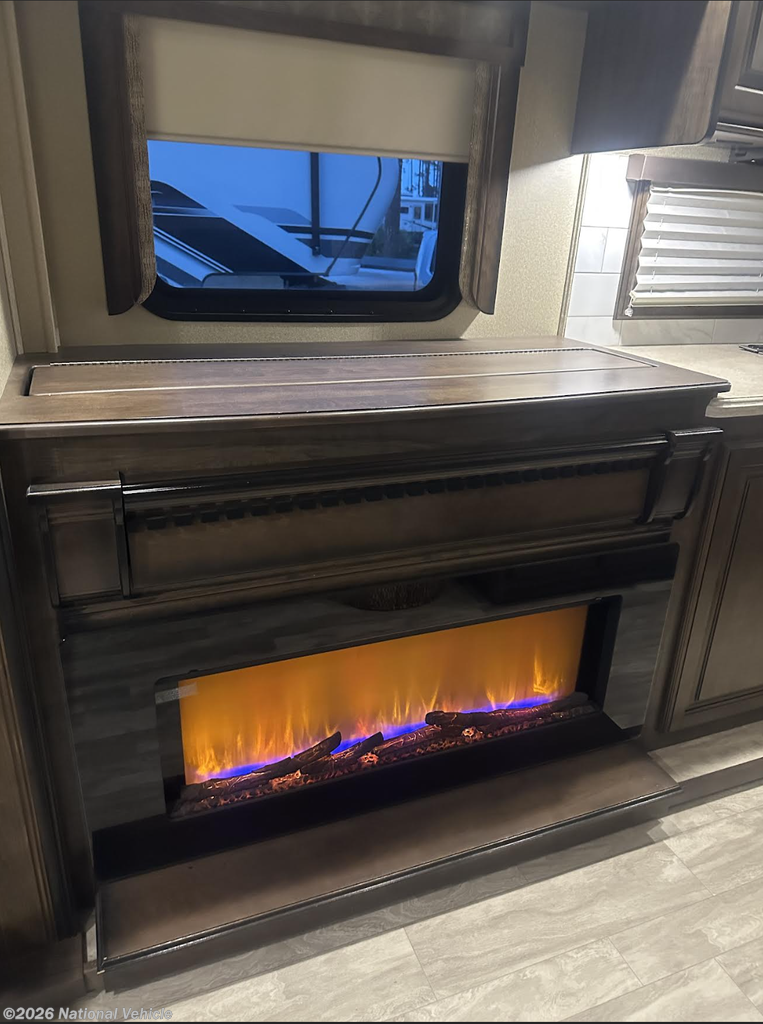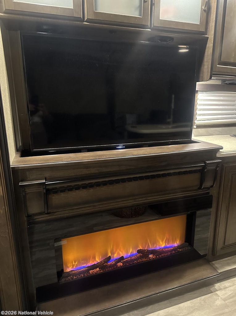 Inside, the open rear-living floorplan feels bright and expansive, anchored by a residential kitchen island and 18 cu. ft. residential-size refrigerator. The gas oven has never been used, and the space is climate-controlled by dual 15,000 BTU A/C units, with the living-room HVAC replaced just one year ago, paired with a powerful 35,000 BTU furnace for true four-season comfort.