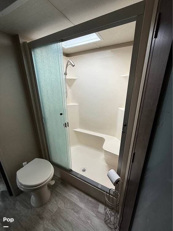 Comfort features include a washer and dryer, unlimited hot water, porcelain toilet, shower with skylight, ceiling vents, and a 15,000 BTU AC. Outside, you get automatic leveling, exterior storage and speakers