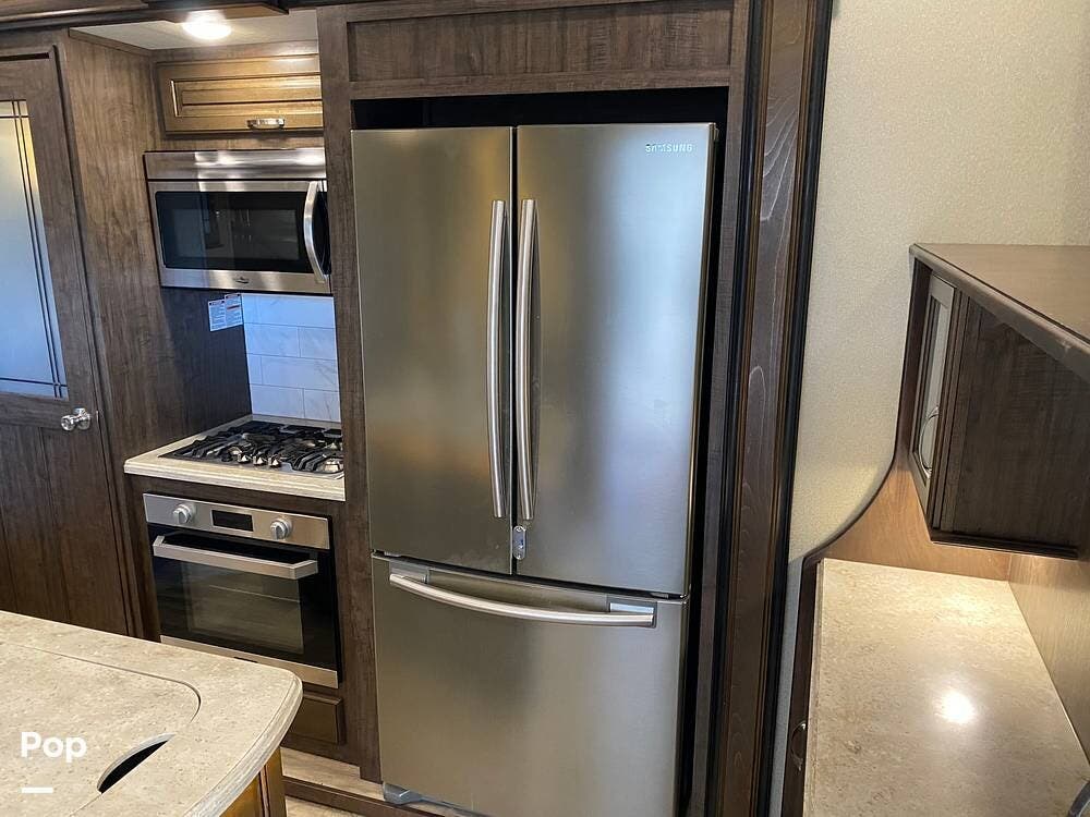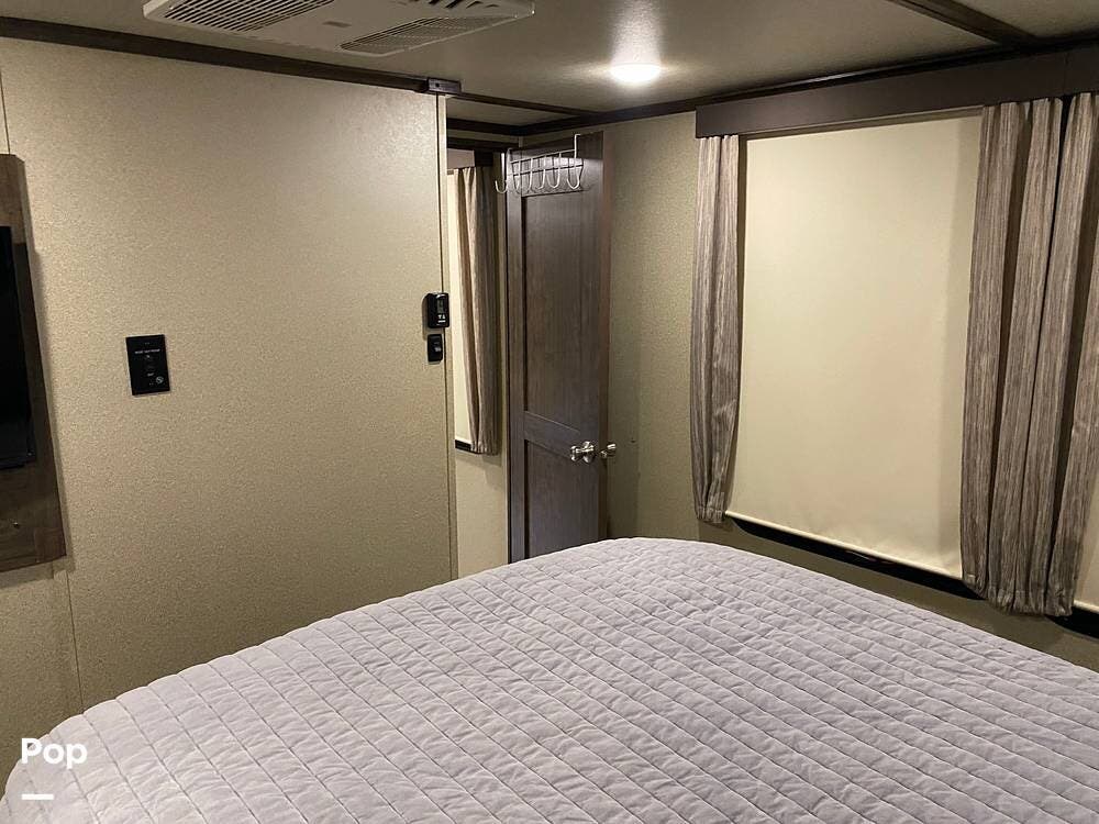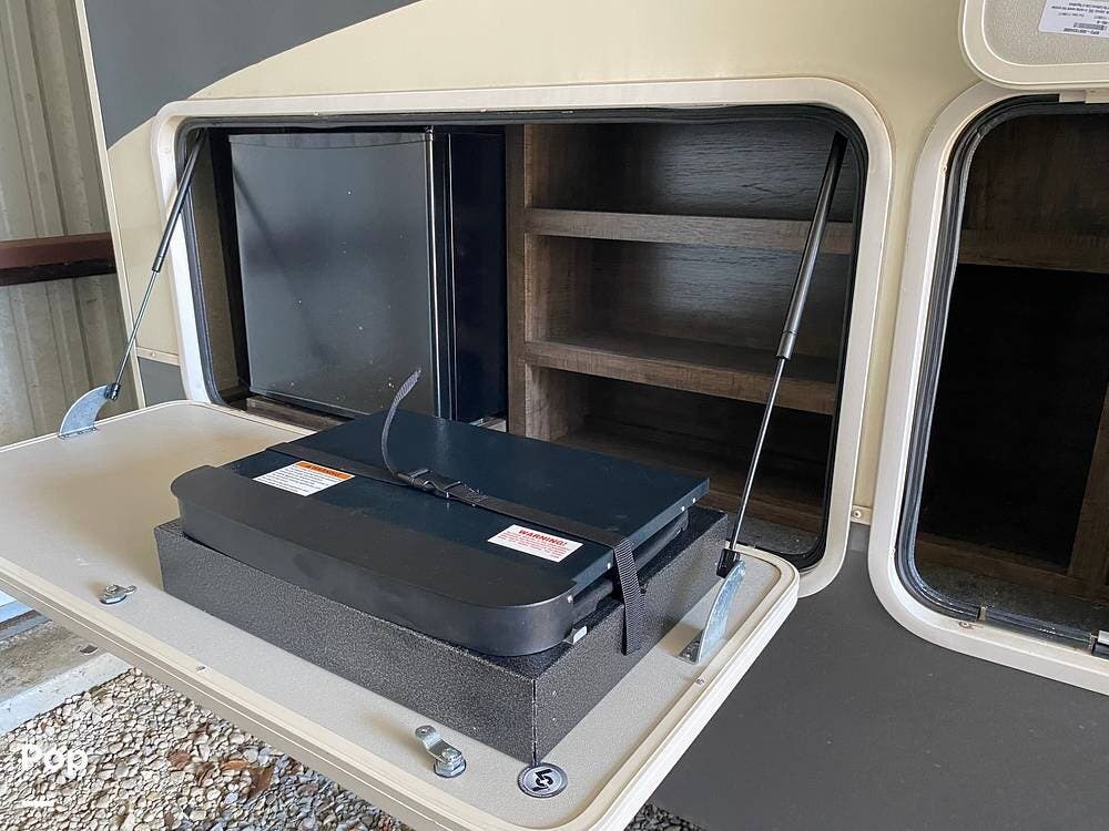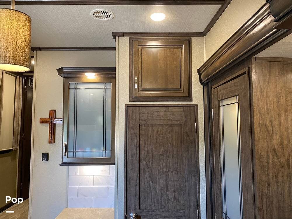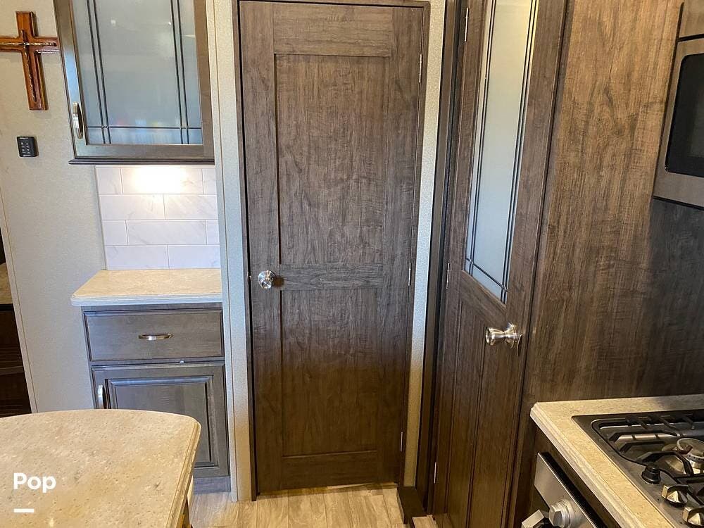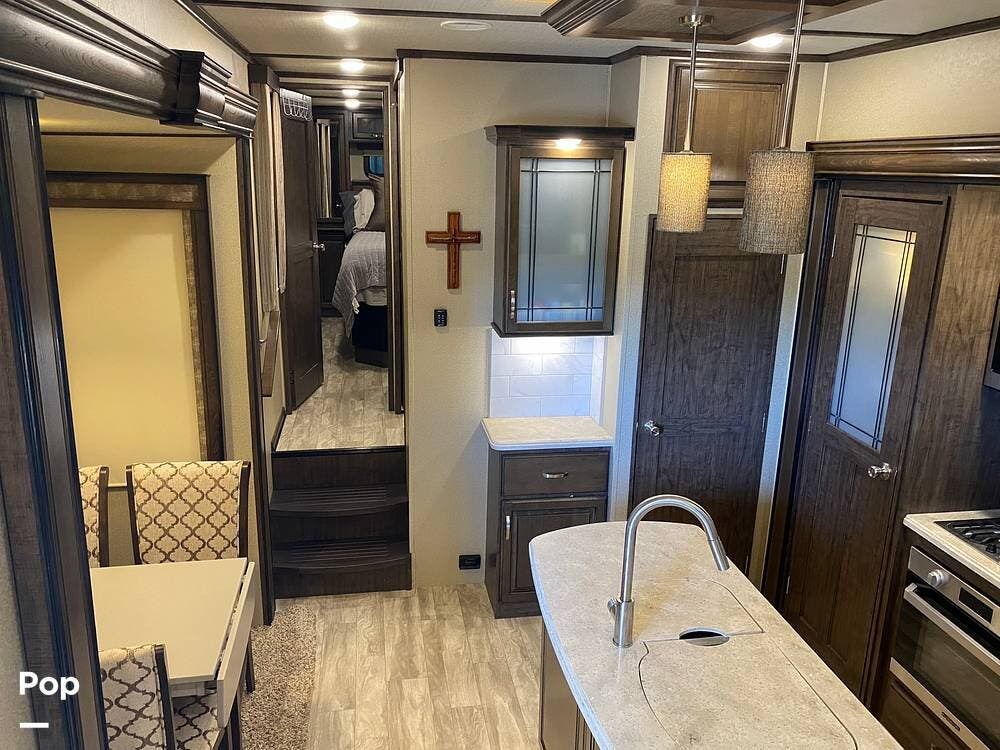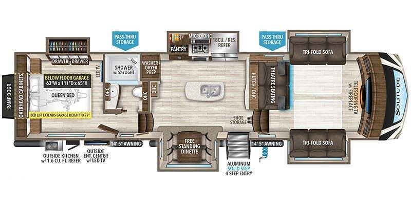 This 2018 Solitude 374TH by Grand Design is not your typical fifth-wheel toy hauler. The garage area cannot be accessed through the interior of the RV. It is only accessible when the RV's rear door is let down.