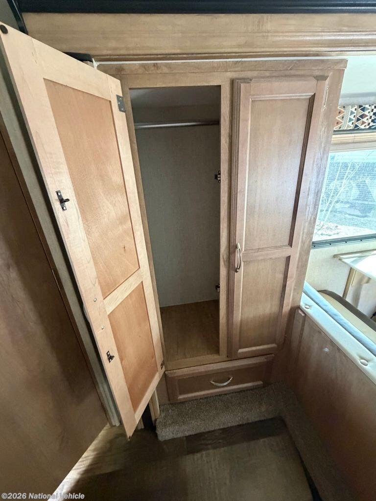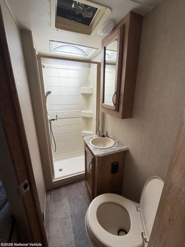 A well-located bathroom with shower, toilet, and sink keeps convenience front and center. Throughout the motorhome, thoughtful storage compartments help keep gear organized and accessible.