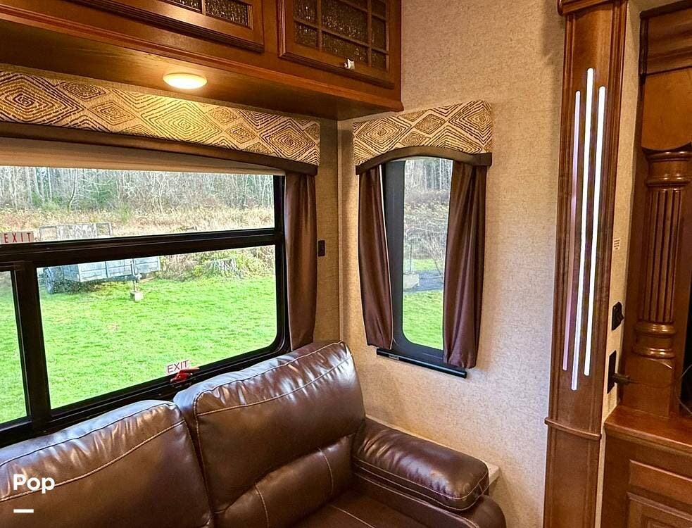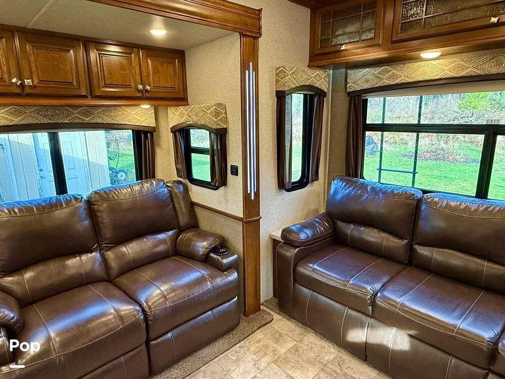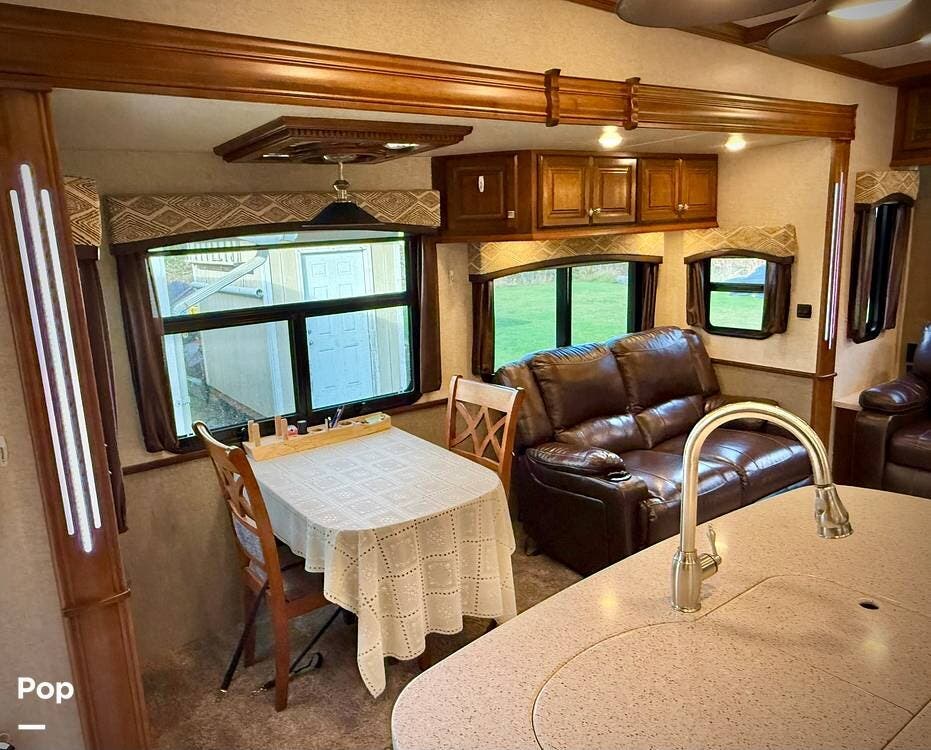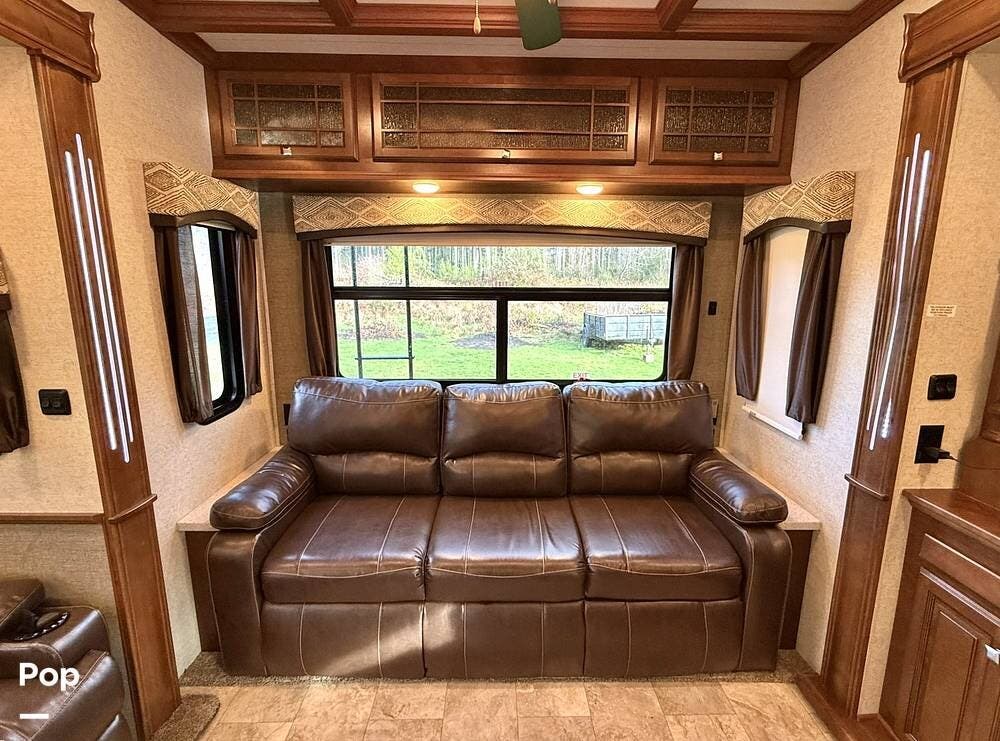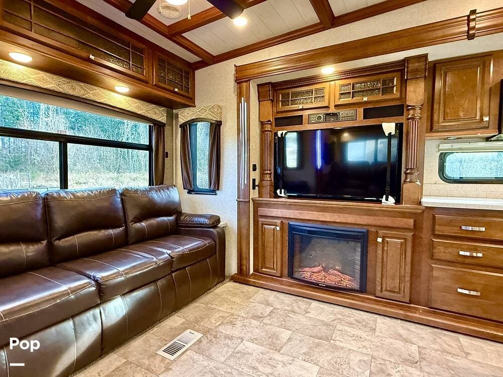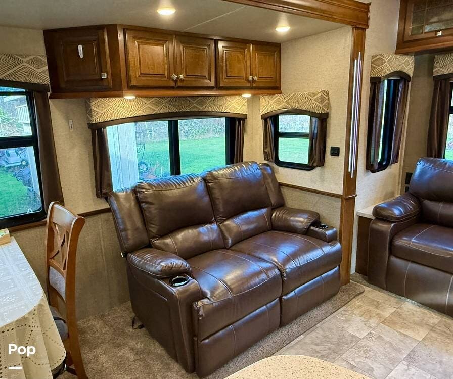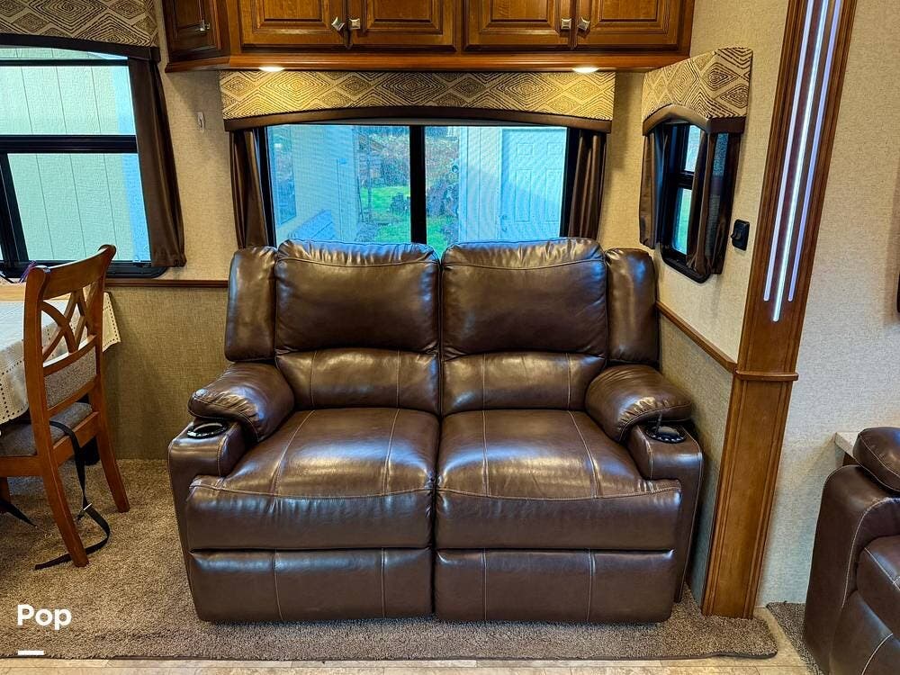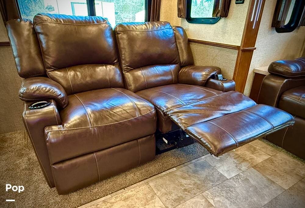Step inside and you're welcomed by an inviting living area designed for relaxation and entertaining. The leather loveseat features electric recline controls, heat, and massage, while the upgraded flip-and-fold sleeper sofa provides additional sleeping space for guests. Abundant storage, LED accent lighting, day/night roller shades, and a ceiling fan enhance both comfort and ambiance, creating a warm, upscale living environment.
