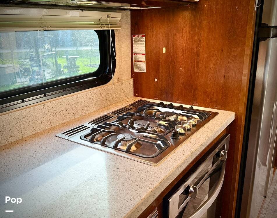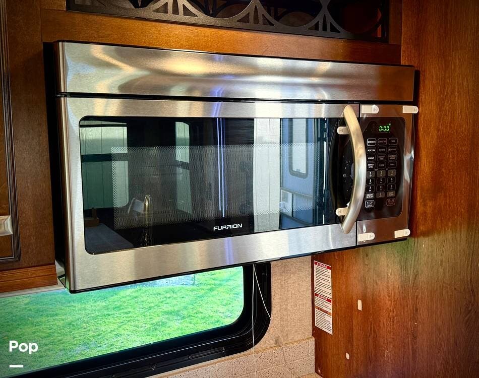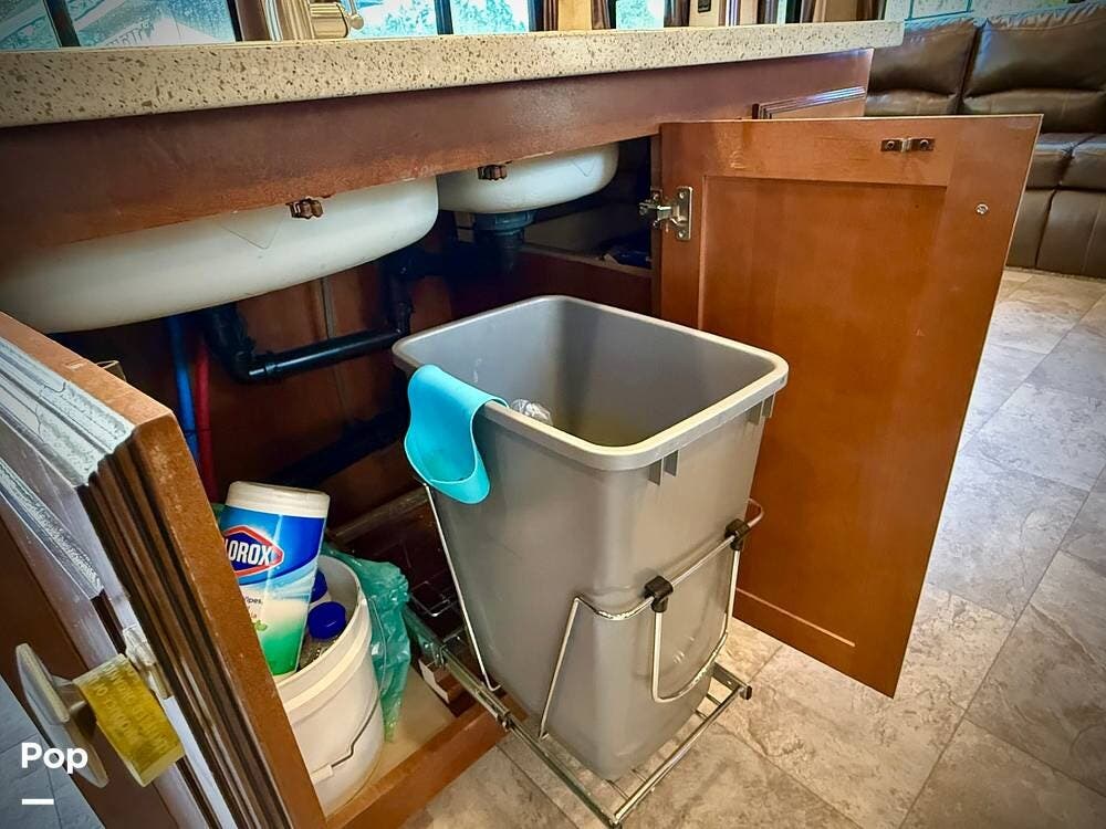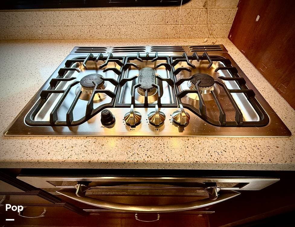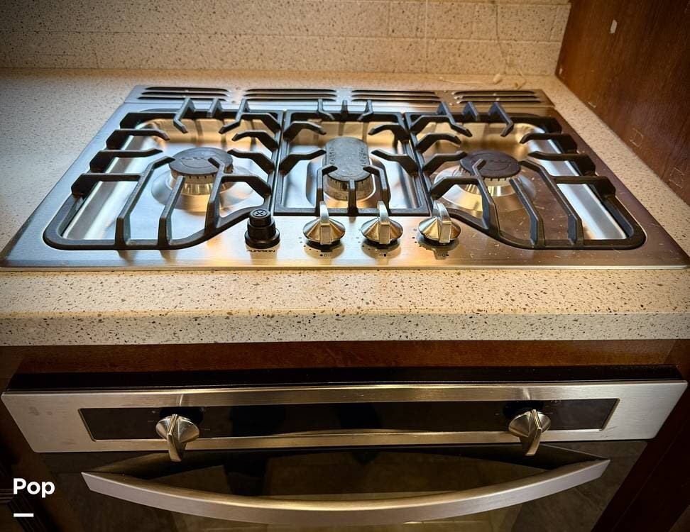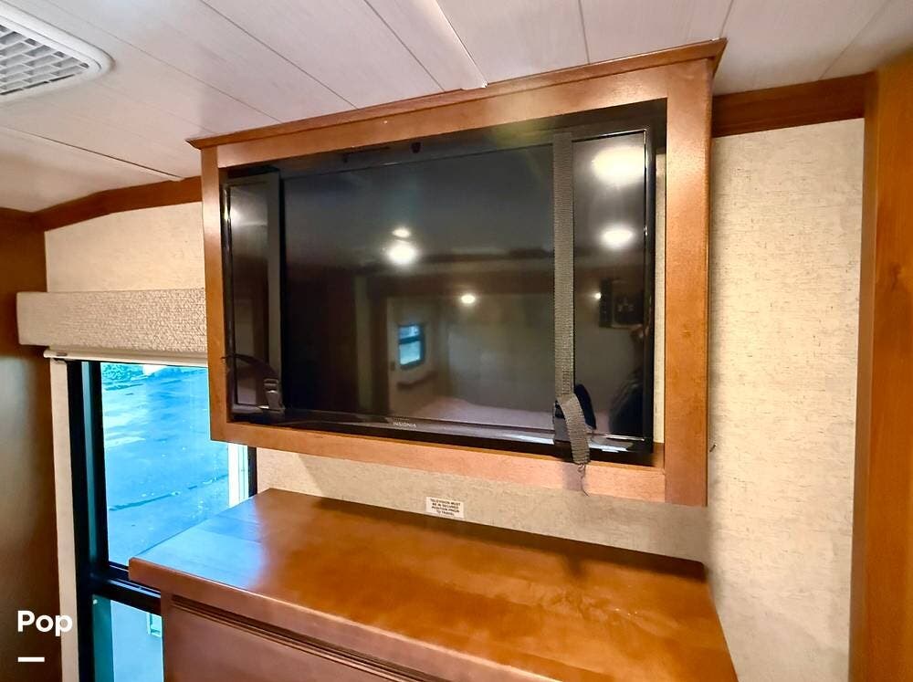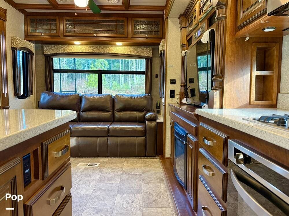 Step inside and you're welcomed by an inviting living area designed for relaxation and entertaining. The leather loveseat features electric recline controls, heat, and massage, while the upgraded flip-and-fold sleeper sofa provides additional sleeping space for guests. Abundant storage, LED accent lighting, day/night roller shades, and a ceiling fan enhance both comfort and ambiance, creating a warm, upscale living environment.