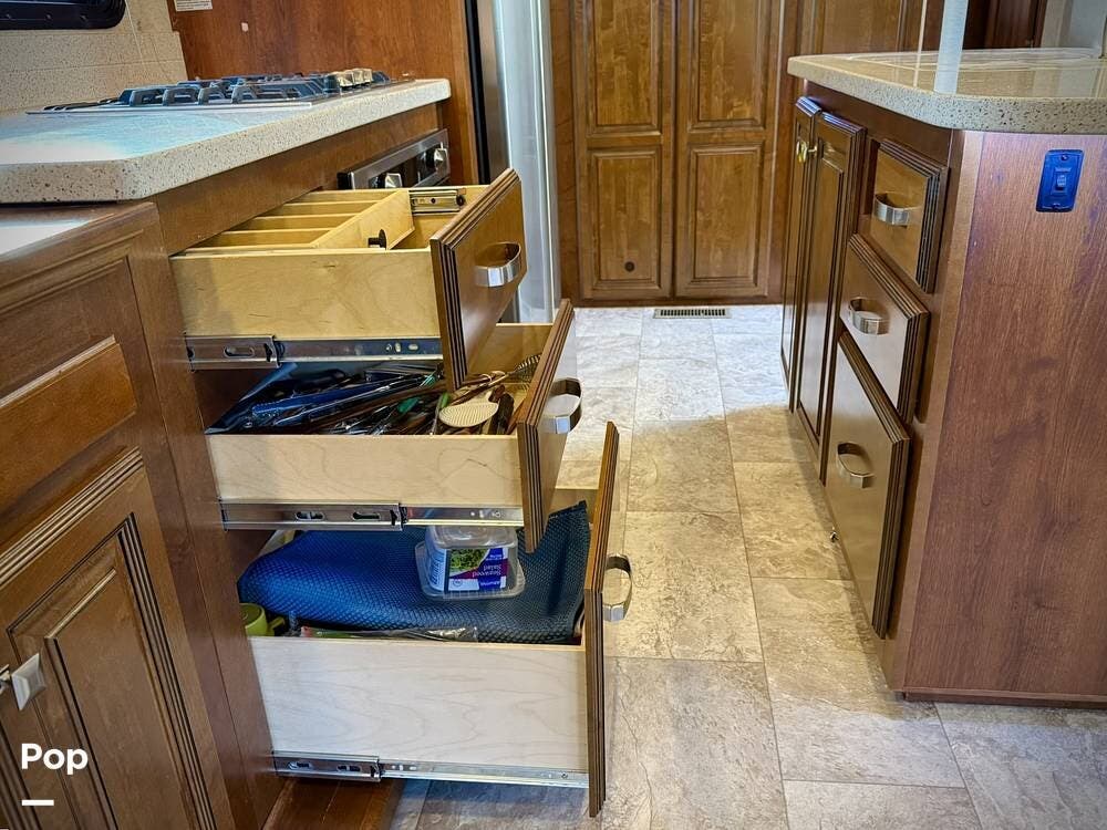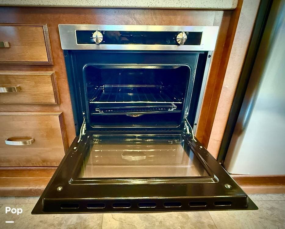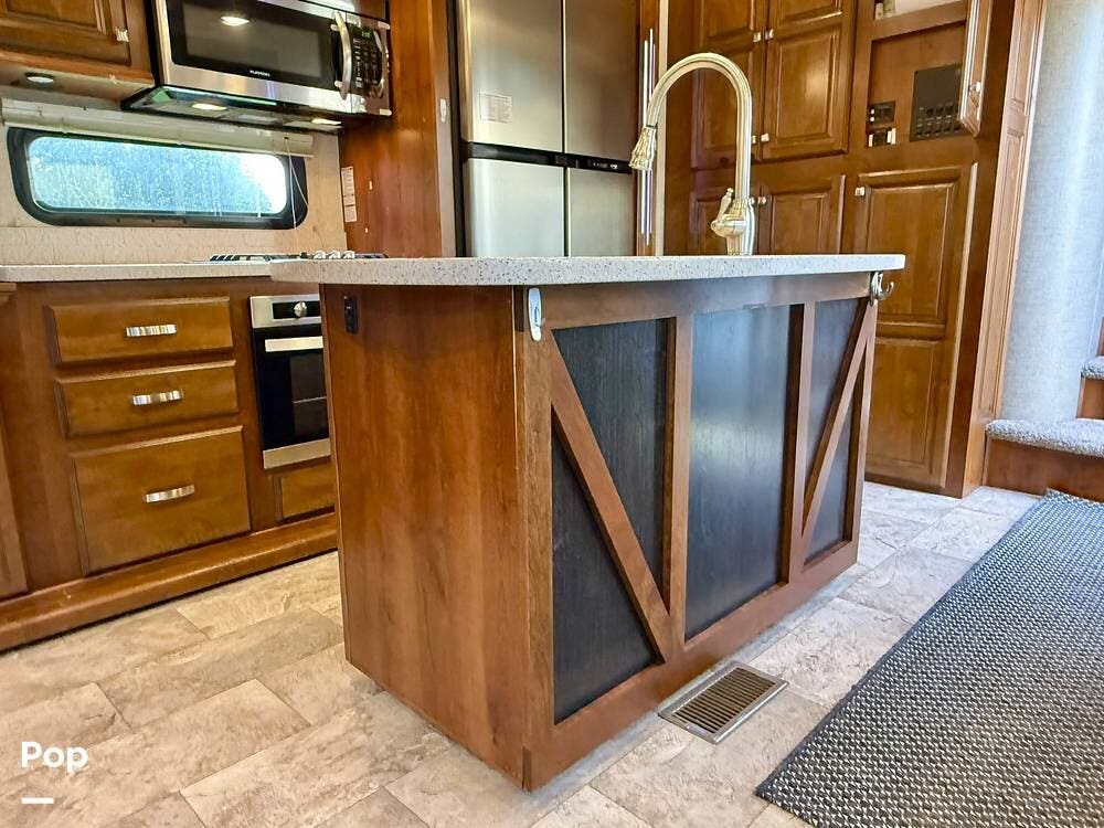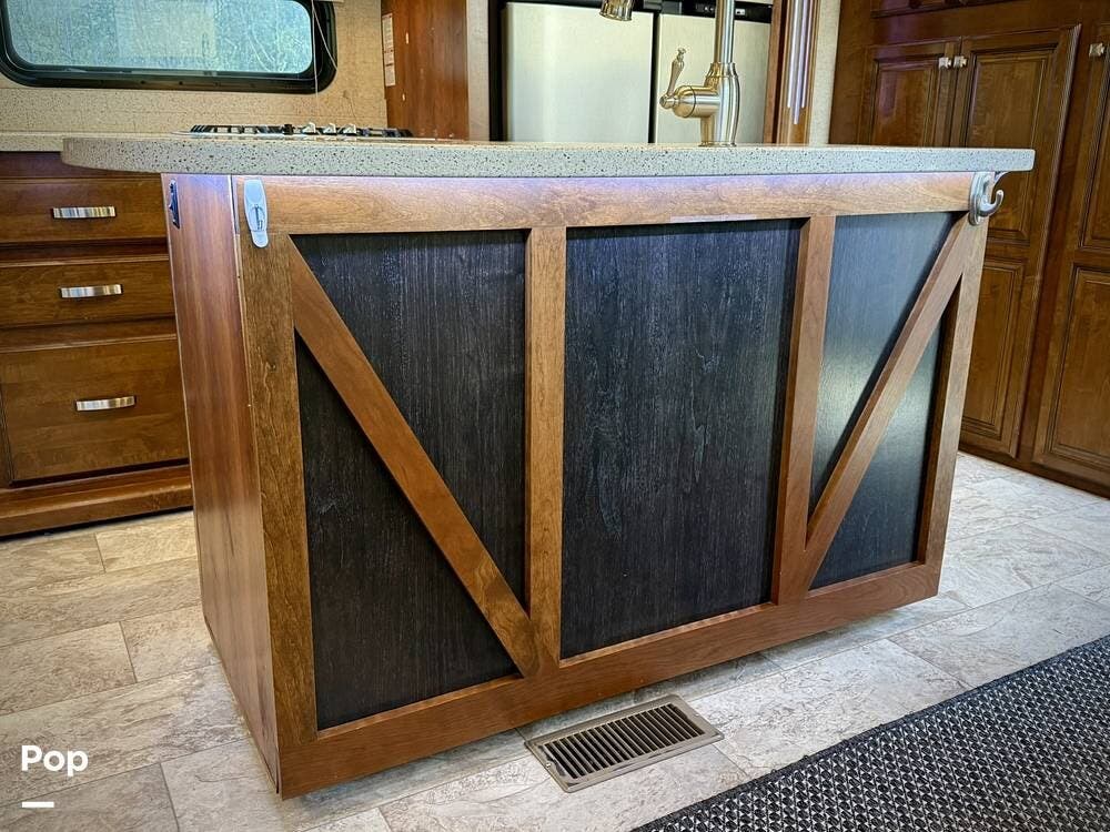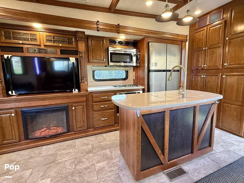 Throughout the coach, Heartland's renowned hand-crafted cabinetry stands out with glazed hardwood finishes, Amish-crafted natural hardwood doors, real wood drawer construction, and ball-bearing drawer guides, all screwed together rather than stapled for long-term durability. The all-in-one master control panel makes managing systems simple, from tank monitoring to slide and lighting controls.