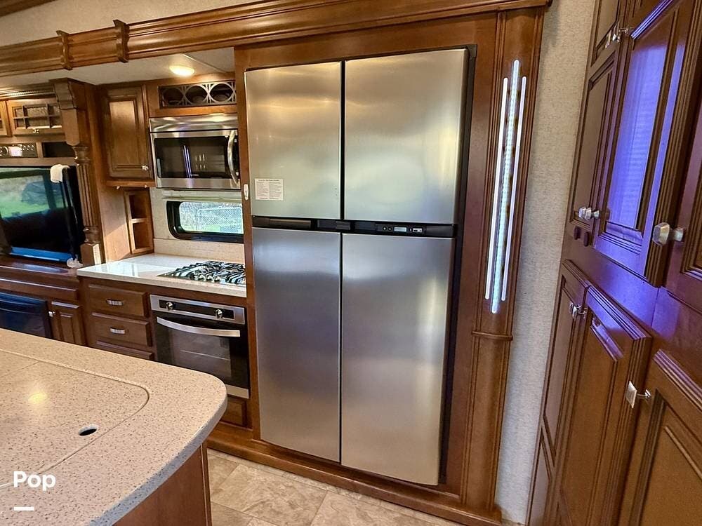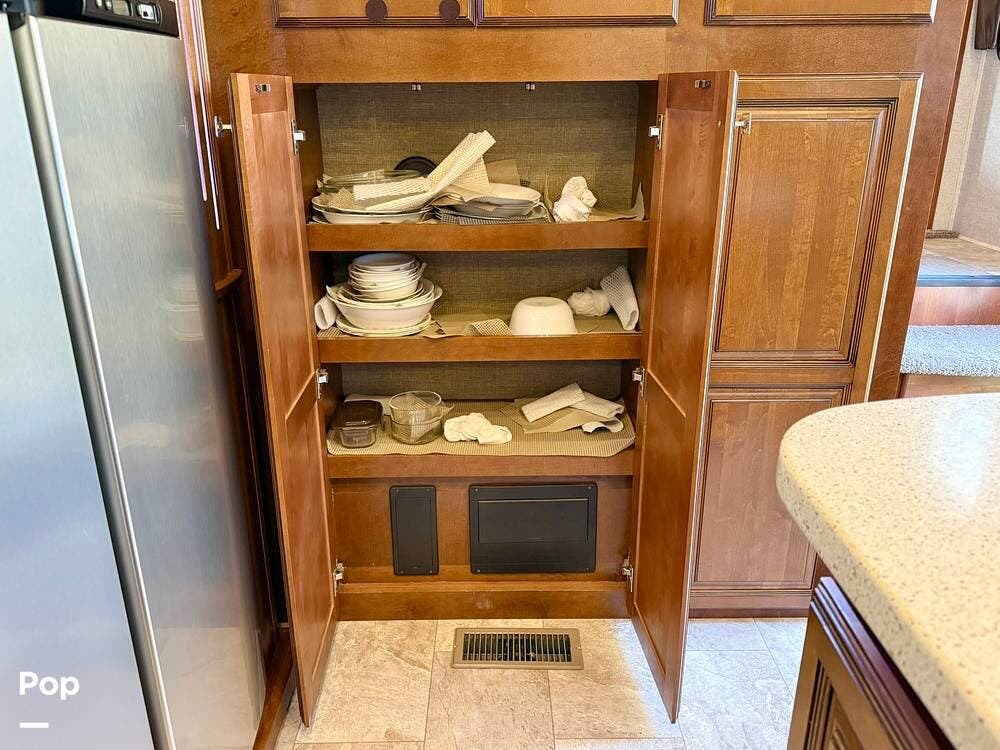 The kitchen is truly residential in feel, highlighted by a residential-size double-door refrigerator, modern, stylish appliances, solid-surface countertops, and a deep, stainless-steel sink with matching covers. Generous counter space, large drawers, residential-sized cabinets, toe kicks, and a deep pantry make meal preparation and storage effortless. Recessed LED lighting and durable residential flooring tie the space together with both form and function in mind.