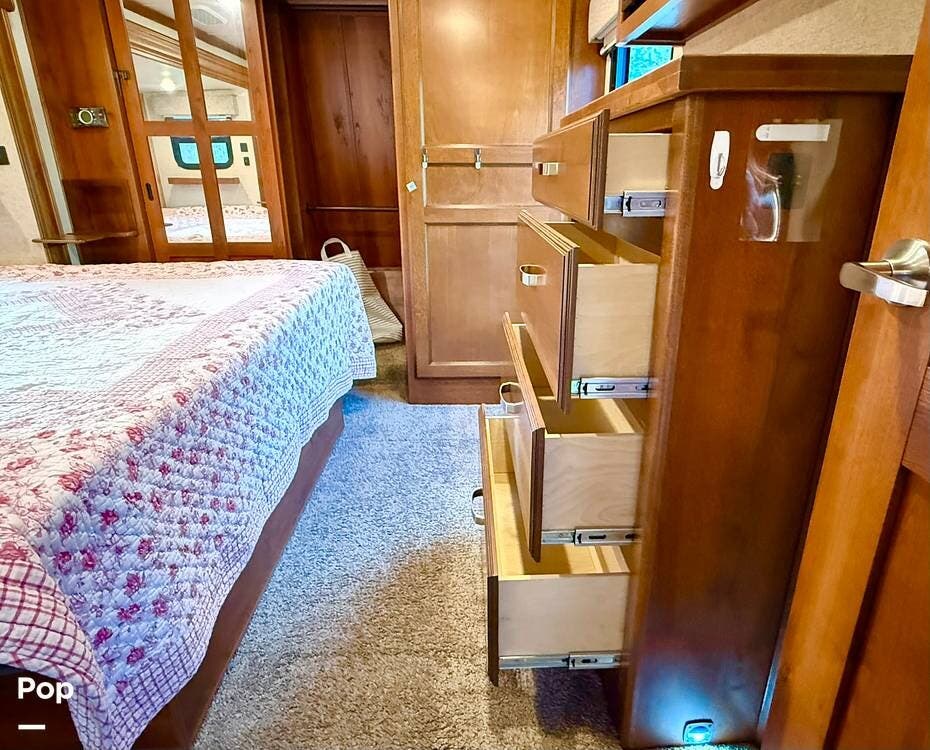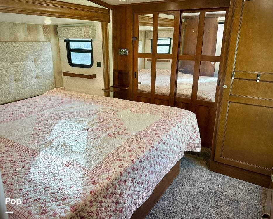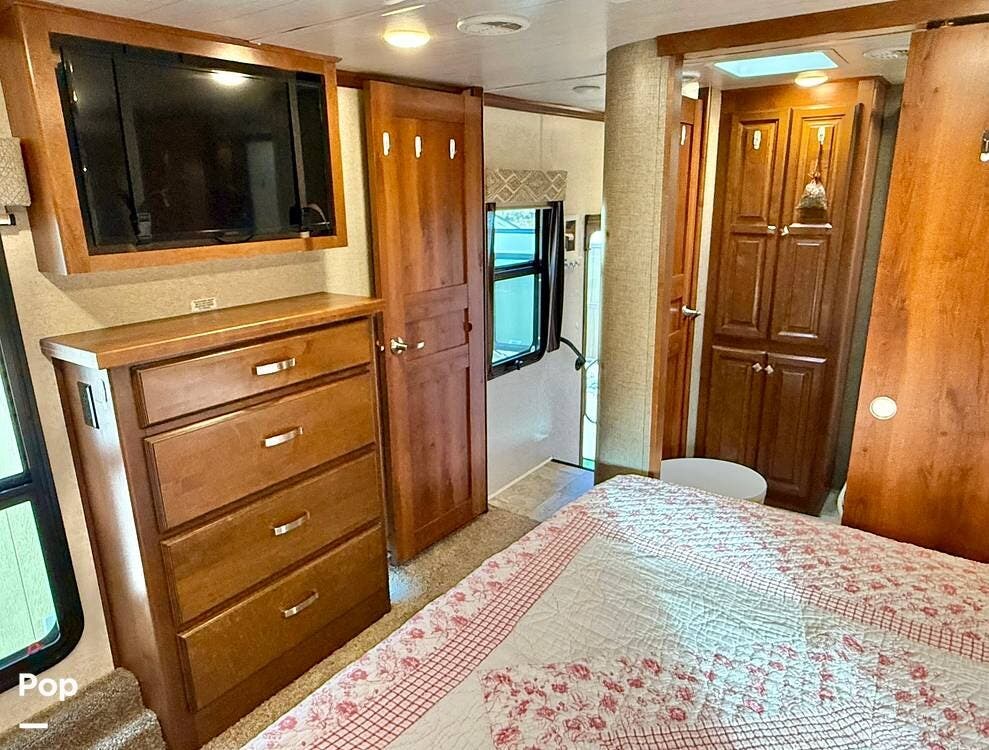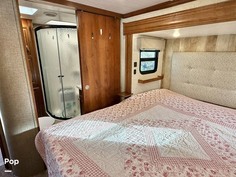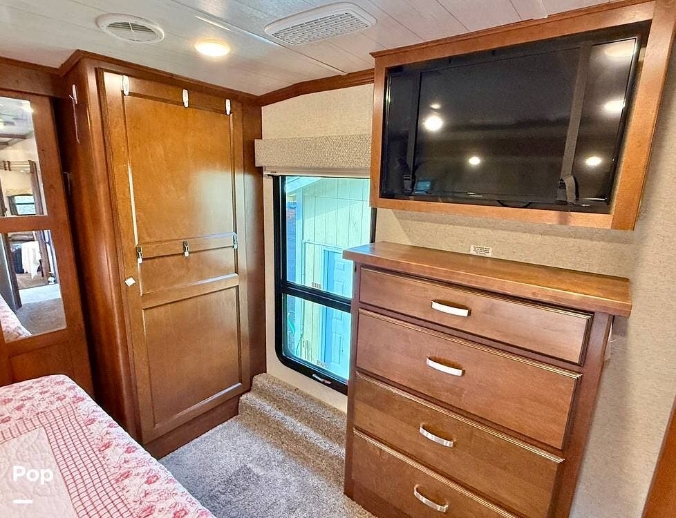 Retreat to the private master bedroom where comfort takes center stage. A king-size bed with a memory foam mattress, deluxe headboard, coordinated bedding package, and LED lighting creates a cozy haven at the end of the day. The bedroom offers excellent airflow thanks to dual windows in the slide, ample closet storage with hanging rods and shelving, massive under-bed storage, and even a pull-out drawer in the steps. A television and full-height ceilings add to the open, residential feel, while the adjacent private bathroom provides convenience and privacy.