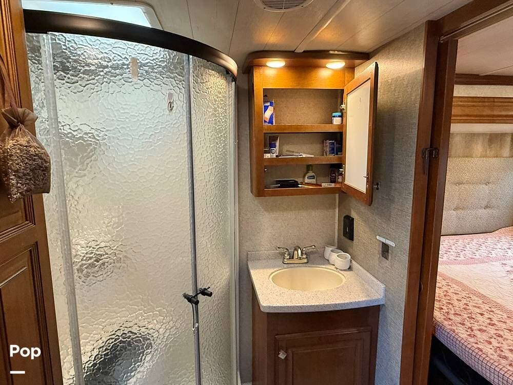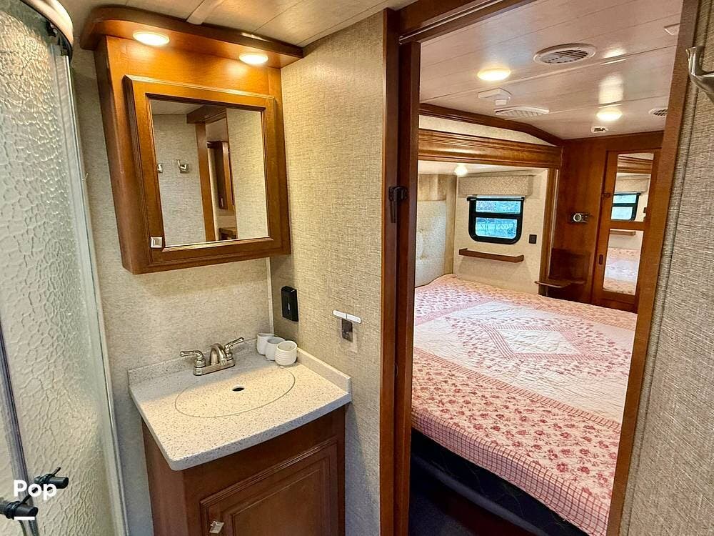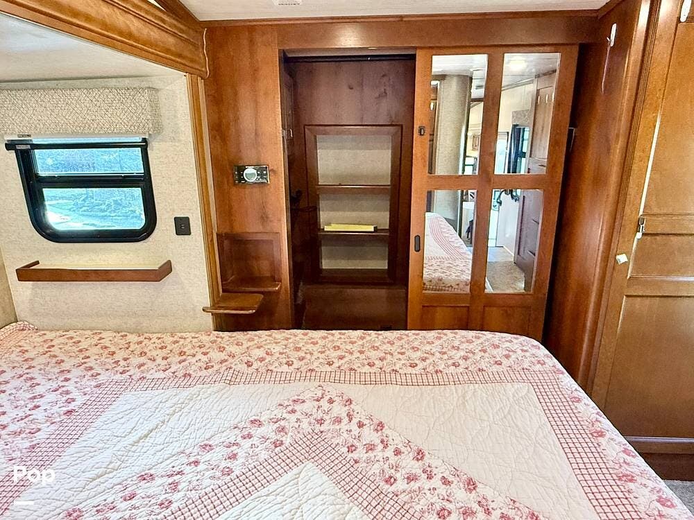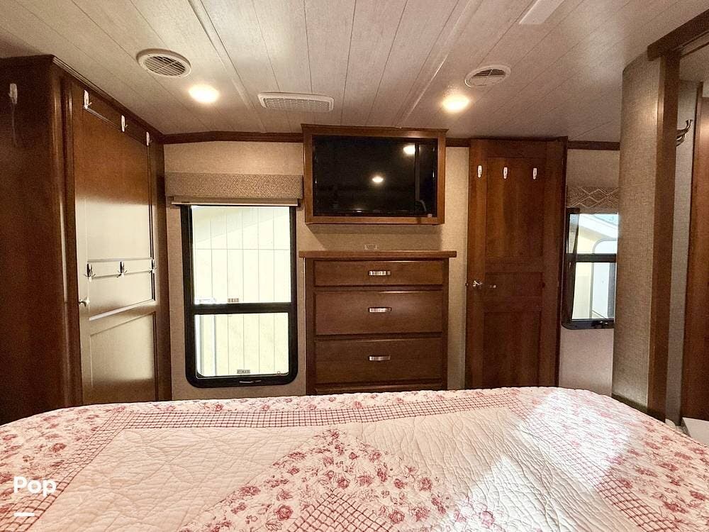 Retreat to the private master bedroom where comfort takes center stage. A king-size bed with a memory foam mattress, deluxe headboard, coordinated bedding package, and LED lighting creates a cozy haven at the end of the day. The bedroom offers excellent airflow thanks to dual windows in the slide, ample closet storage with hanging rods and shelving, massive under-bed storage, and even a pull-out drawer in the steps. A television and full-height ceilings add to the open, residential feel, while the adjacent private bathroom provides convenience and privacy.