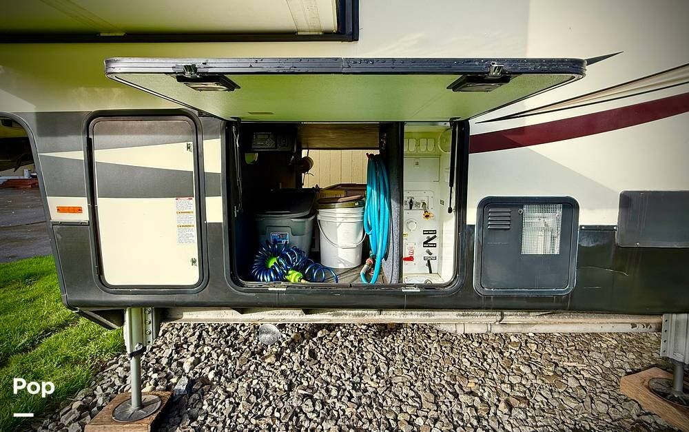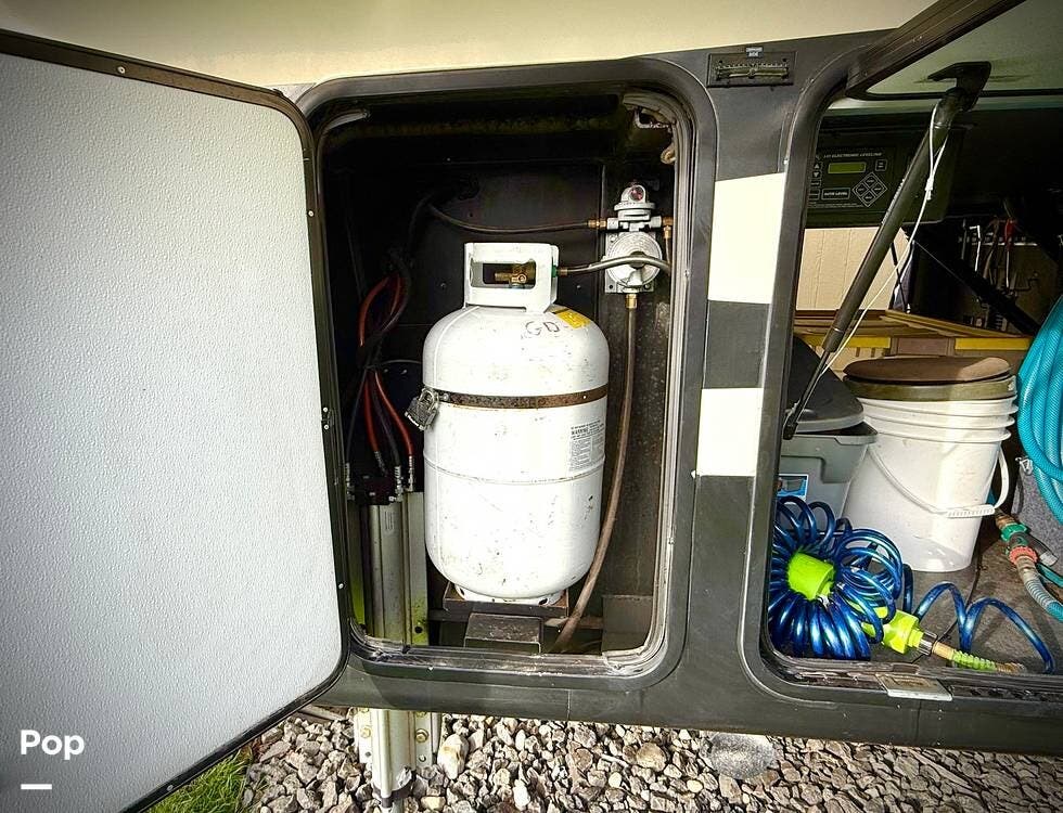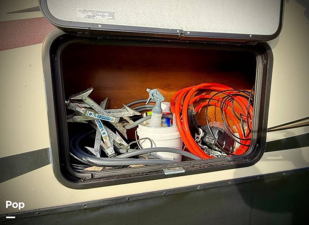 Outside, this Bighorn 3270RS is equally impressive. Setup is effortless with Lippert hydraulic stabilizers and a power-retractable 50-amp power cord. Enjoy outdoor living under the large power awning, complemented by exterior speakers connected to the onboard Bluetooth stereo. Multiple exterior storage compartments provide plenty of room for gear, tools, and travel essentials. The Seller is including a rear cargo carrier (hitch mounted) along with a portable Rhino tote tank.