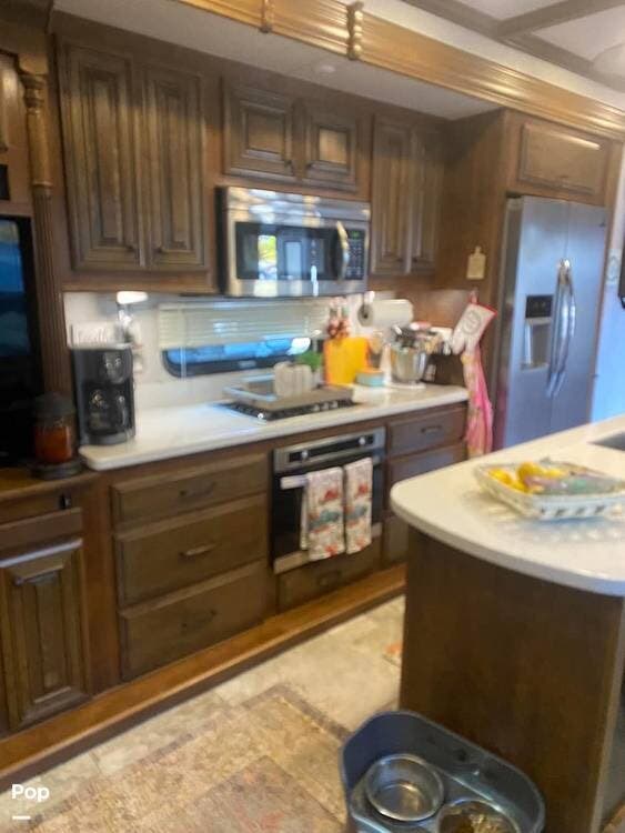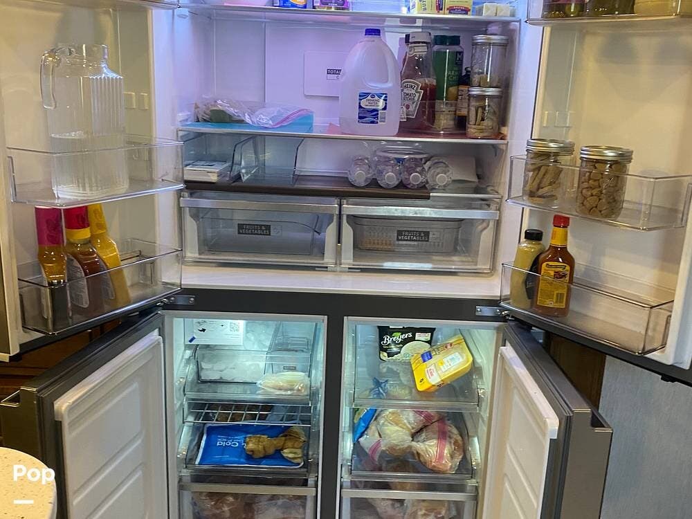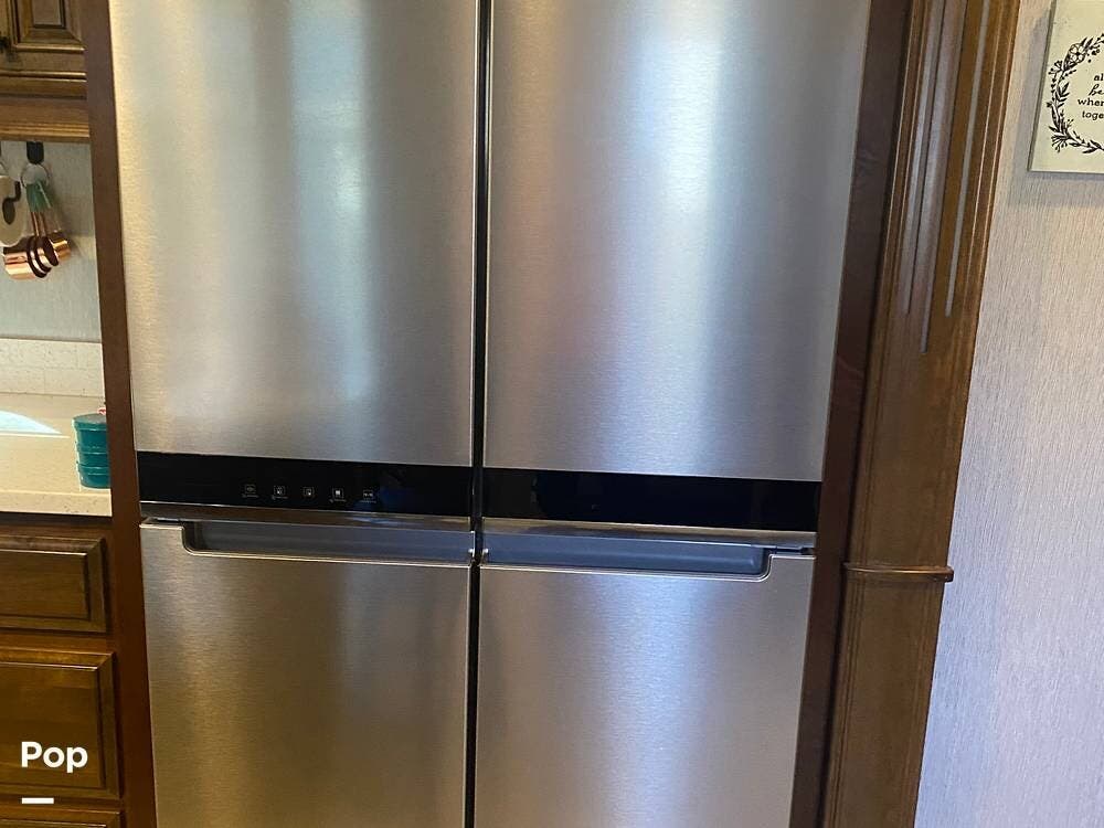 Towards the front, you'll see the modern kitchen with Stainless appliances, a full-size refrigerator, dual kitchen sinks, solid countertops on the center island, and a microwave oven. Family and guests alike will love the intuitive layout and abundance of creature comforts.