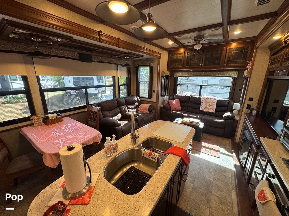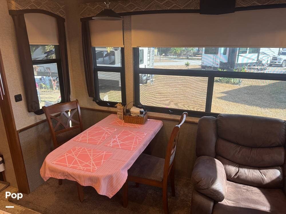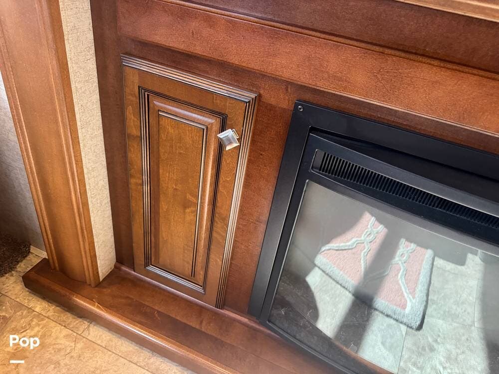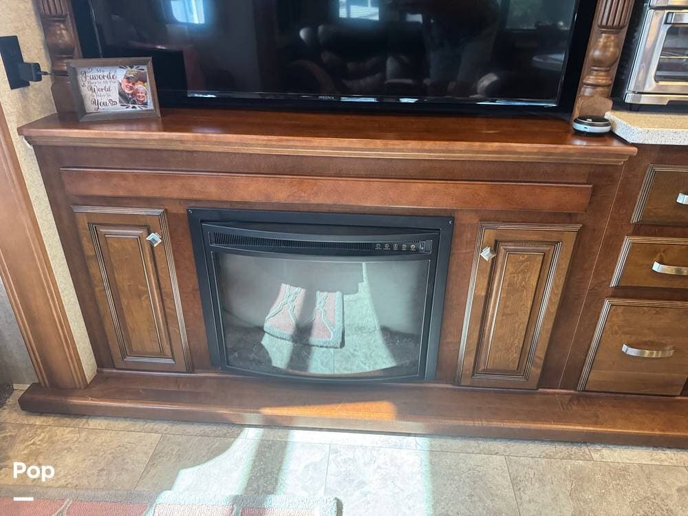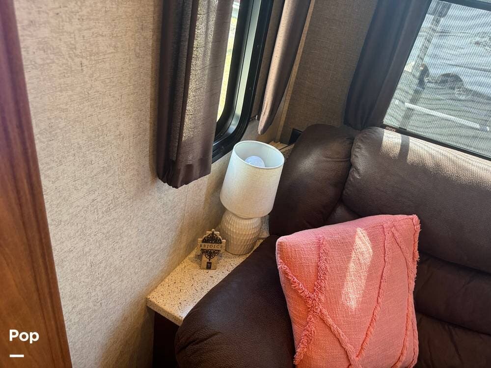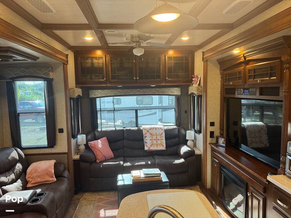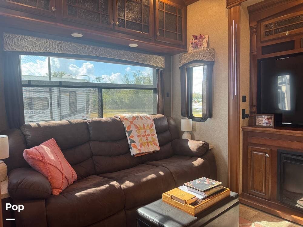 Step inside and you're greeted by a spacious rear living layout that feels open, warm, and inviting. Plush seating, including theater seating and a comfortable sofa, is perfectly positioned for relaxing evenings or entertaining guests. Large windows flood the space with natural light, creating an airy atmosphere while offering beautiful views of your surroundings. A cozy electric fireplace adds both ambiance and supplemental heat, making cool evenings especially enjoyable.