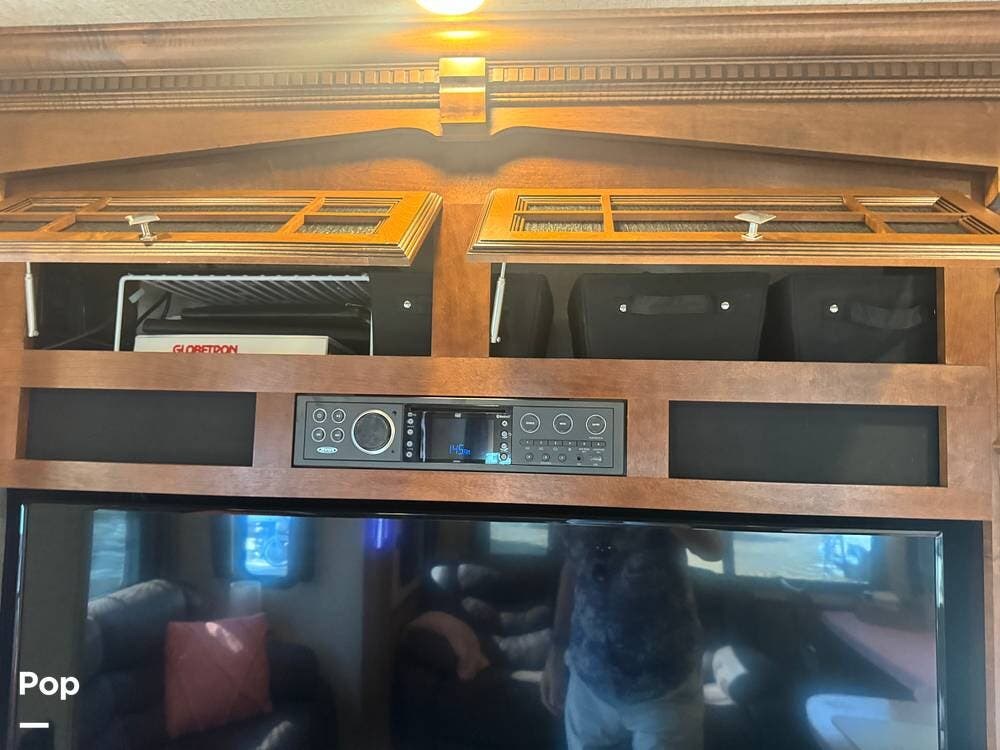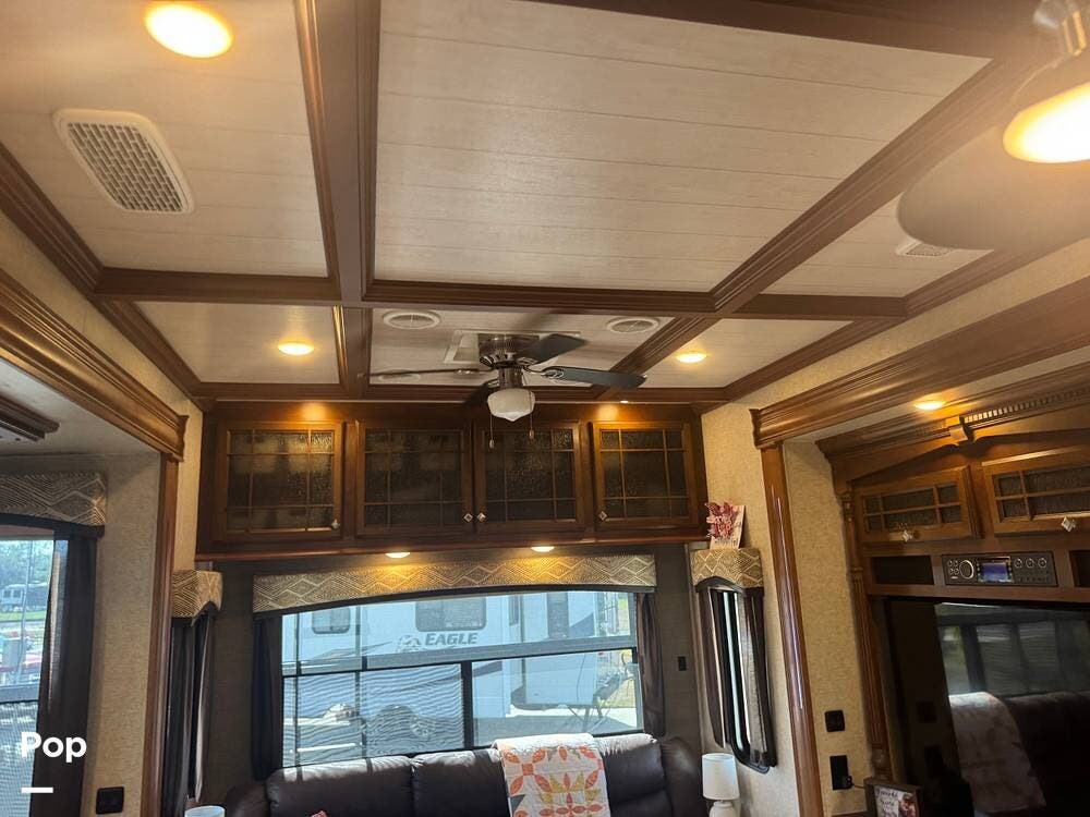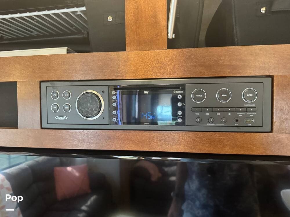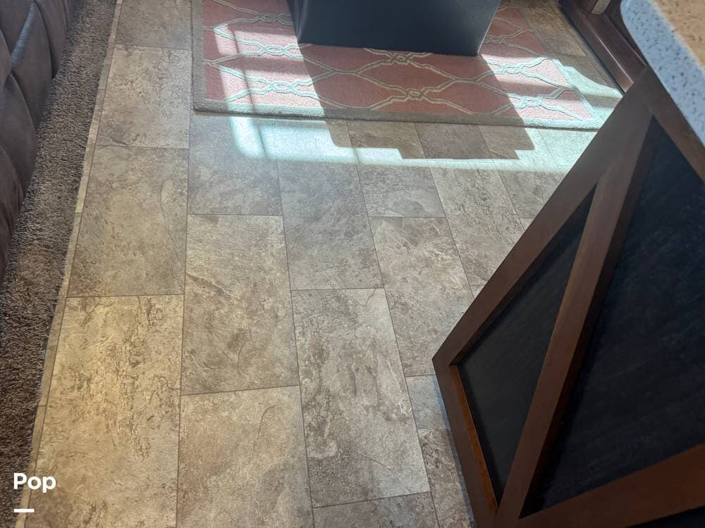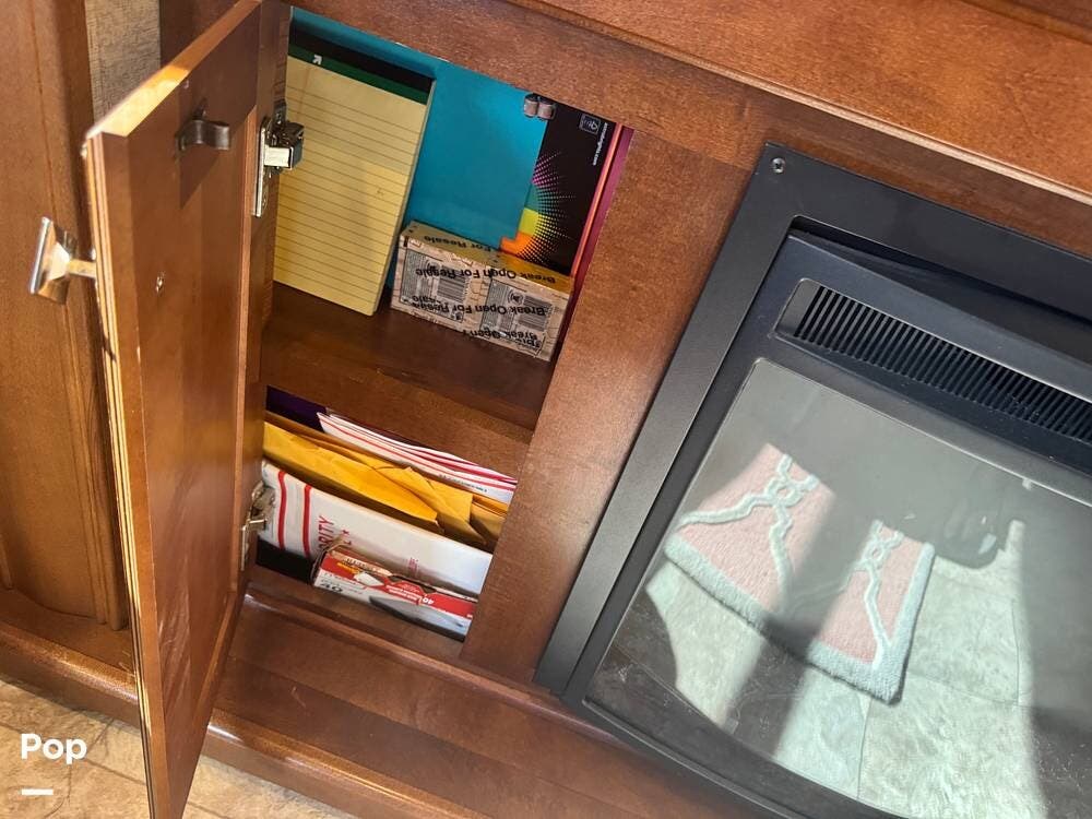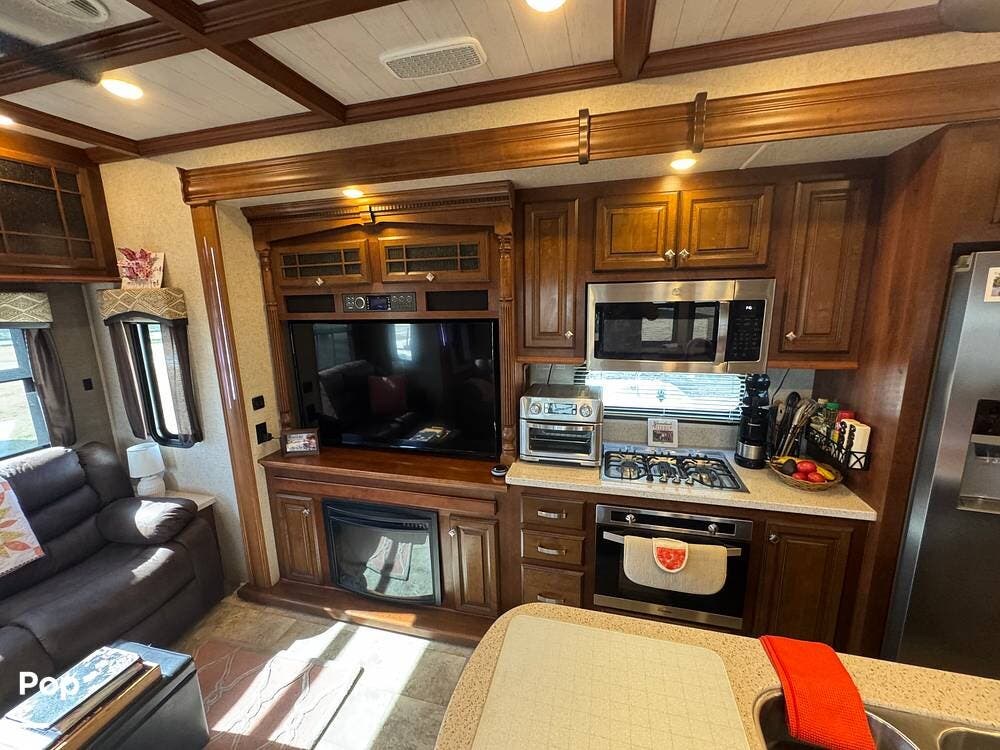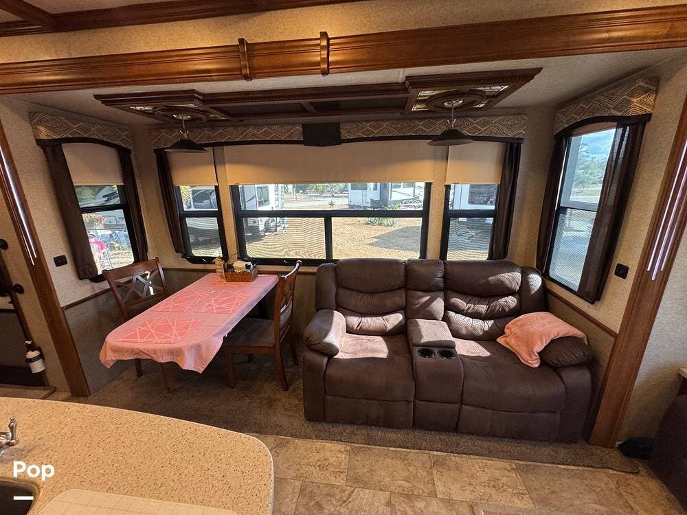 Step inside and you're greeted by a spacious rear living layout that feels open, warm, and inviting. Plush seating, including theater seating and a comfortable sofa, is perfectly positioned for relaxing evenings or entertaining guests. Large windows flood the space with natural light, creating an airy atmosphere while offering beautiful views of your surroundings. A cozy electric fireplace adds both ambiance and supplemental heat, making cool evenings especially enjoyable.