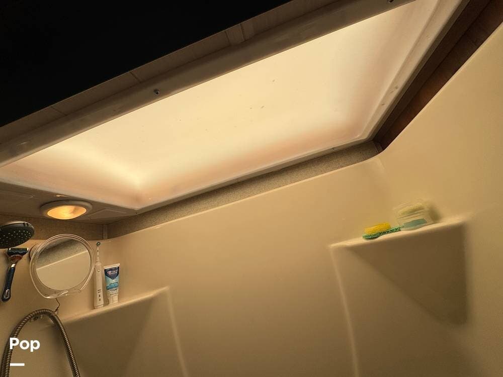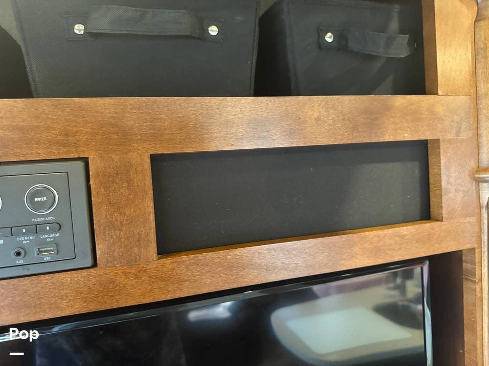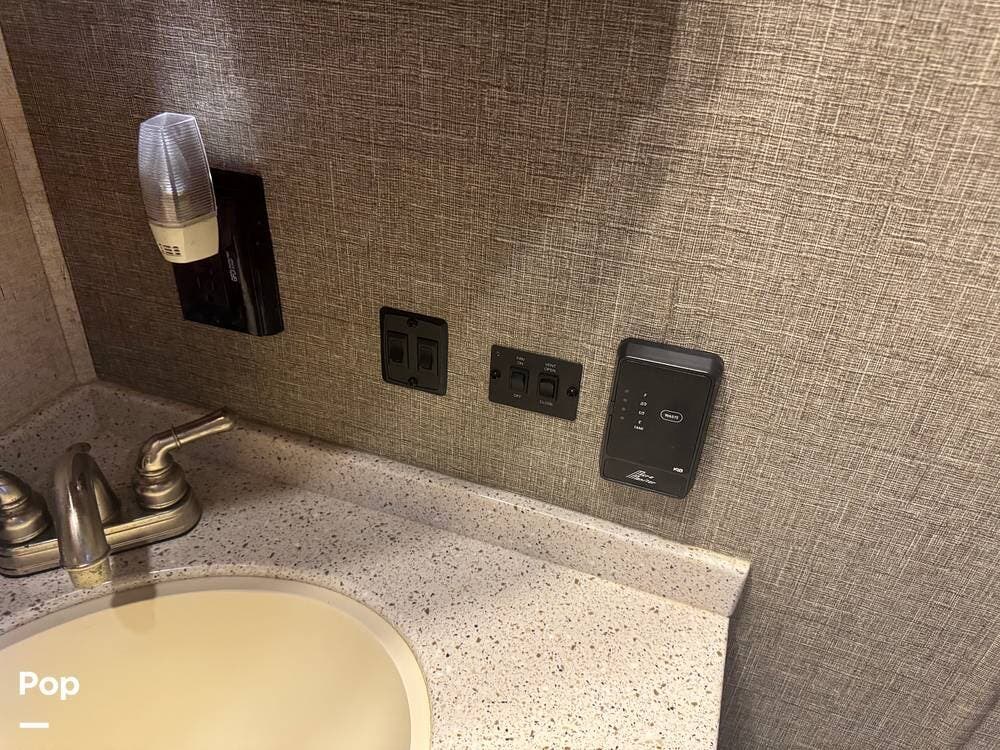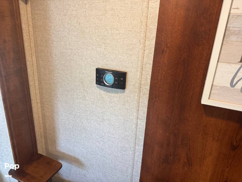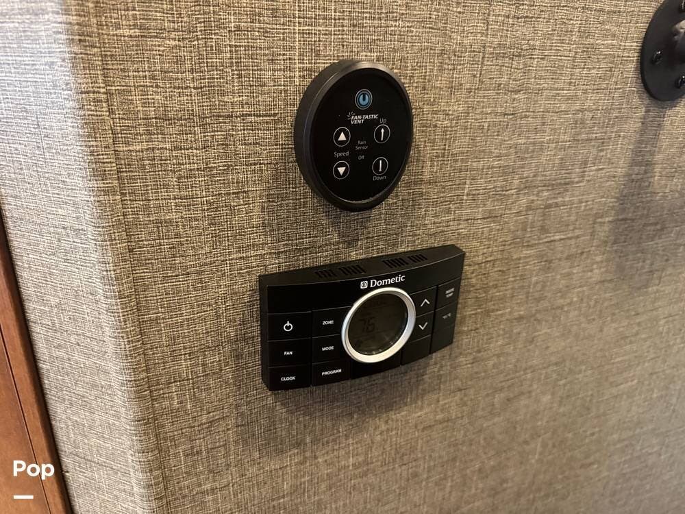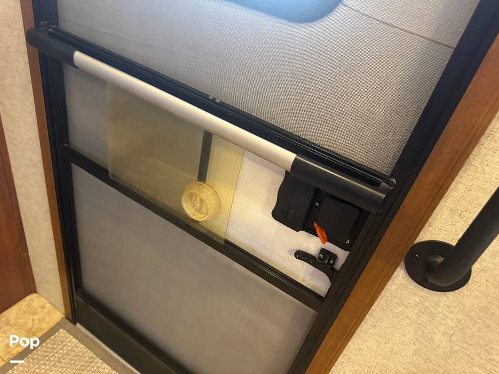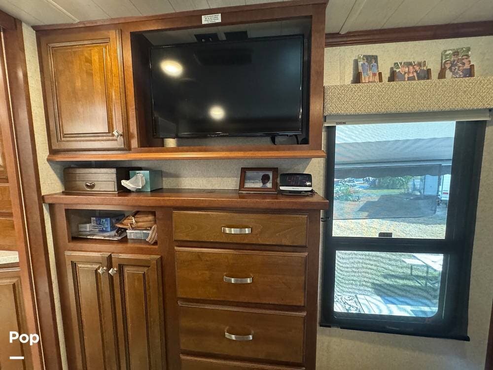 Step inside and you're greeted by a spacious rear living layout that feels open, warm, and inviting. Plush seating, including theater seating and a comfortable sofa, is perfectly positioned for relaxing evenings or entertaining guests. Large windows flood the space with natural light, creating an airy atmosphere while offering beautiful views of your surroundings. A cozy electric fireplace adds both ambiance and supplemental heat, making cool evenings especially enjoyable.