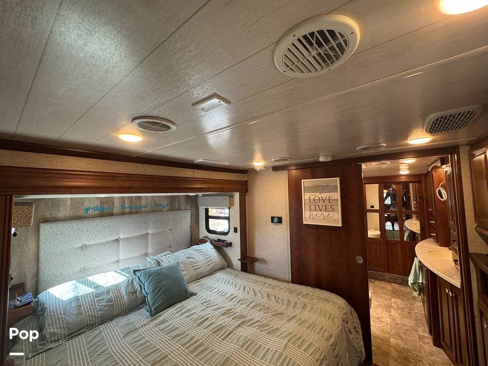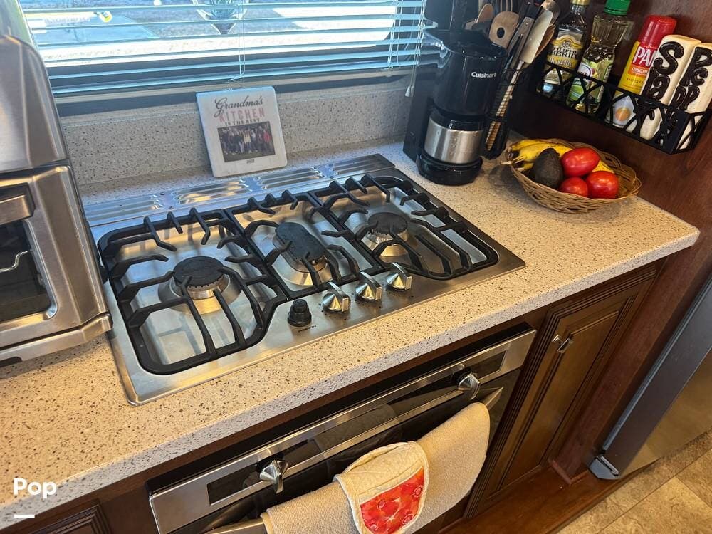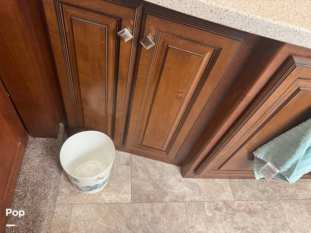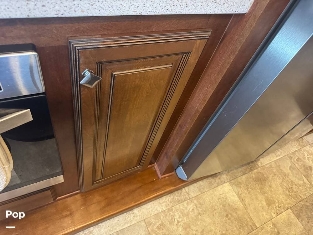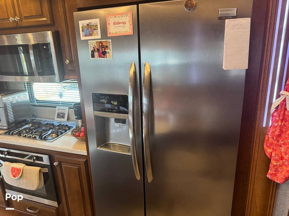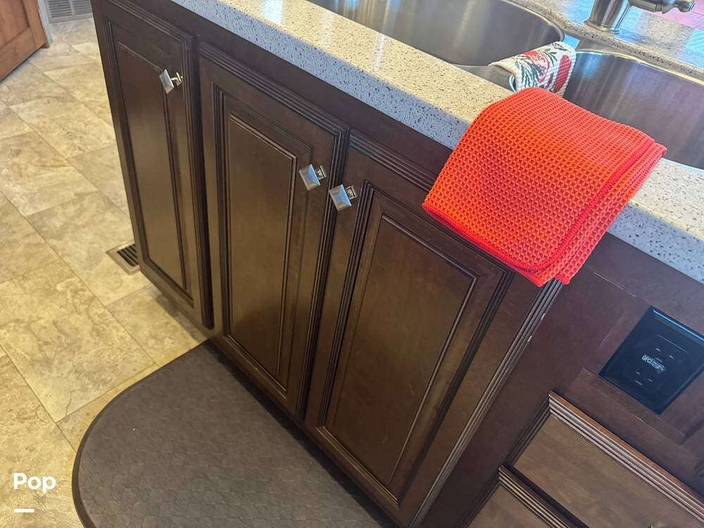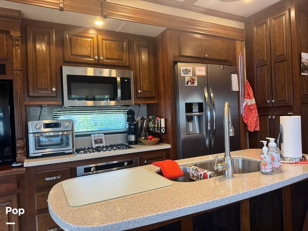 The gourmet kitchen is a standout feature, designed for full-time living. Solid-surface countertops, a large residential-style refrigerator, stainless steel appliances, and a generous island provide plenty of space for cooking, prepping, and gathering. Ample cabinetry and a pantry ensure you'll never run short on storage, whether you're packing for a long trip or living on the road full-time.