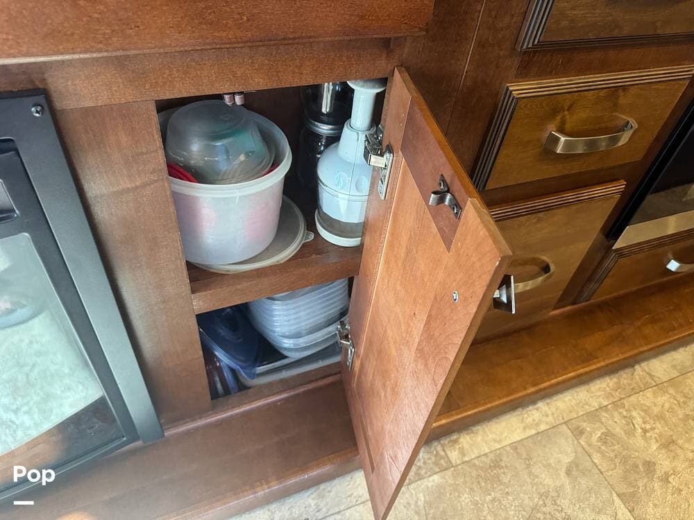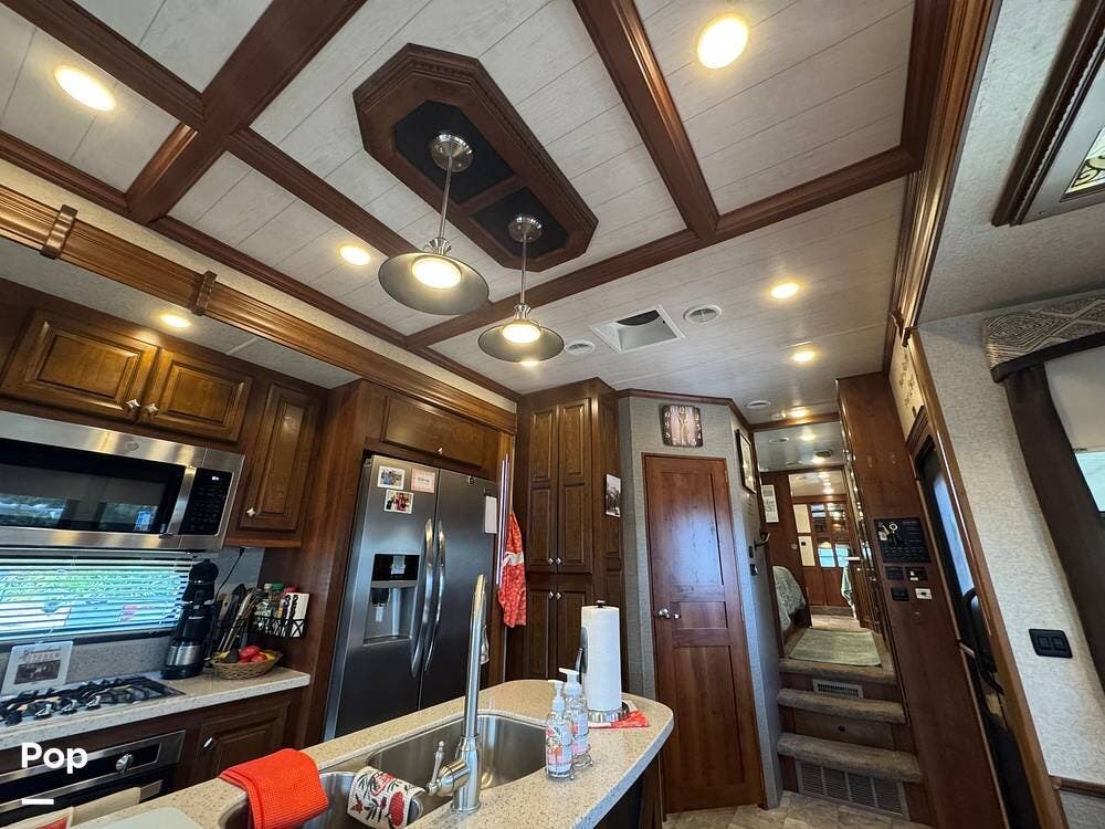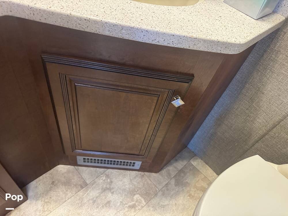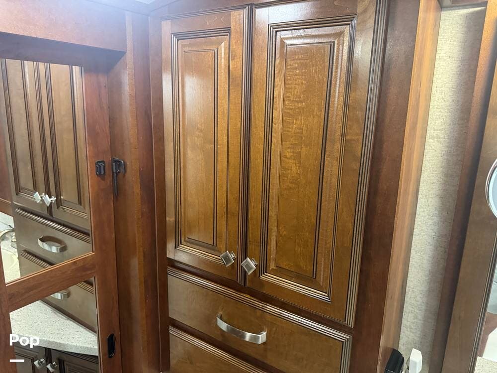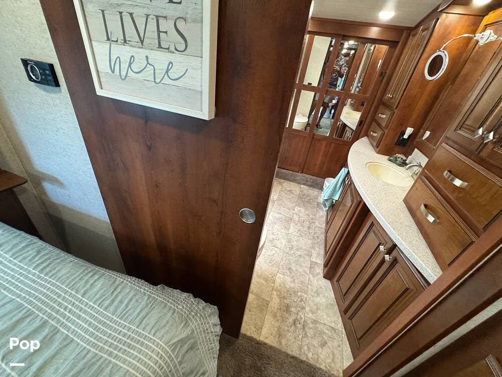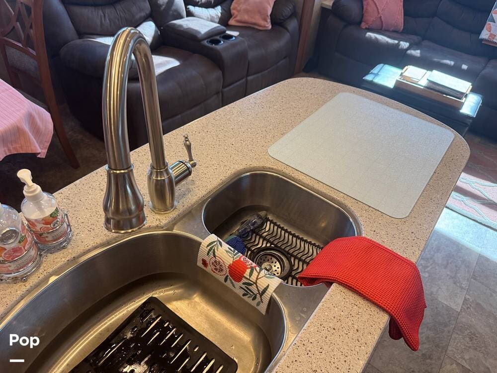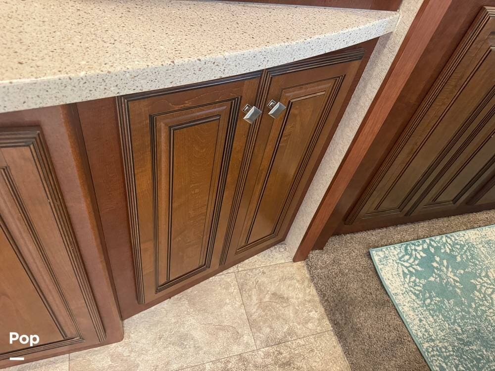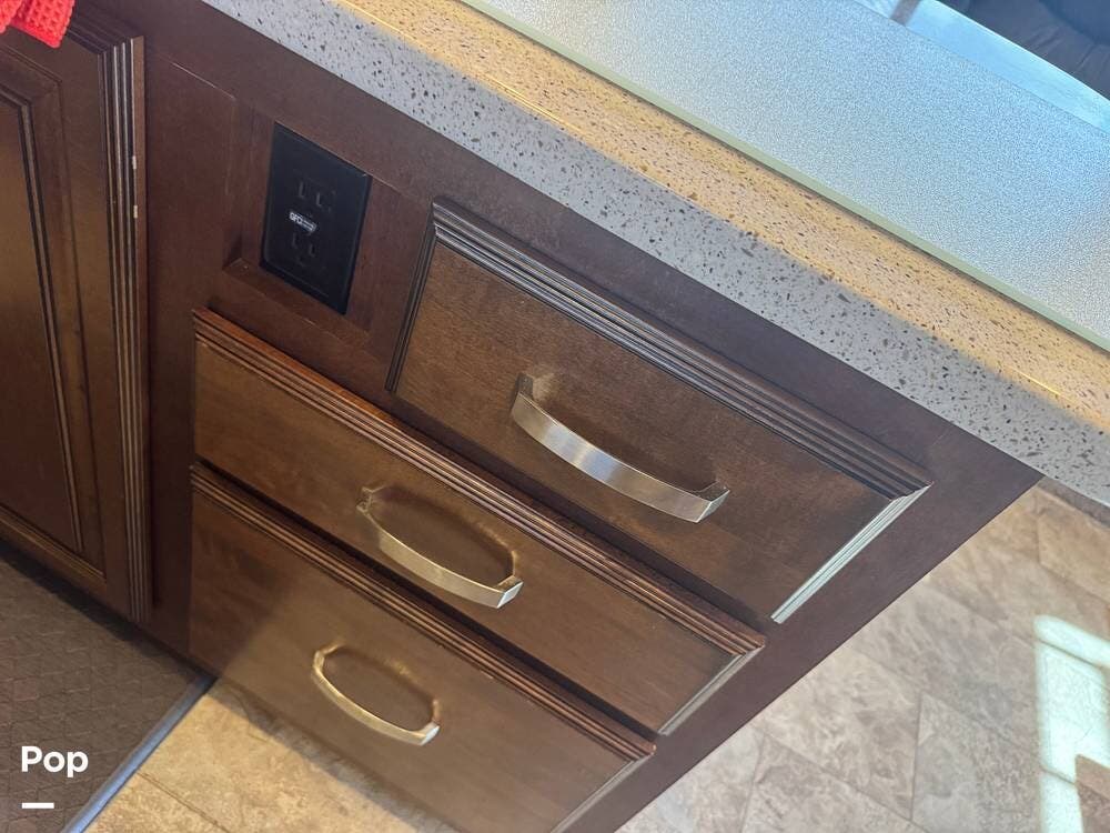 The gourmet kitchen is a standout feature, designed for full-time living. Solid-surface countertops, a large residential-style refrigerator, stainless steel appliances, and a generous island provide plenty of space for cooking, prepping, and gathering. Ample cabinetry and a pantry ensure you'll never run short on storage, whether you're packing for a long trip or living on the road full-time.