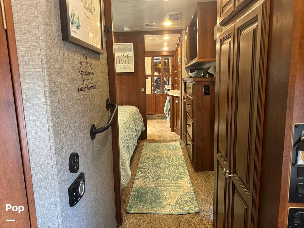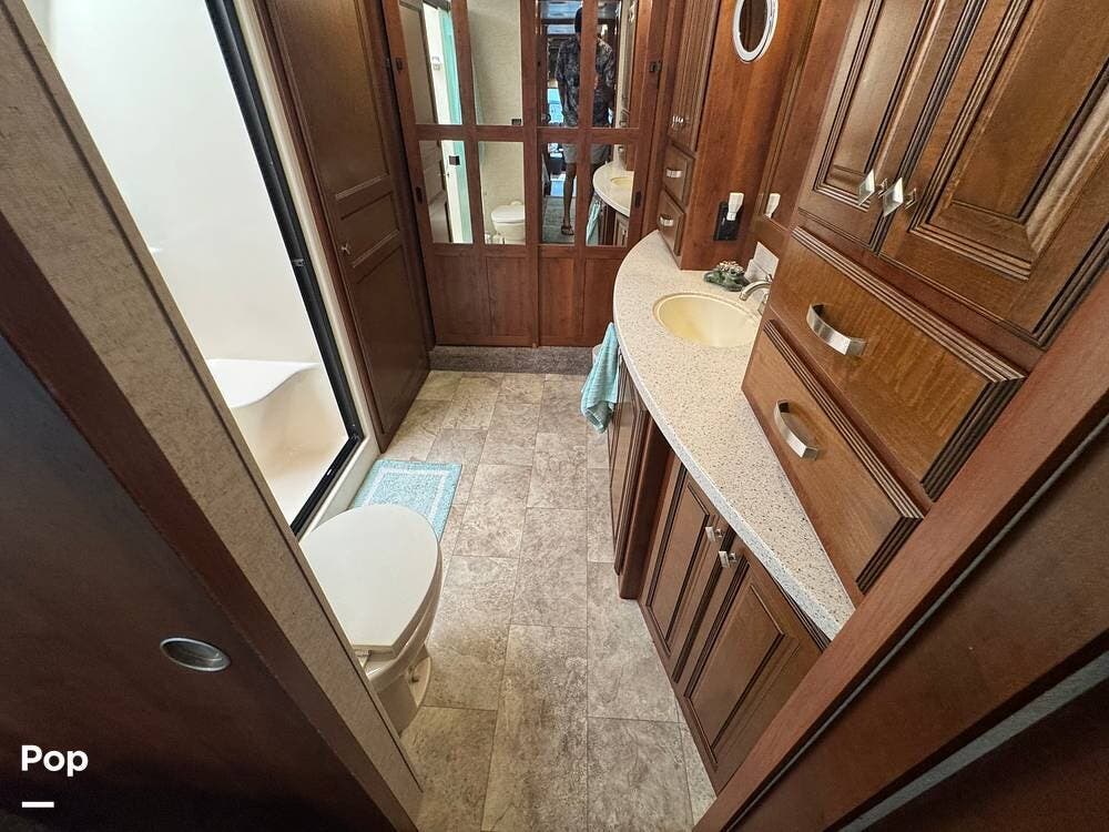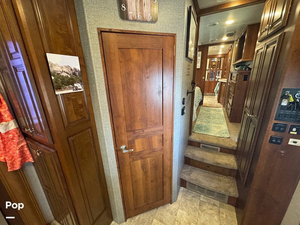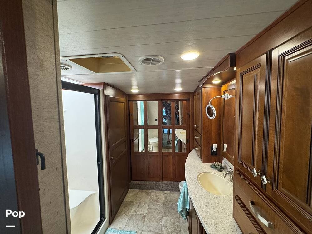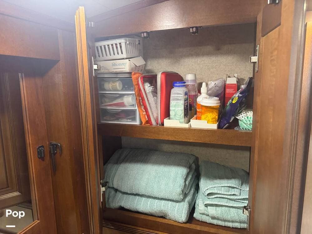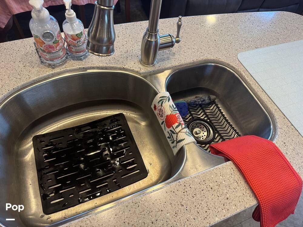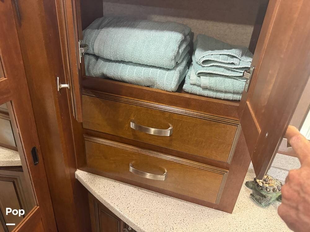 The gourmet kitchen is a standout feature, designed for full-time living. Solid-surface countertops, a large residential-style refrigerator, stainless steel appliances, and a generous island provide plenty of space for cooking, prepping, and gathering. Ample cabinetry and a pantry ensure you'll never run short on storage, whether you're packing for a long trip or living on the road full-time.