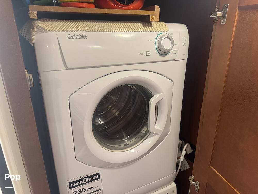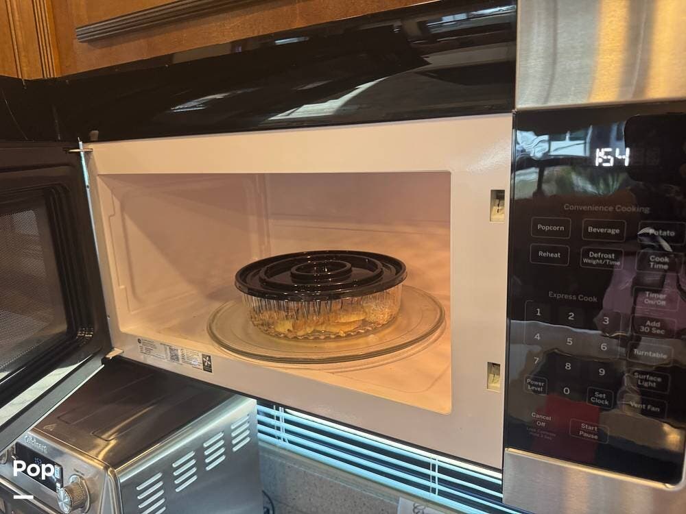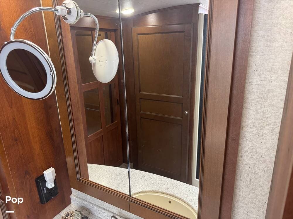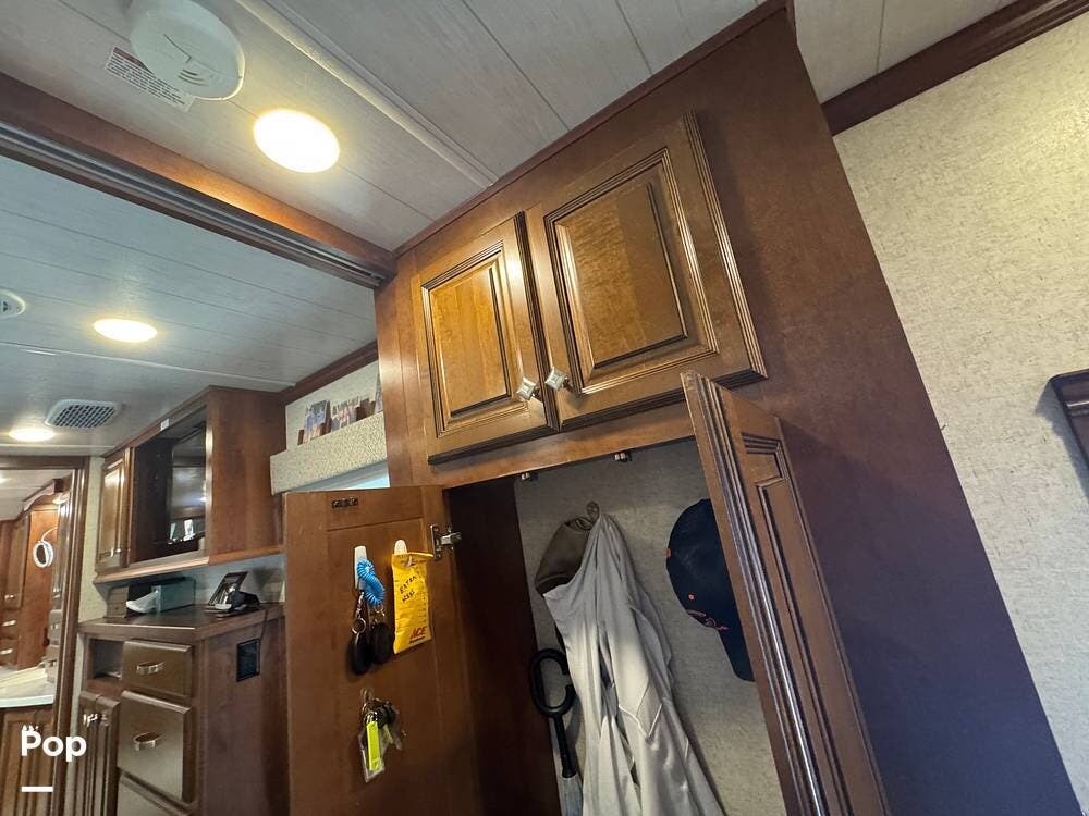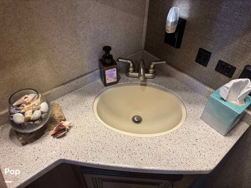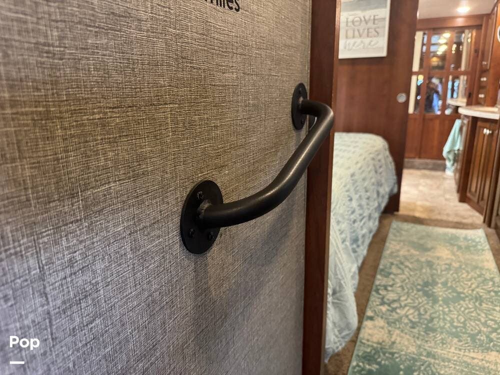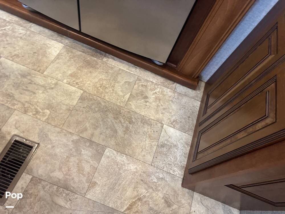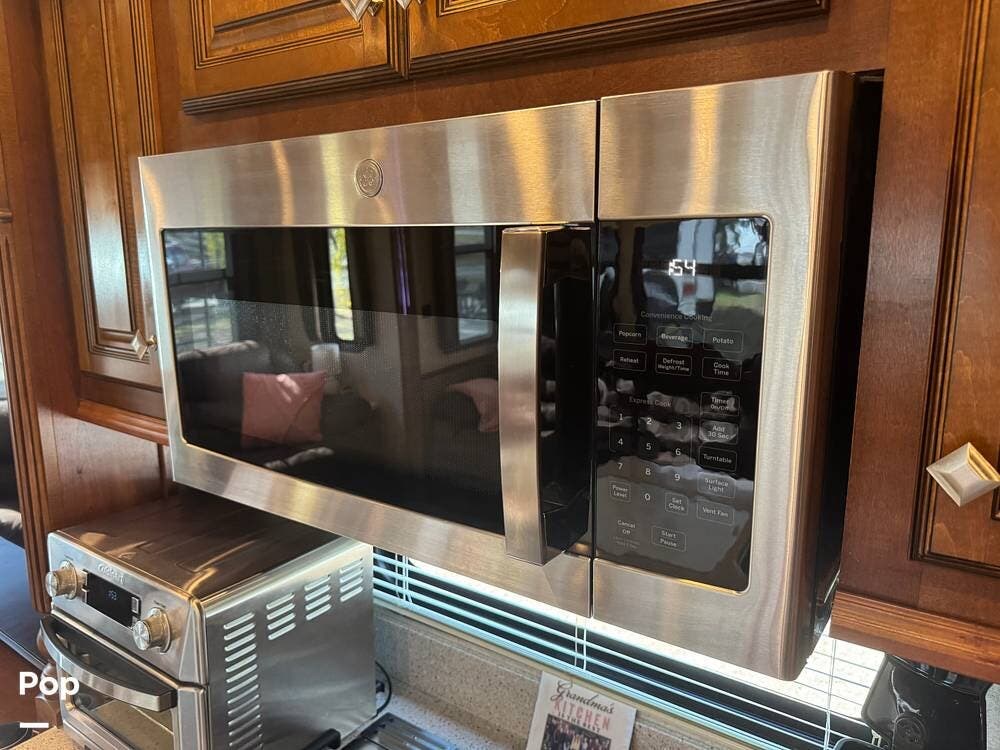 The gourmet kitchen is a standout feature, designed for full-time living. Solid-surface countertops, a large residential-style refrigerator, stainless steel appliances, and a generous island provide plenty of space for cooking, prepping, and gathering. Ample cabinetry and a pantry ensure you'll never run short on storage, whether you're packing for a long trip or living on the road full-time.
