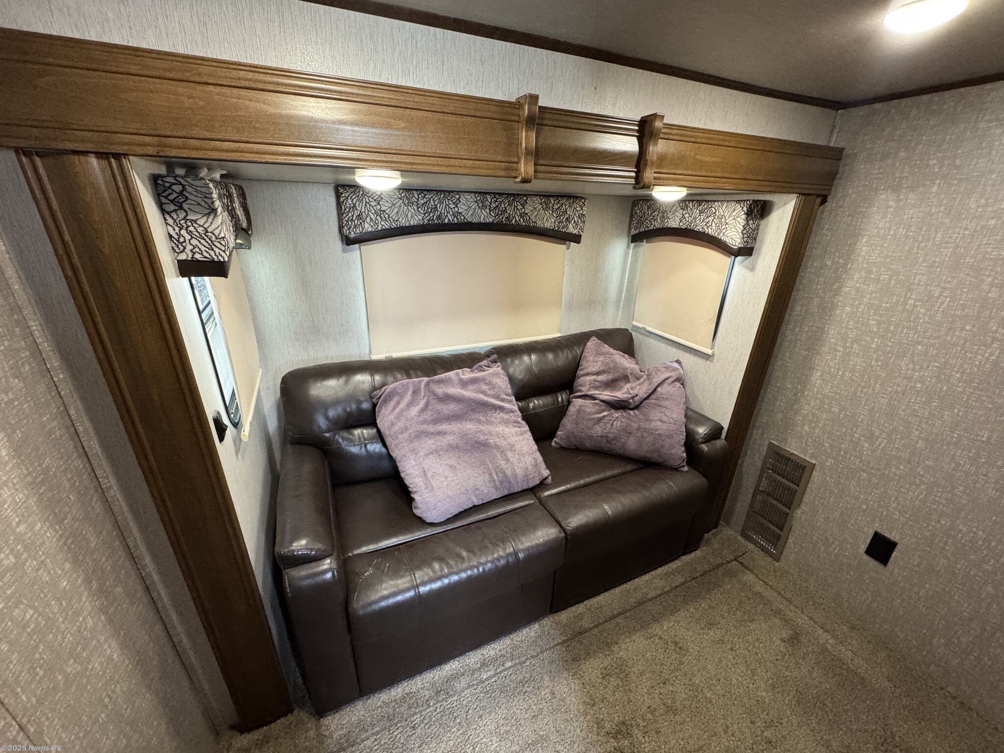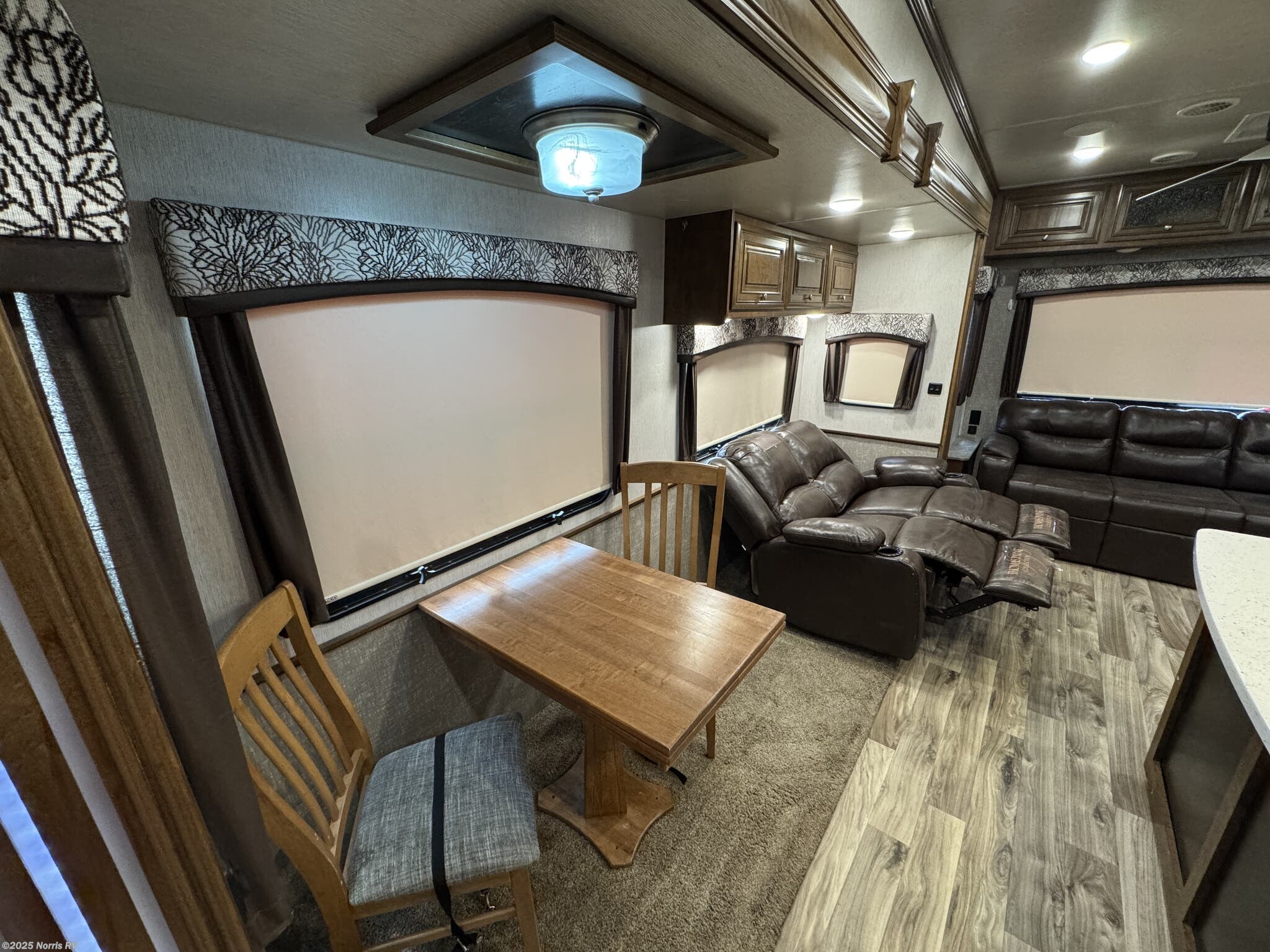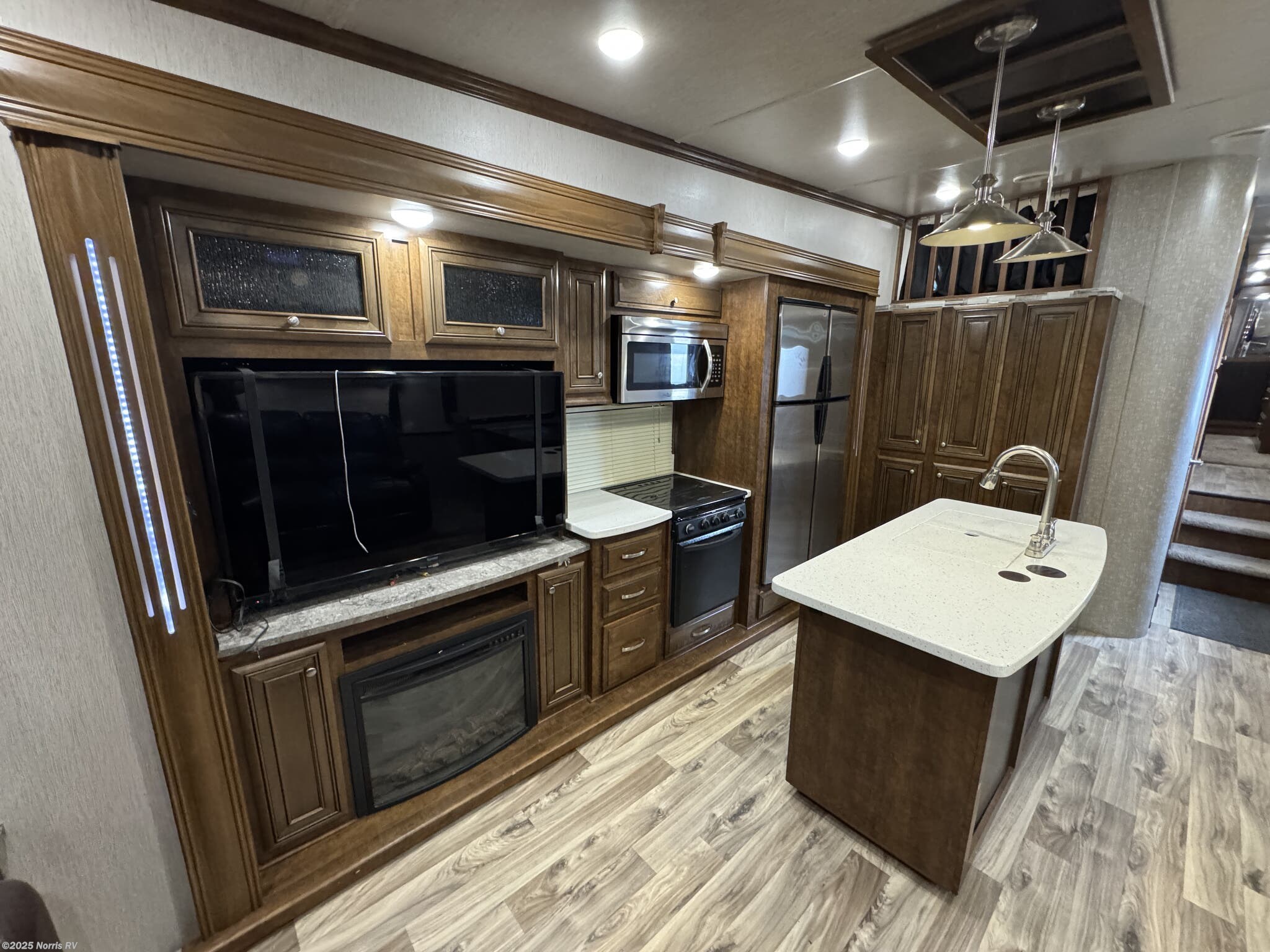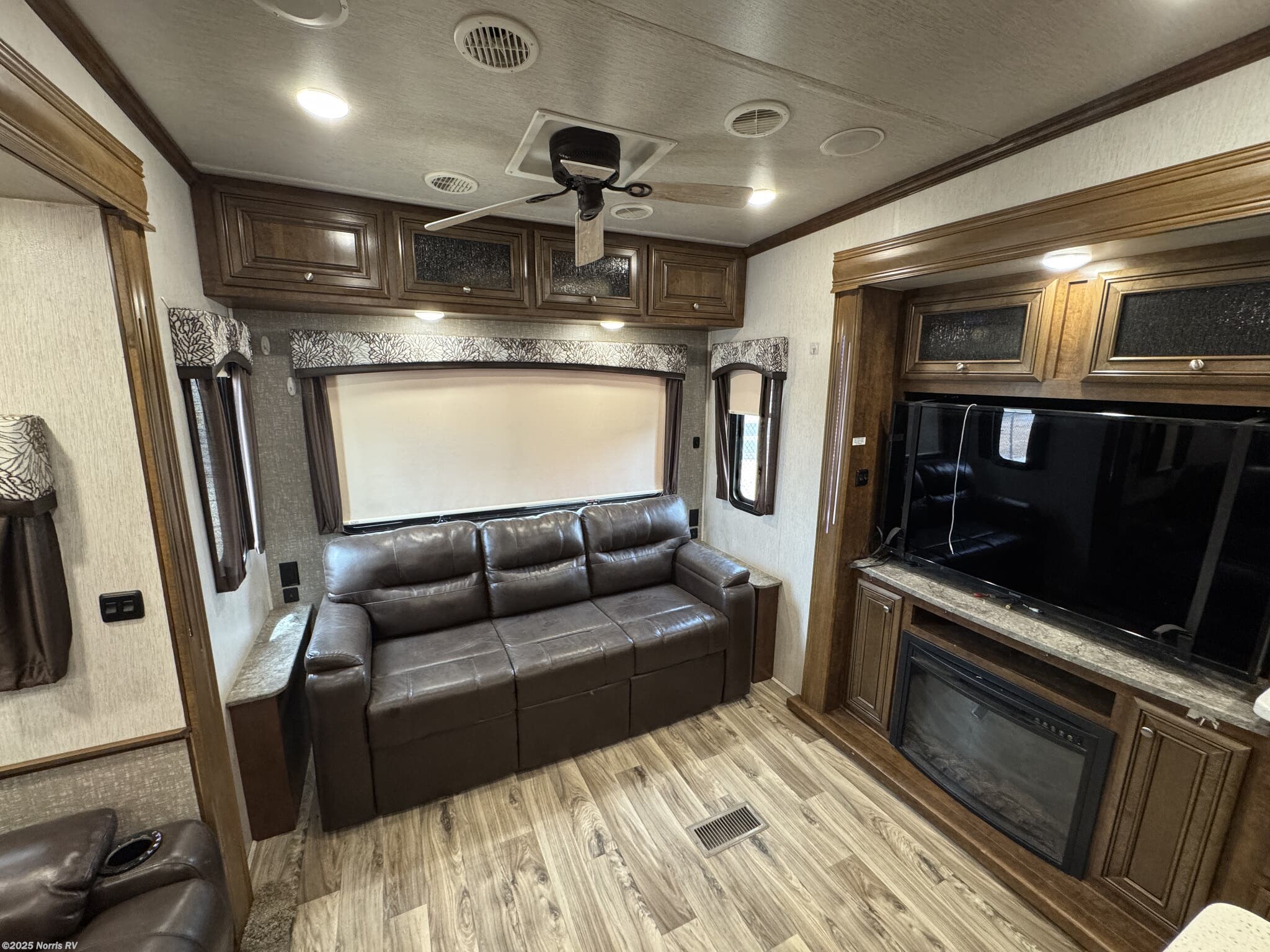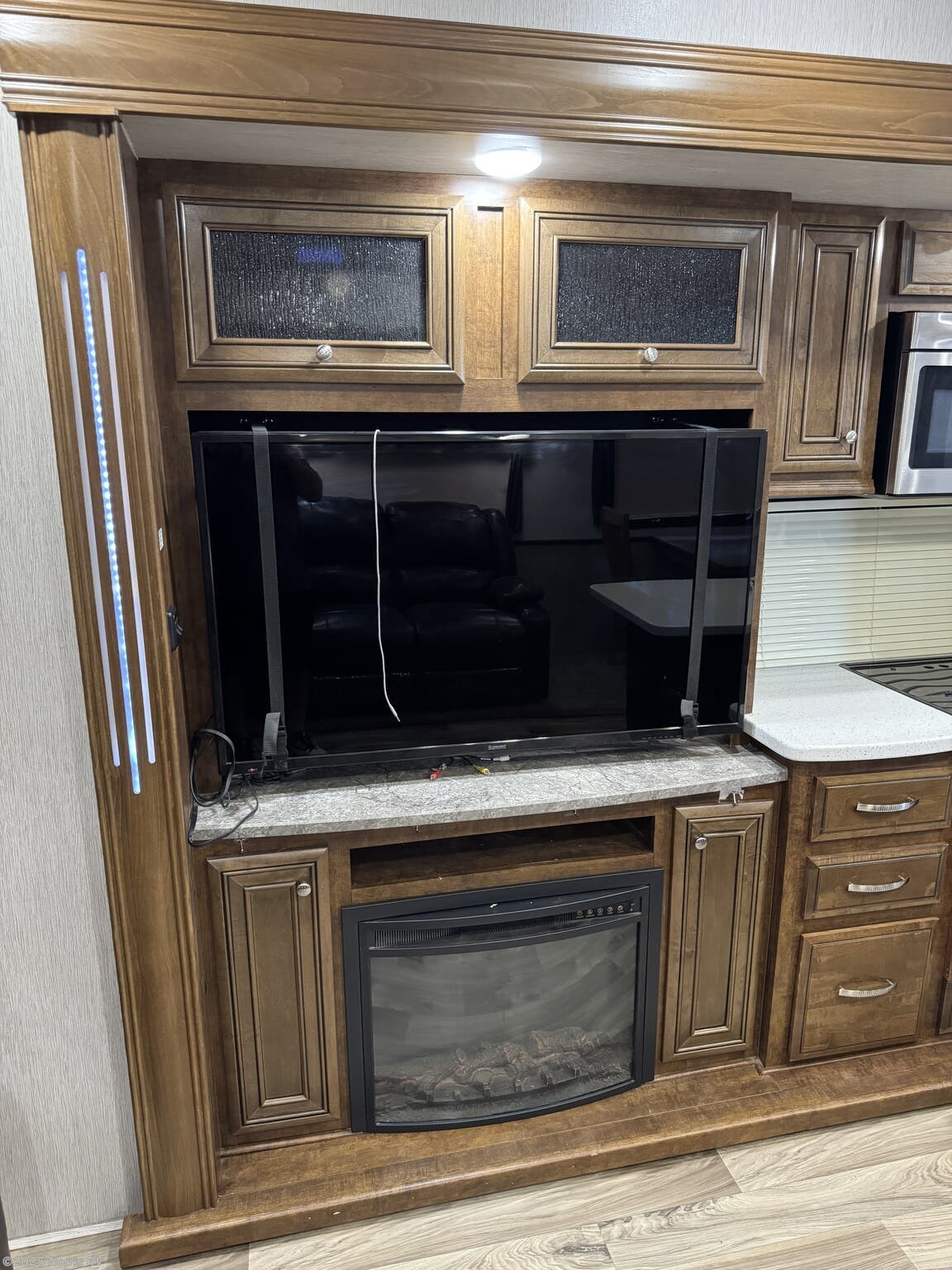 This travel trailer is loaded with modern conveniences, including a 15,000 BTU air conditioner, a cozy fireplace, and a central vacuum system. The kitchen is fully equipped with a microwave, oven, refrigerator, stove top burner, and a large free-standing dinette with chairs, making meal prep a breeze. The bathroom includes a shower, toilet, and ample cabinet storage. Additional features such as a skylight, roof vents, and a ceiling fan improve comfort and ventilation.