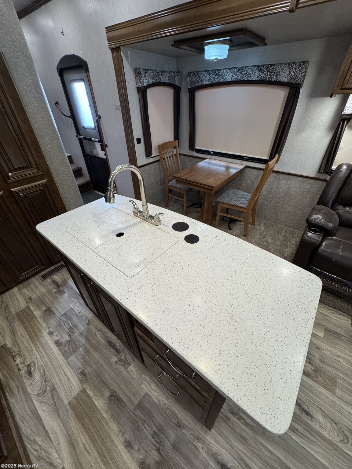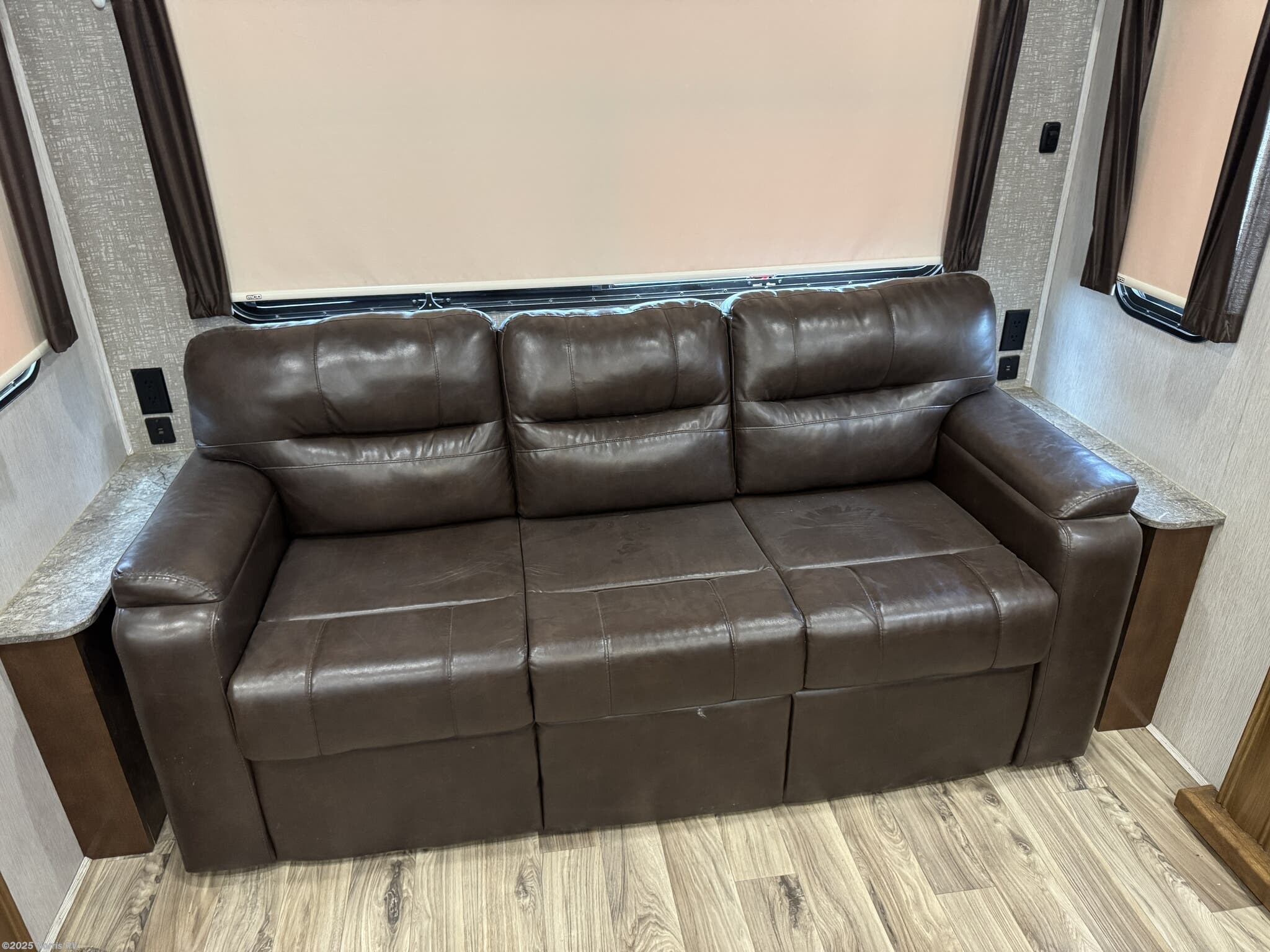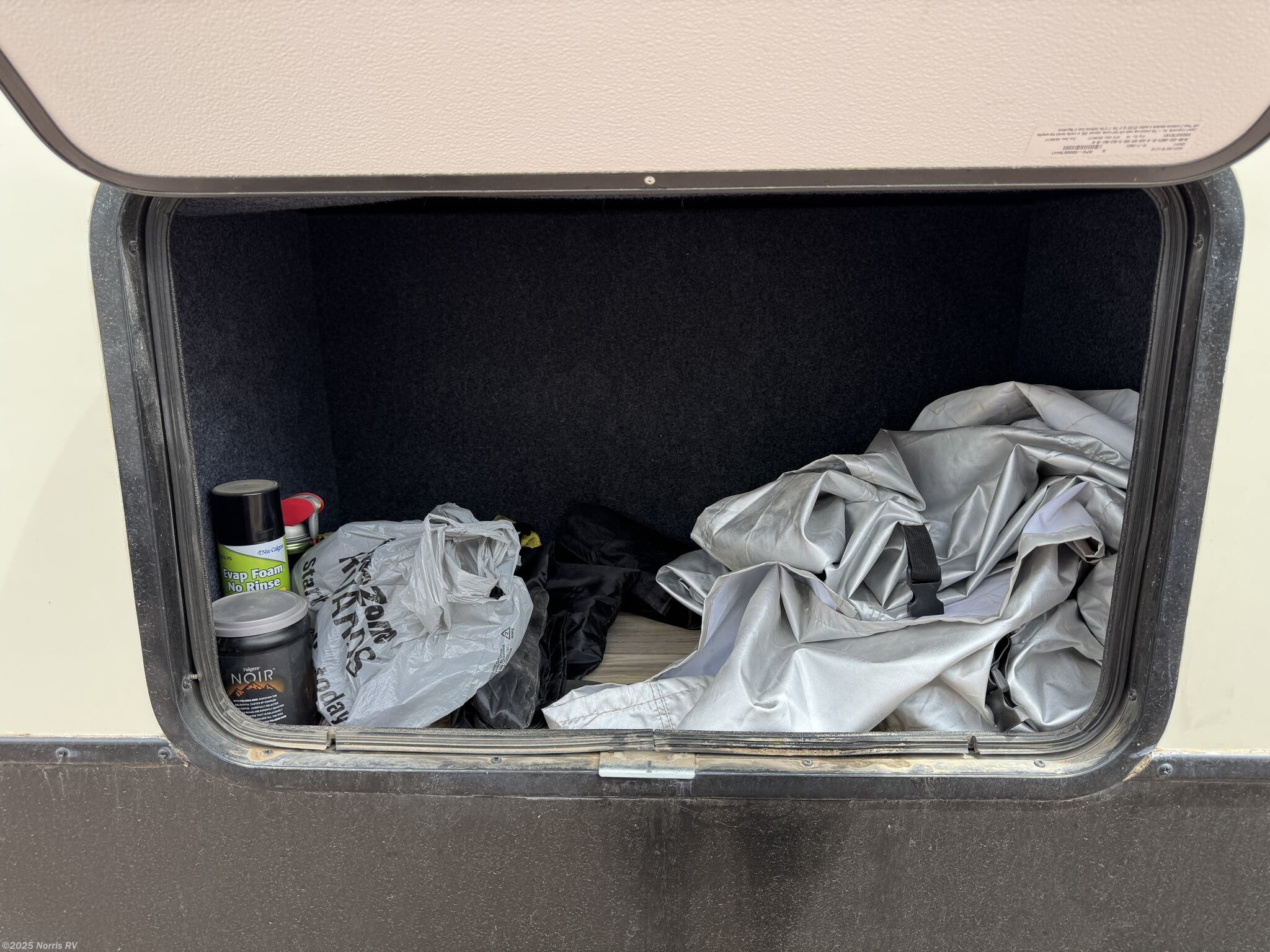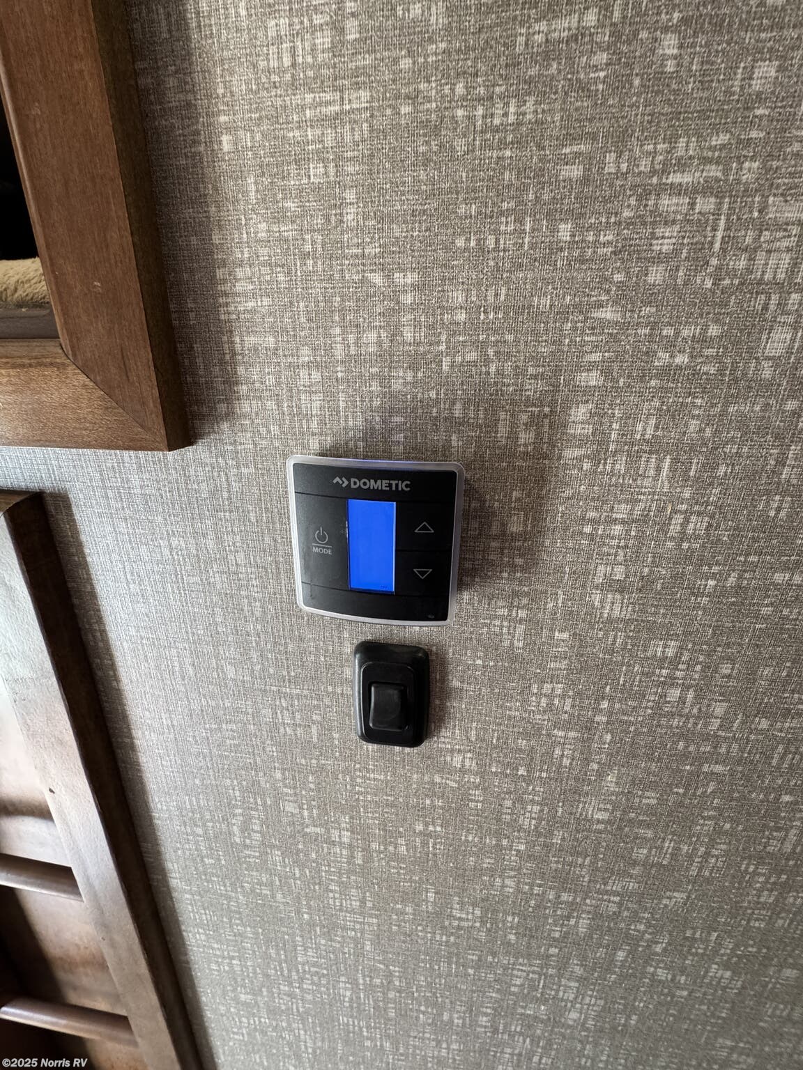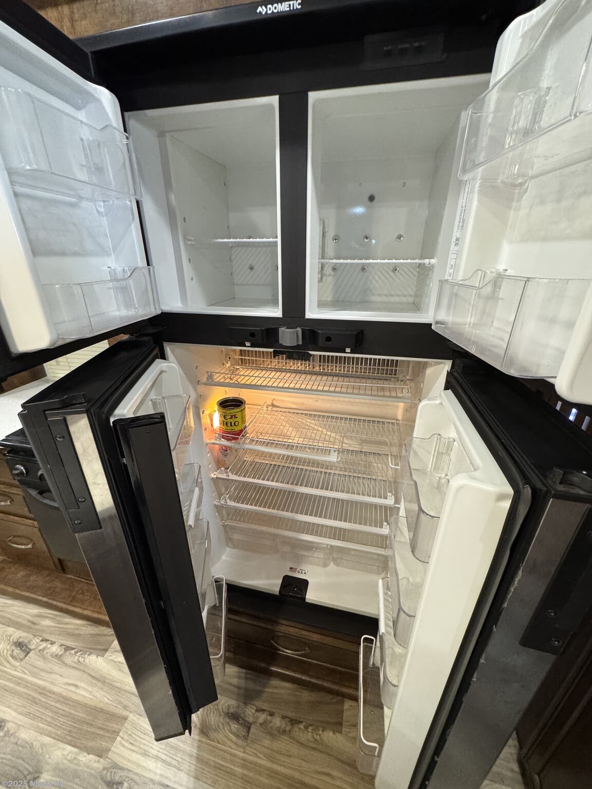 This travel trailer is loaded with modern conveniences, including a 15,000 BTU air conditioner, a cozy fireplace, and a central vacuum system. The kitchen is fully equipped with a microwave, oven, refrigerator, stove top burner, and a large free-standing dinette with chairs, making meal prep a breeze. The bathroom includes a shower, toilet, and ample cabinet storage. Additional features such as a skylight, roof vents, and a ceiling fan improve comfort and ventilation.