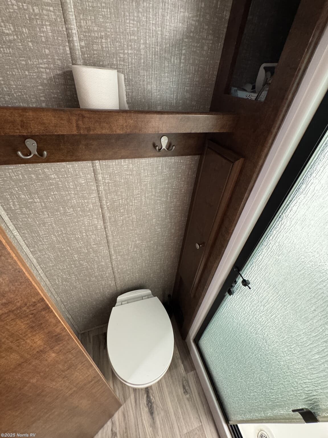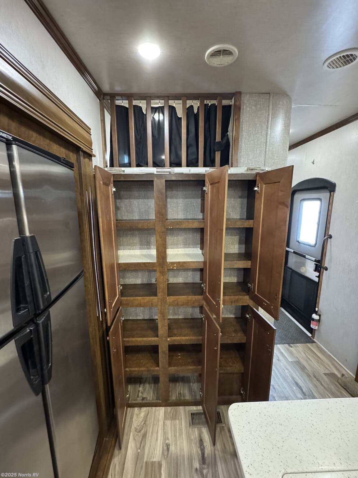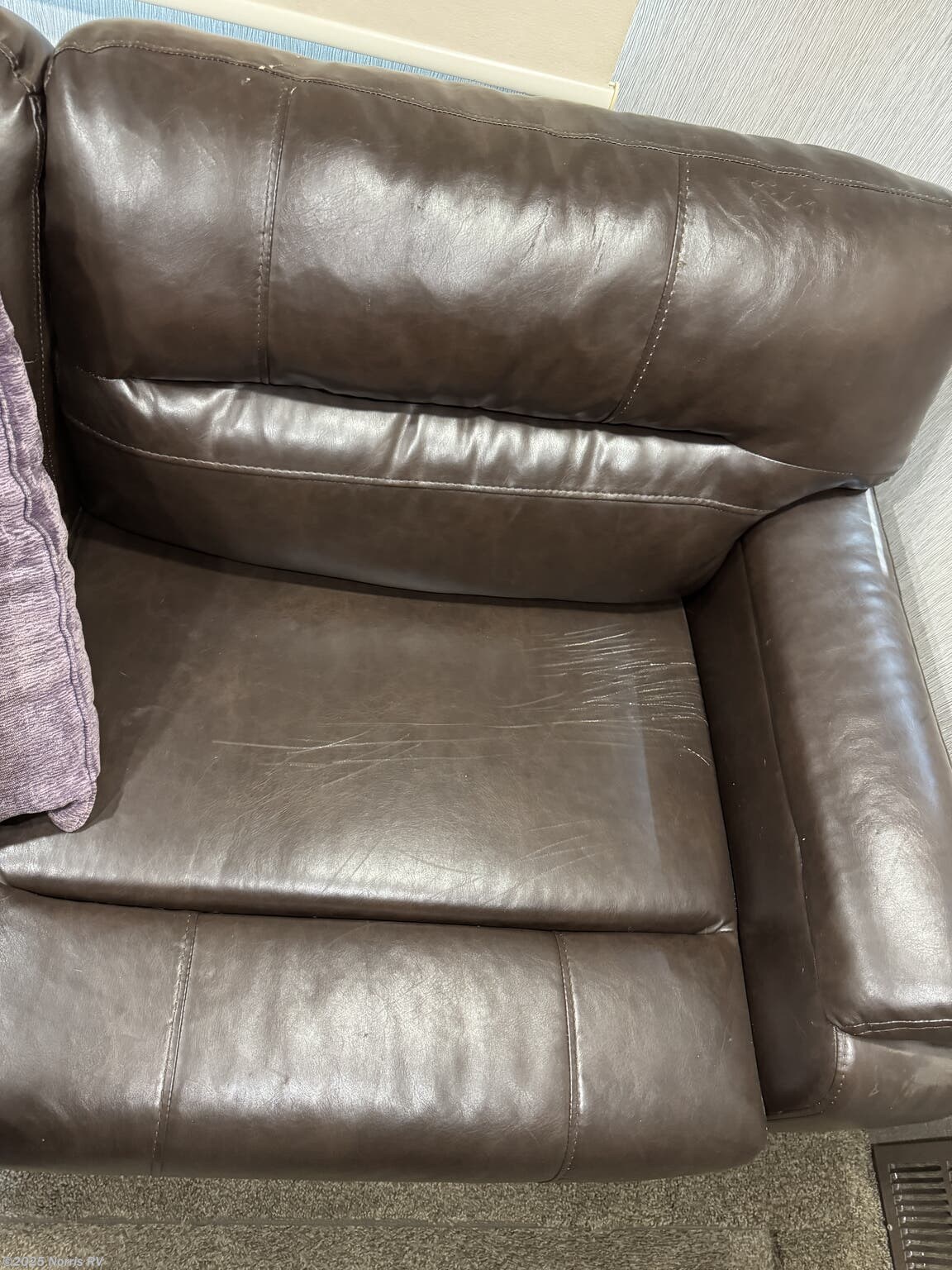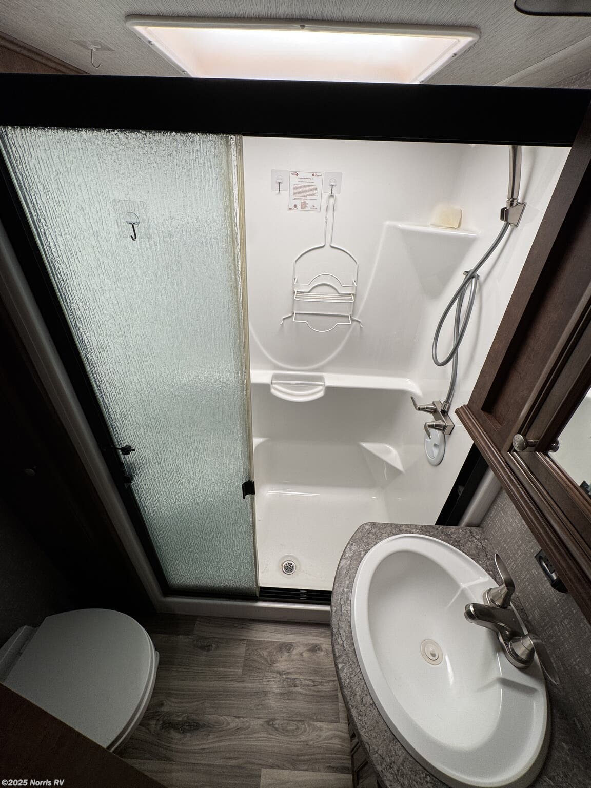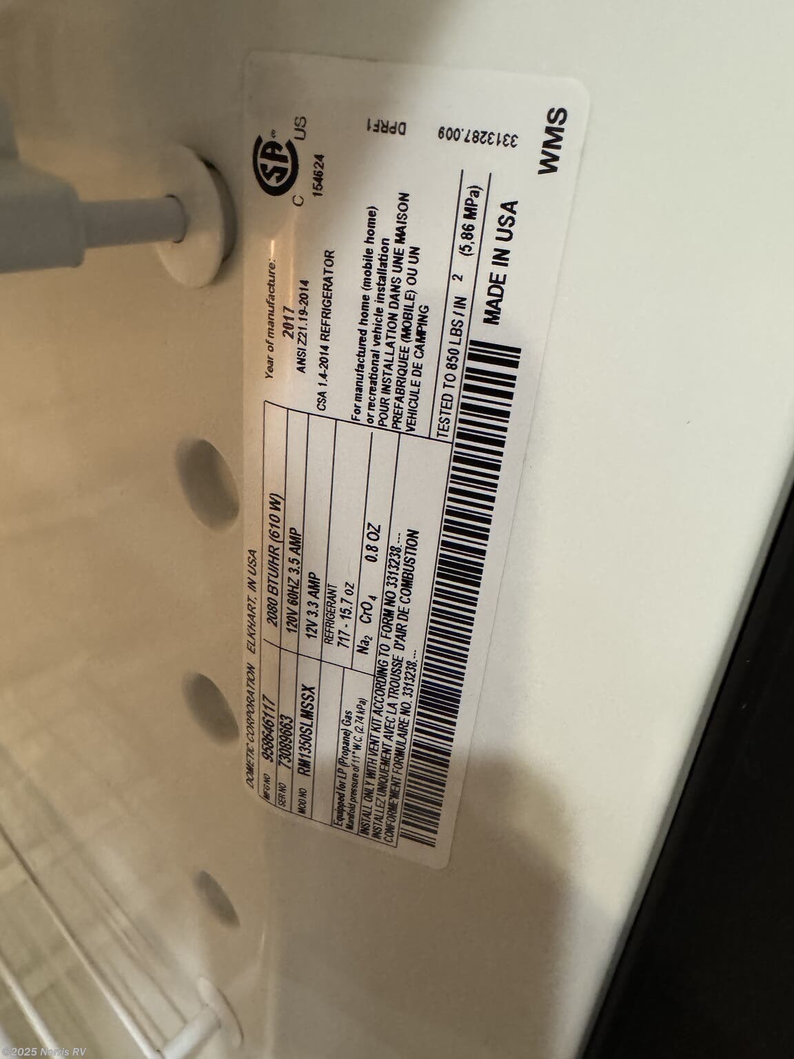 This travel trailer is loaded with modern conveniences, including a 15,000 BTU air conditioner, a cozy fireplace, and a central vacuum system. The kitchen is fully equipped with a microwave, oven, refrigerator, stove top burner, and a large free-standing dinette with chairs, making meal prep a breeze. The bathroom includes a shower, toilet, and ample cabinet storage. Additional features such as a skylight, roof vents, and a ceiling fan improve comfort and ventilation.