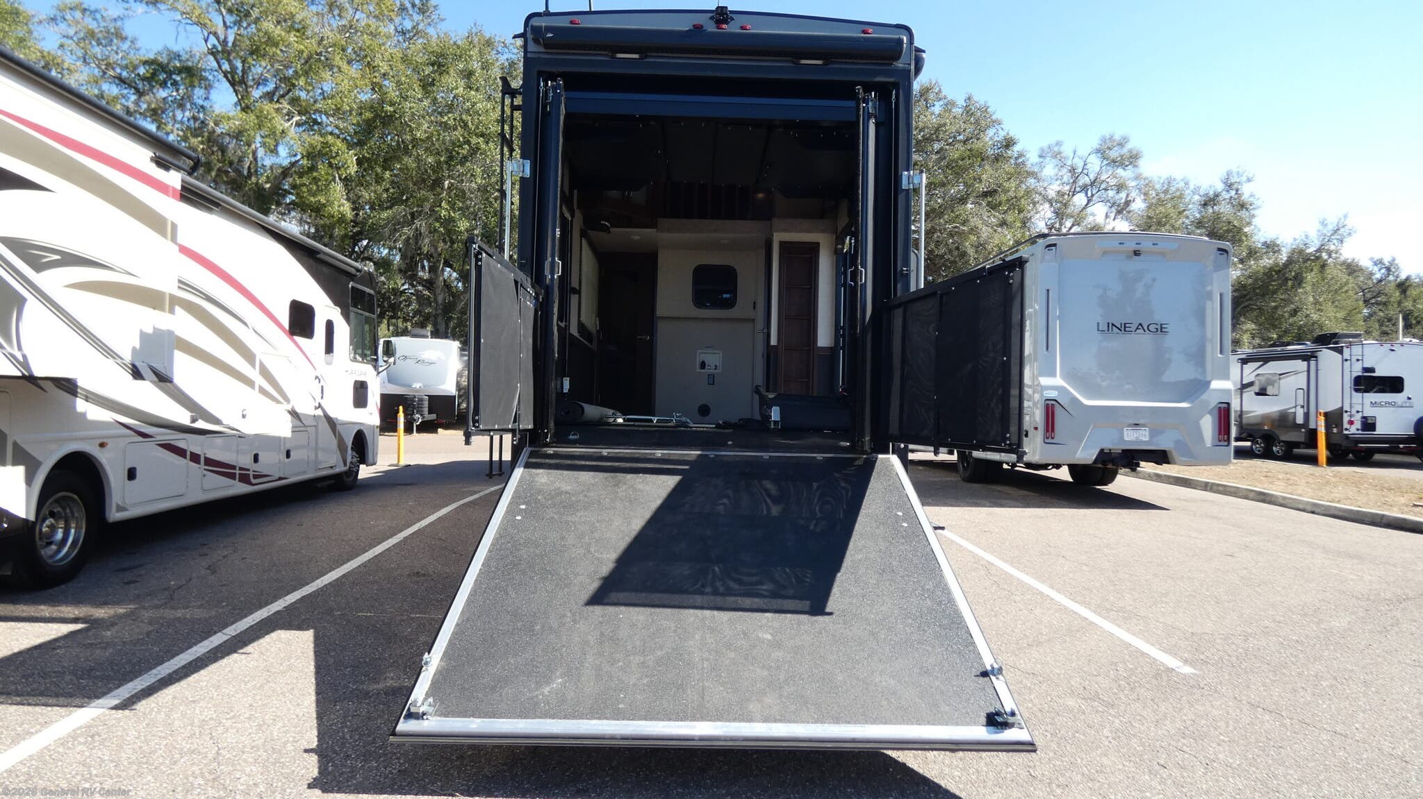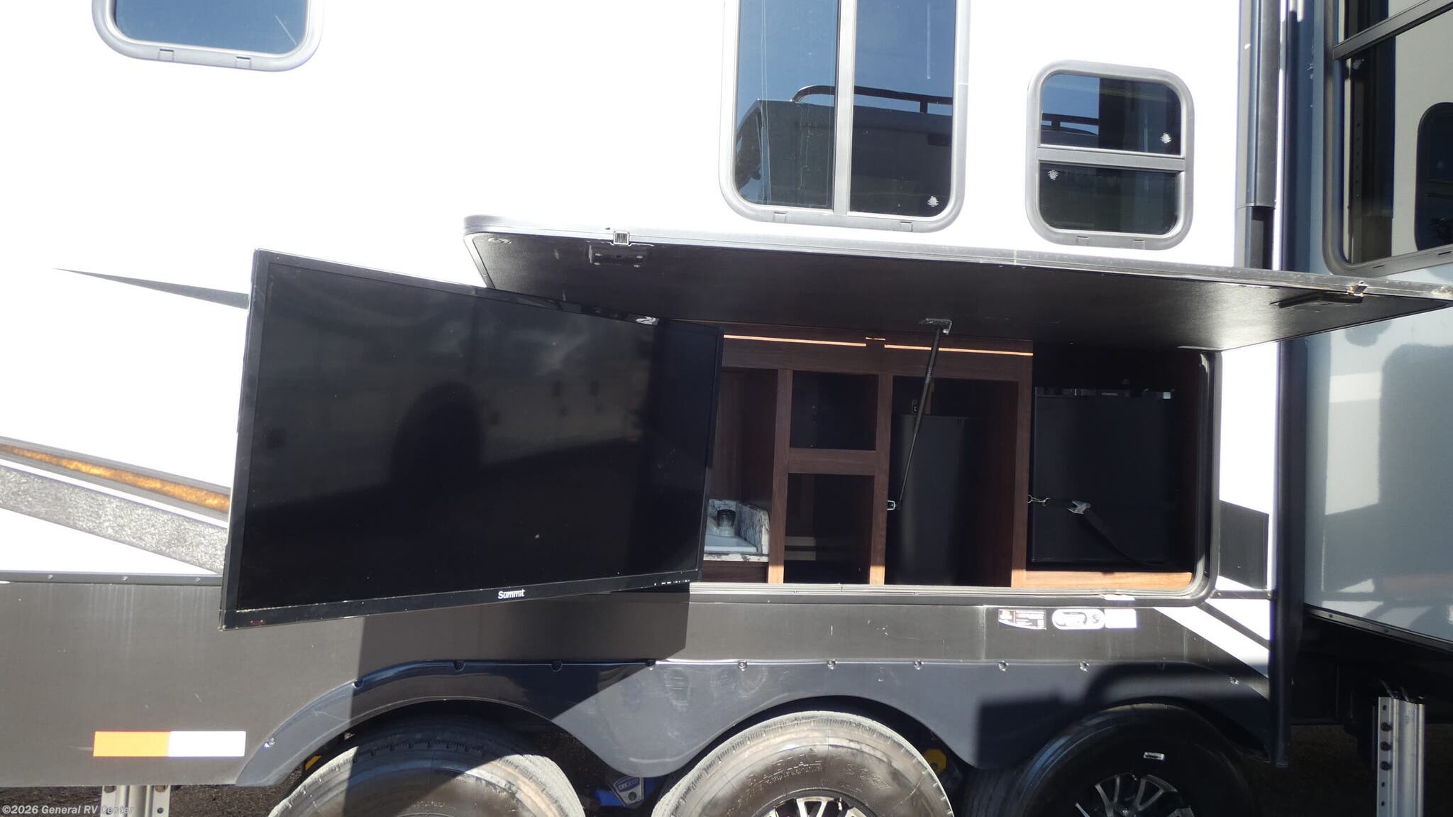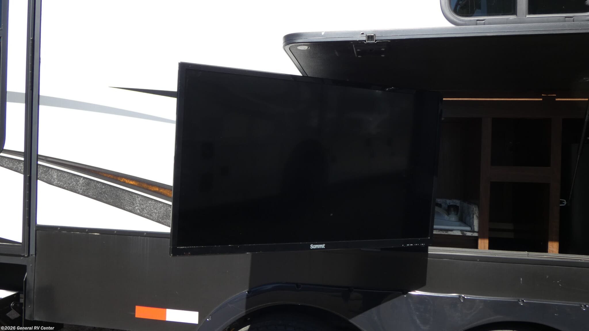 Heartland RV Cyclone toy hauler fifth wheel 4005 highlights: Loft 13’ Garage Bath and a Half Tilting King Bed Outside Kitchen Find comfort and functionality throughout this Cyclone 4005 toy hauler fifth wheel by Heartland RV. This triple slide out model features plenty of room for your whole family from the 13’ rear garage with loft to the front bedroom which features a tilting king bed, a slide out, and plenty of storage space. At the top of the stairs is the main bathroom and in the garage you will find a half bathroom where you can easily clean up when you come in from playing outside. Also outside you will find a kitchen and a slide out TV, so now you can watch a movie out under the stars. Inside there are plenty of seating choices in the living area. From the sofa, lounge chairs, or the loveseat you can easily watch TV at the 55” LCD HDTV and more! The Cyclone toy hauler fifth wheels by Heartland RV are not your ordinary toy hauler. These models have beautiful cabinets and plenty of comforts throughout such as high quality residential furniture, a 55” LCD HDTV flat screen TV, cable TV and satellite hook-ups, plus a separate DVD/CD/MP3 Bluetooth stereo for the garage and exterior. Along the exterior there are stunning graphics and you will enjoy the view out of the large bedroom picture windows. The two side awnings with LED lights provide plenty of shade during the day, and at night you can grab a snack, your camp chair, and enjoy visiting outdoors just a bit longer. The ultra-light ramp door allows you to easily load your off road toys. In the garage you will also find an electric rear screen, decorative chair rail, plus built-in overhead cabinets with an entertainment center and more!