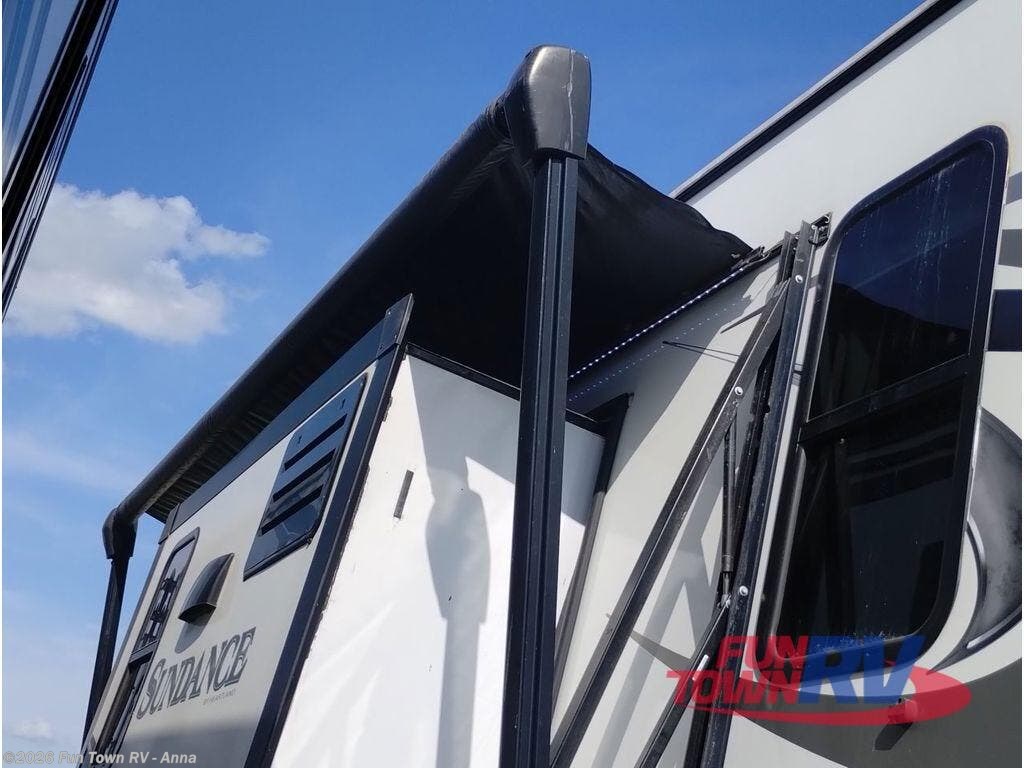 This Sundance mid-profile fifth wheel is a great couples coach which provides a roomy interior that you are sure to enjoy. The triple slides are all flush mounted slides so there is no bump on the floor to trip over when your slides are fully extended. You will enjoy a complete kitchen including a handy island where your sink is located, and stainless steel appliances as well. There is plenty of storage throughout with a large closet in the master bedroom, a pantry, plus overhead cabinets in the kitchen area as well as across the entire rear of the unit making it easy to keep things tucked away when not in use.
