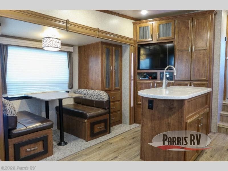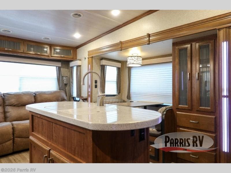 This Sundance mid-profile fifth wheel is a great couples coach which provides a roomy interior that you are sure to enjoy. The triple slides are all flush mounted slides so there is no bump on the floor to trip over when your slides are fully extended. You will enjoy a complete kitchen including a handy island where your sink is located, and stainless steel appliances as well. There is plenty of storage throughout with a large closet in the master bedroom, a pantry, plus overhead cabinets in the kitchen area as well as across the entire rear of the unit making it easy to keep things tucked away when not in use.