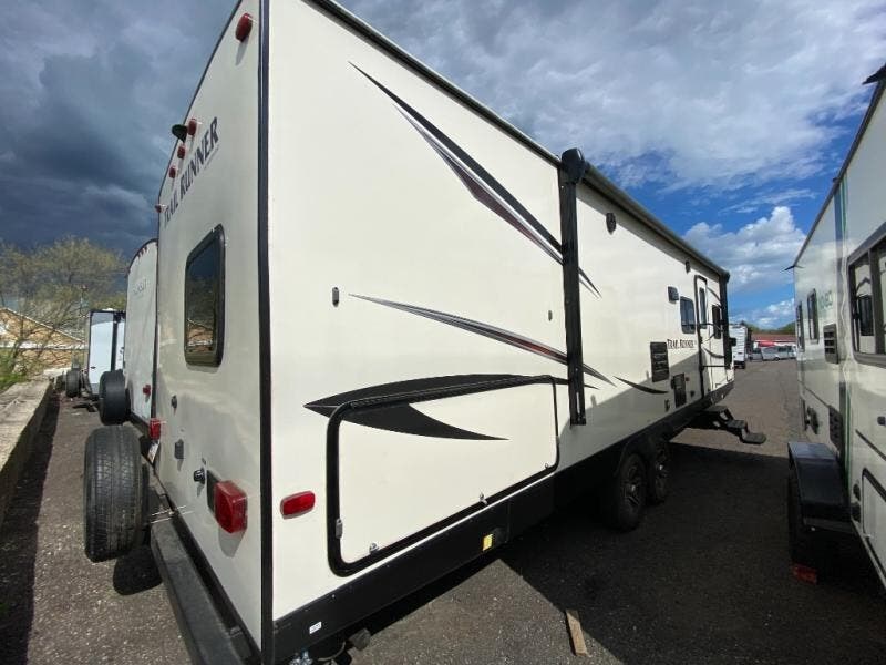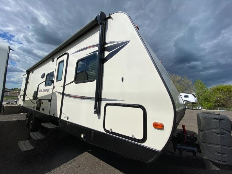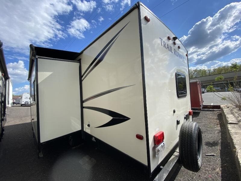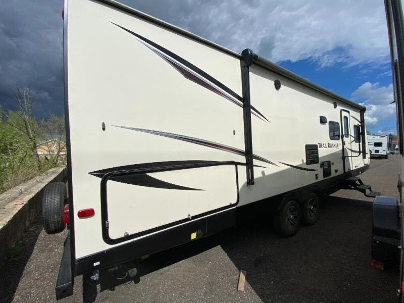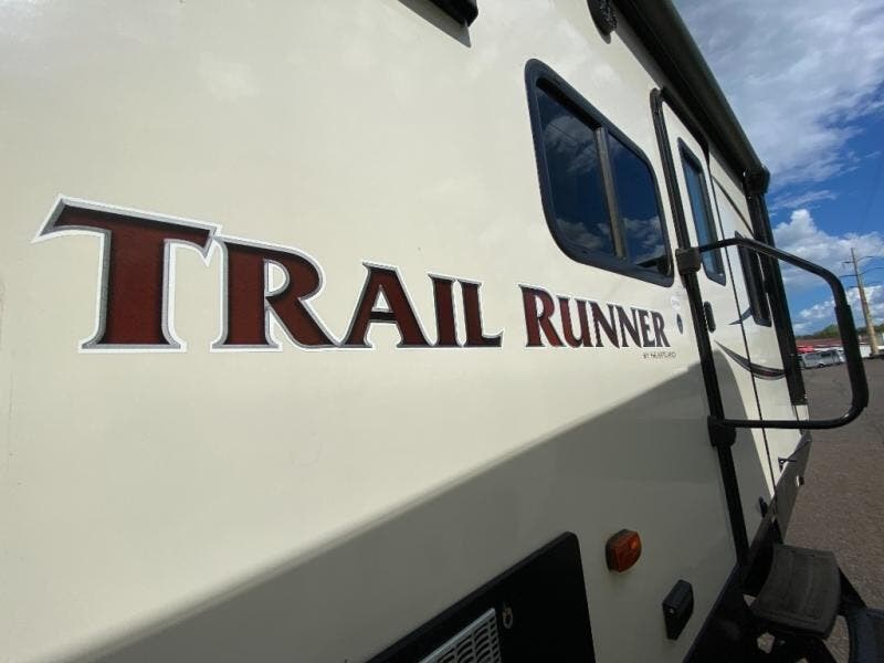 When you choose to camp with a Heartland RV Trail Runner travel trailer you will be camping in style. Each model features an aluminum exterior as well as an aerodynamic front, convenience electric powered slide outs, Dexter E-Z lube axles, black framed radius tinted safety glass windows, and a fully walkable roof. Inside enjoy plenty of lighting with the LED lights, convertible sofas with flip down center consoles, wood pocket sliding doors, an AM/FM/CD/DVD player with Bluetooth capability, and a USB charging port. In the kitchen you will enjoy stainless steel appliances, a high rise pull out kitchen faucet, plus a double door refrigerator. If the standard features are not enough for you, then come check out the list of options, you won't be disappointed!