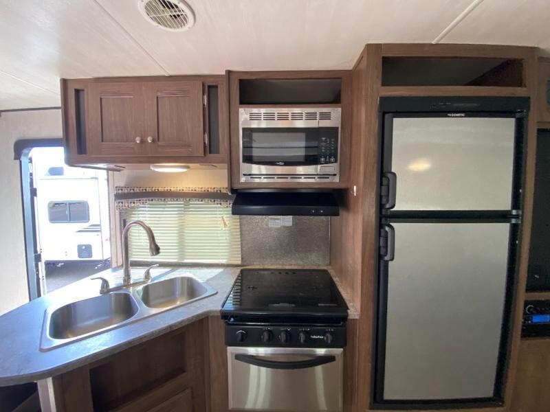 See just how easy and fun camping can be with your family of nine when you have this Trail Runner 285ODK by Heartland RV in tow! In the rear you will find a set of double over double bunk beds for your kids. The u-dinette and sofa can also double as sleeping space, if needed, and for mom and dad they will enjoy the private front bedroom which has a queen bed. The chef in the family will enjoy the choice of fixing the meals outside at the exterior kitchen or inside at the full size kitchen. You will also find plenty of storage space throughout this model for all of your necessary camping items and more!