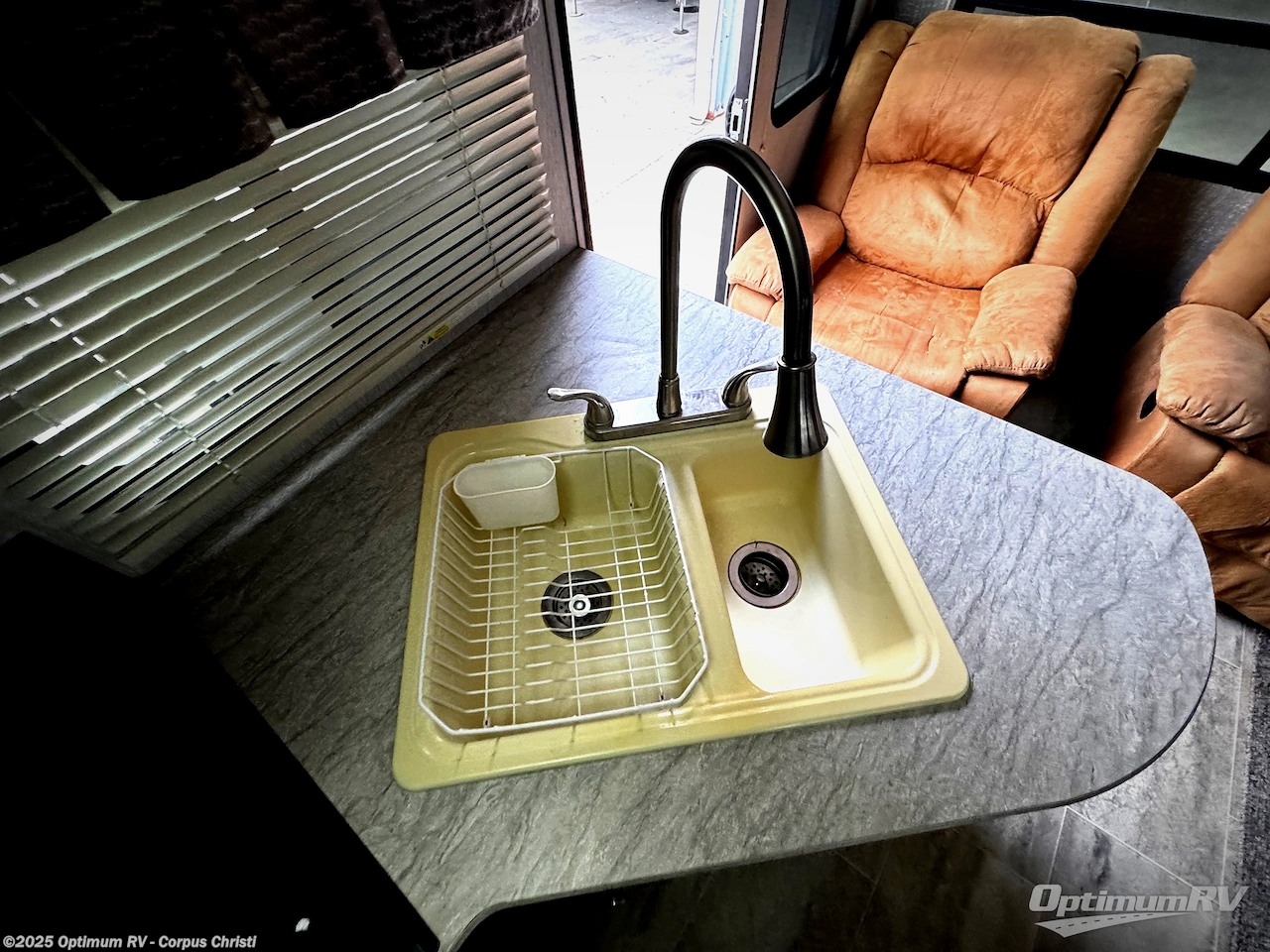 To the right of the rear entry door find kitchen amenities that make cooking simple while camping. There is a refrigerator, three burner range, double sink, and storage both above and below. You can also find additional storage just off the slide out booth dinette and sofa. Here you can choose to add an optional LCD TV if you like.
