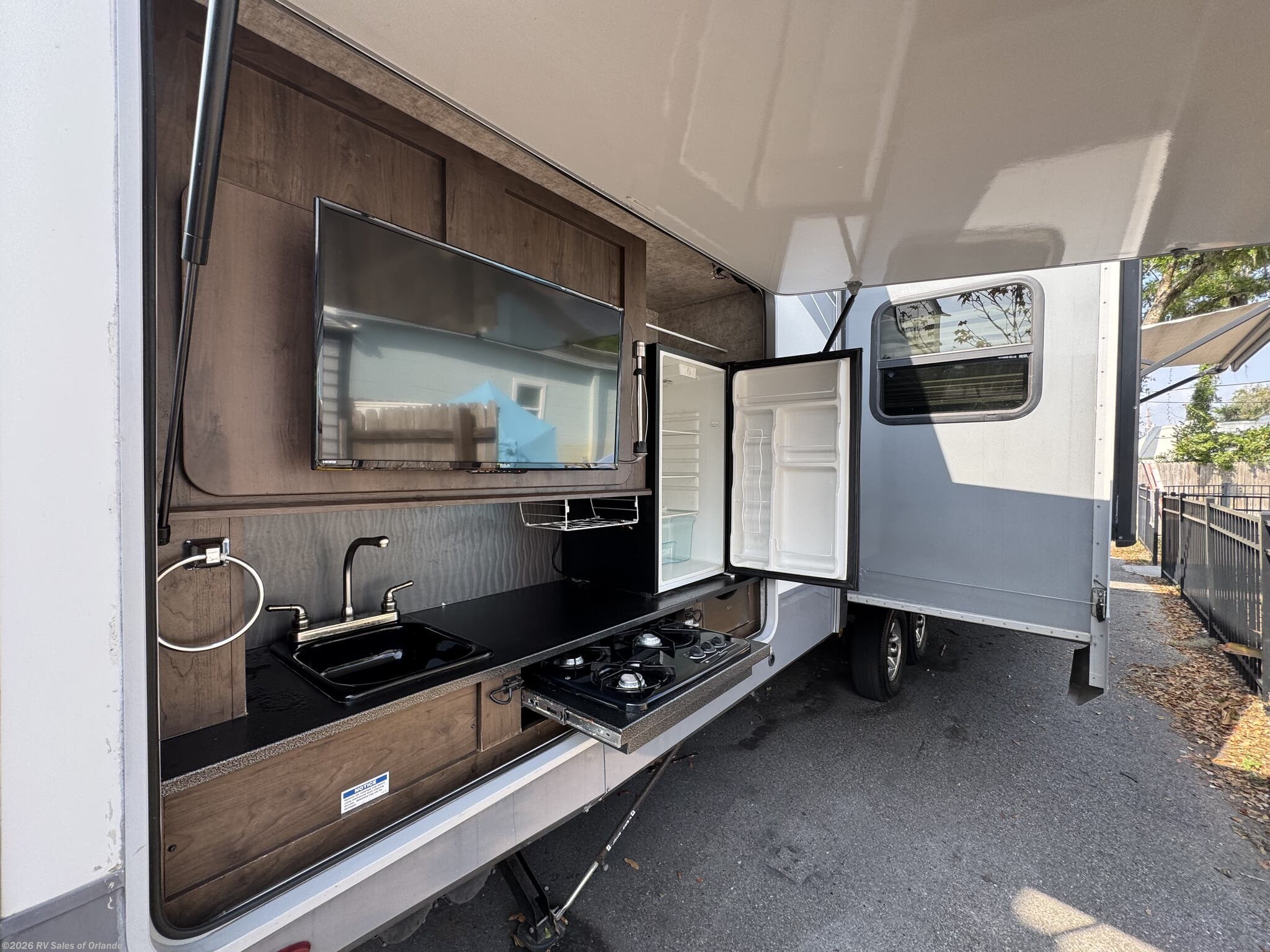 Super spacious, family-ready RV that actually has room for everyone. When you step inside and you’ll immediately notice how open and comfortable it feels thanks to the four slide-outs. The living area gives you plenty of space to relax, with a cozy seating setup with a 50+ inch TV actually 4 TV's in total and island real stoneisland kithcen with double stainless sink, residential stainless fridge and a full stainless appliance kitchen that’s ready for everything from quick breakfasts to full dinners. Bunk has 2-3 bunks perfect for kids, guests plus including their own bathroom and private dinette and TV or use for tons of storage throughout means you’re not sacrificing convenience for space. One of the biggest standout features? Two bathrooms. No more waiting in line when you’re camping with family or friends—this makes a huge difference on longer trips. The master bedroom up front offers a comfortable KING bed retreat with privacy, while the overall layout easily sleeps 5-6 people, making it ideal for family adventures or hosting guests. Outside is where this unit really shines. The fully equipped outdoor kitchen comes with a microwave, TV, gas stove, and refrigerator, making it perfect for entertaining, tailgating, or just enjoying the outdoors without running in and out.