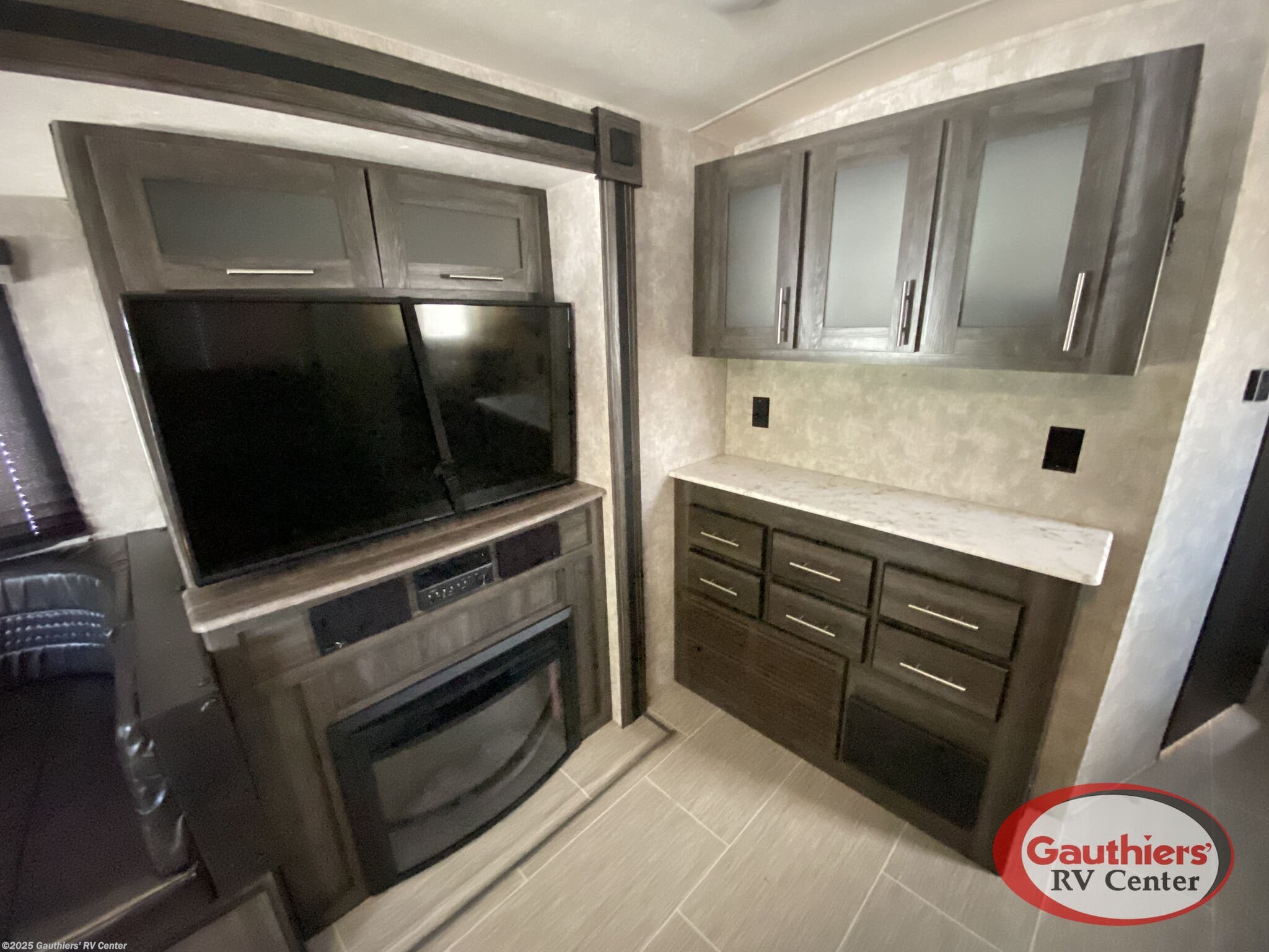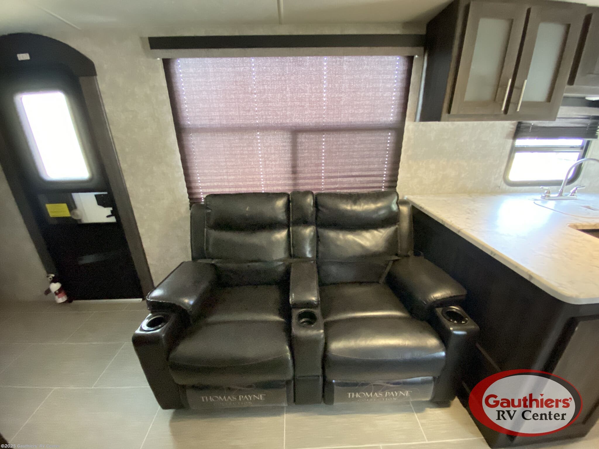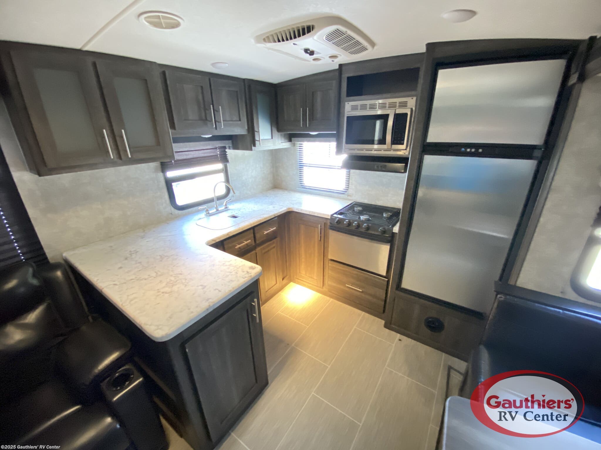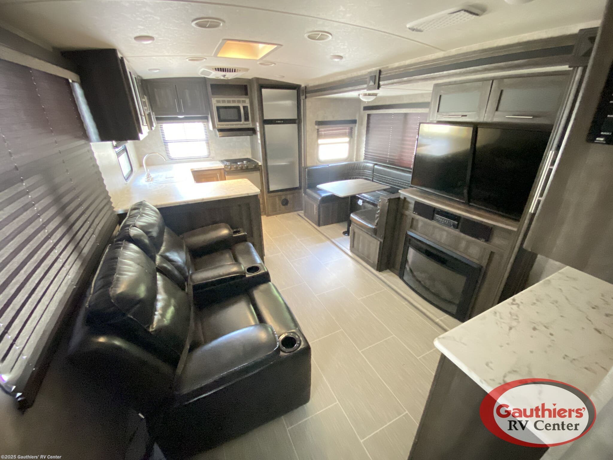 The Open Range Ultra Lite emphasizes comfort and style inside. Highlights include a cozy fireplace for ambiance, pleated shades for light control, a theater seating arrangement, and a queen mattress in the front bedroom. The dinette converts to a bed, making it easy to host guests or add sleeping space without sacrificing living area. The kitchen is equipped with a microwave, oven, refrigerator, and stainless appliances to handle everyday meals on the road.