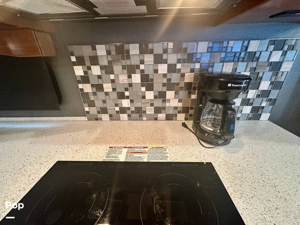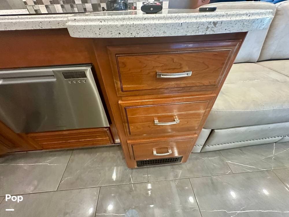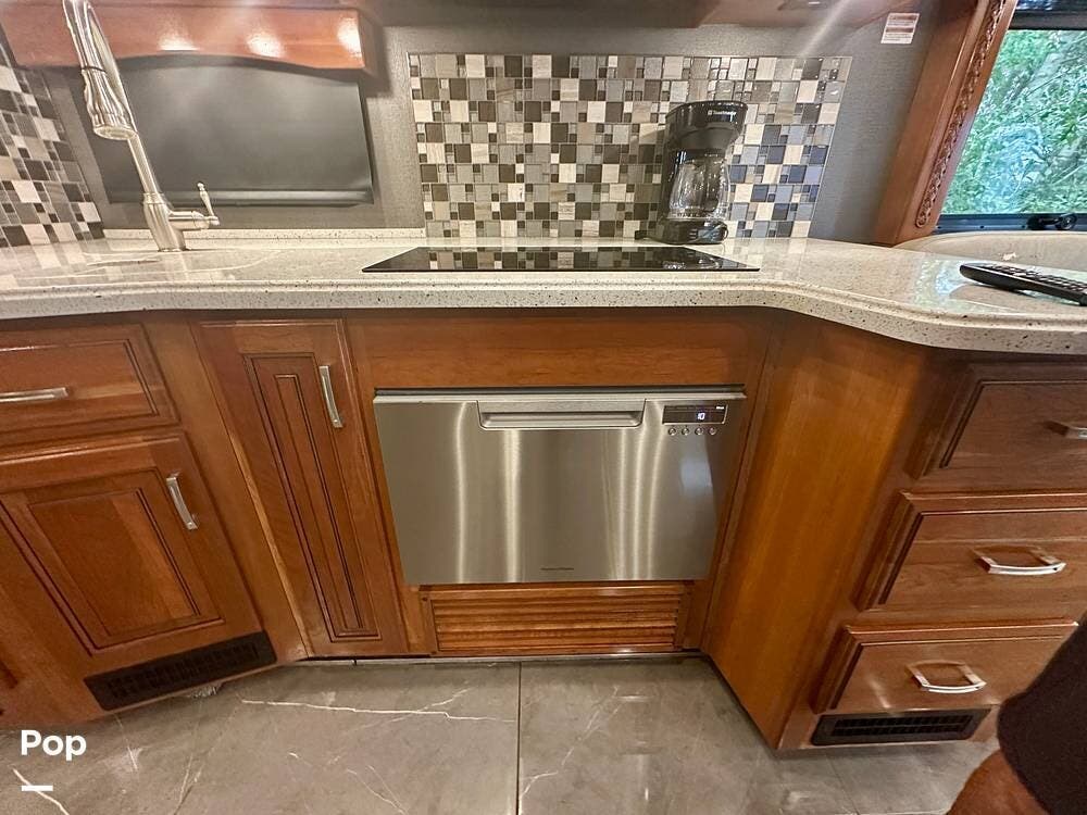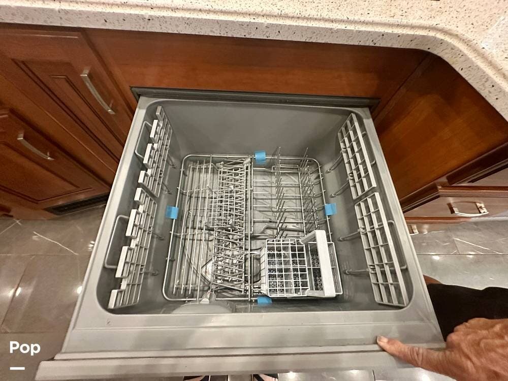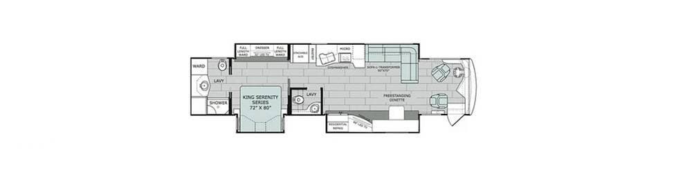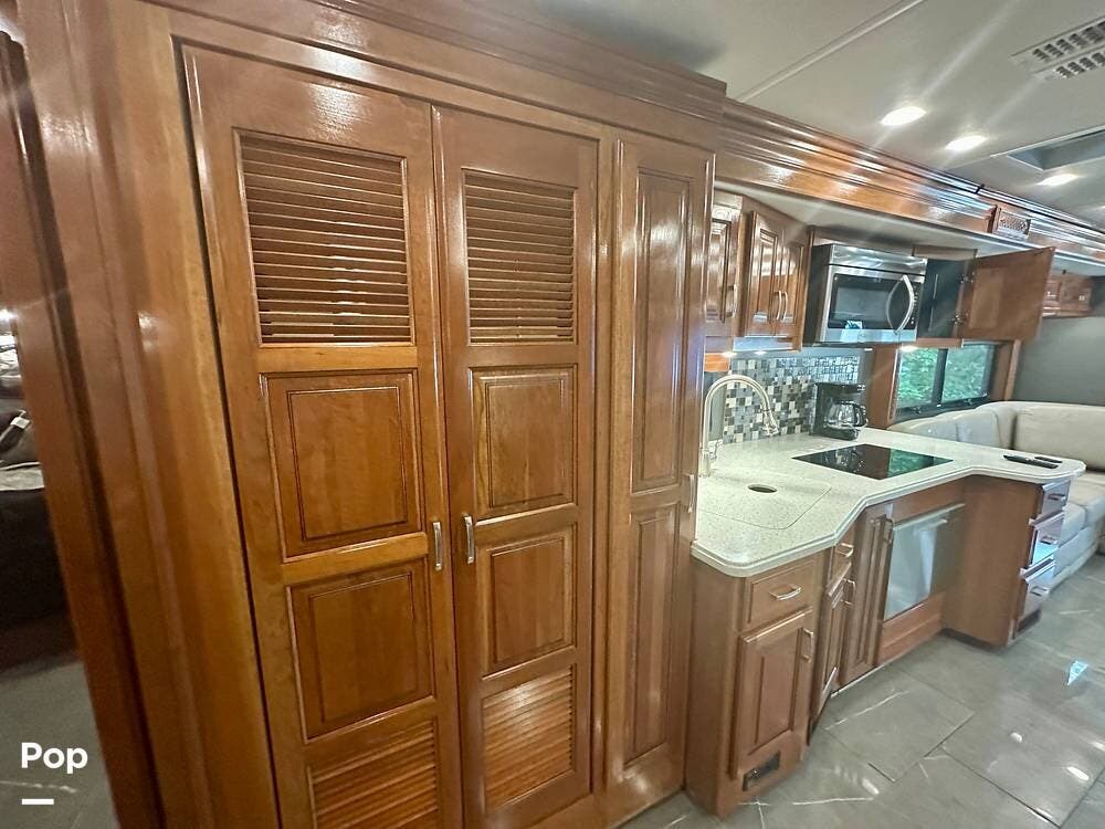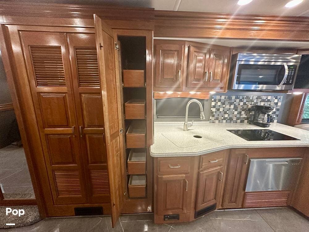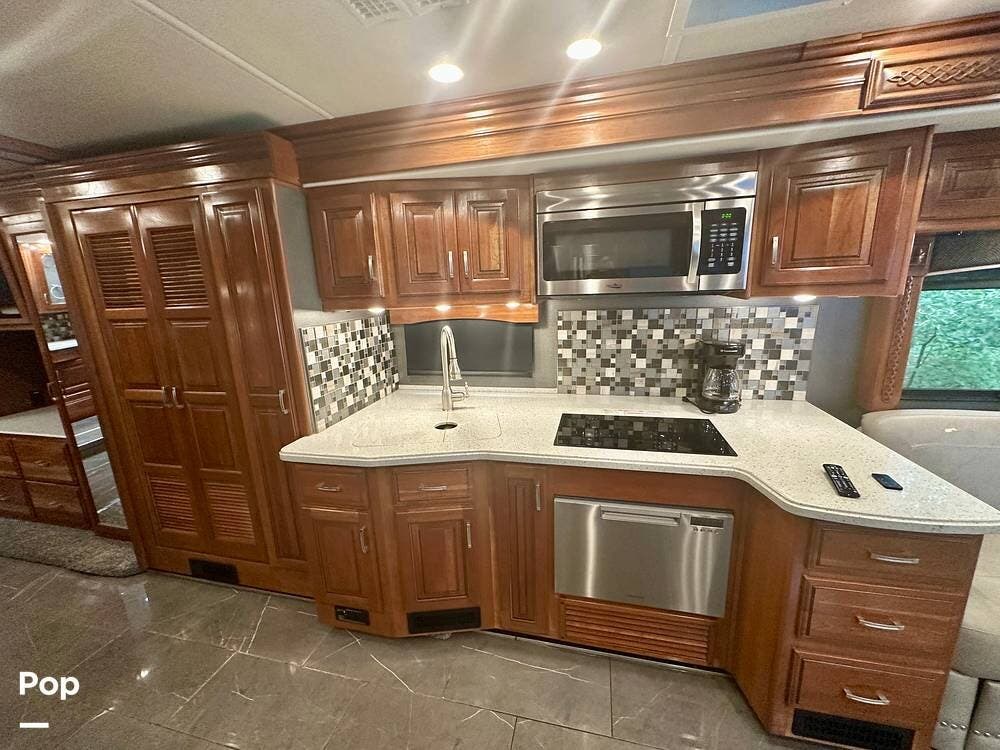The kitchen is well equipped with a full-size refrigerator and freezer, a dishwasher, a stovetop, and a convection microwave. It brings the conveniences of a full kitchen on the road, including a large pantry and plenty of cabinets and drawers for all your cooking needs.
