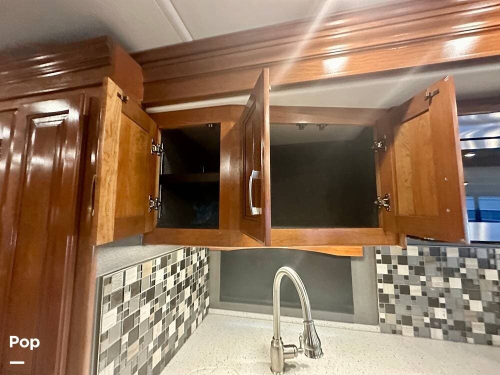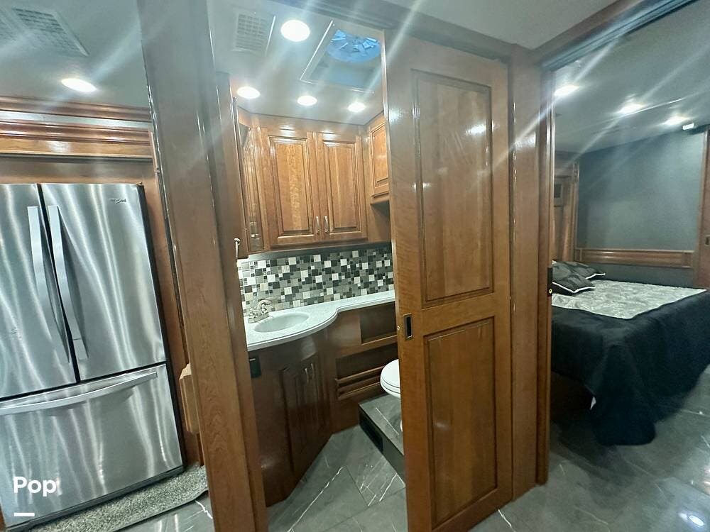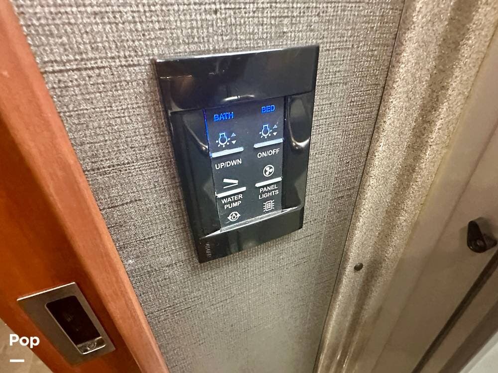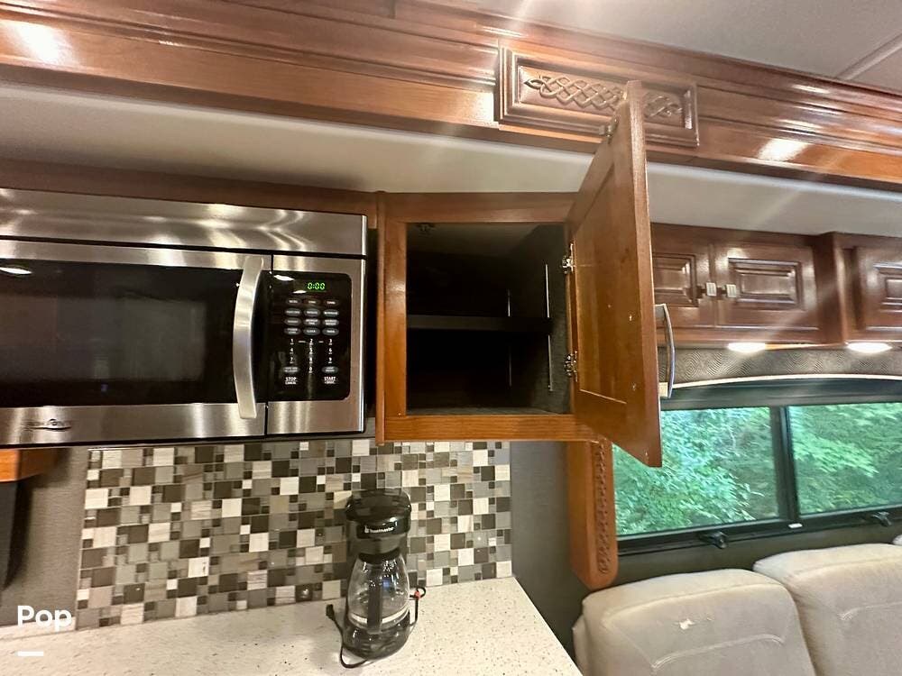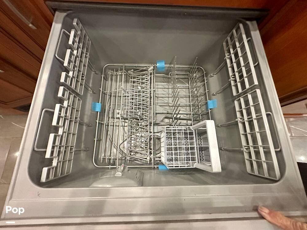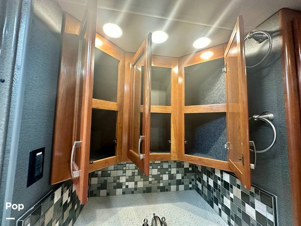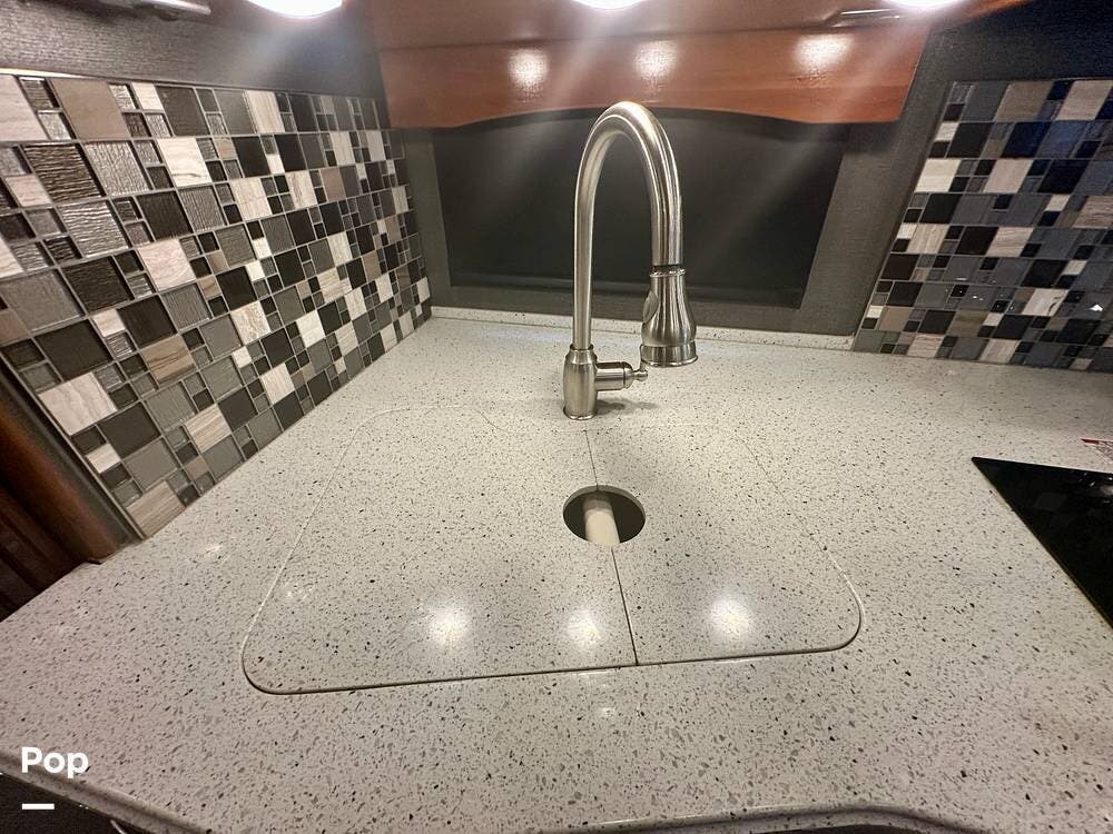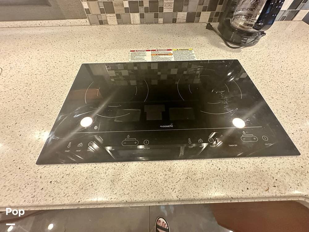 The kitchen is well equipped with a full-size refrigerator and freezer, a dishwasher, a stovetop, and a convection microwave. It brings the conveniences of a full kitchen on the road, including a large pantry and plenty of cabinets and drawers for all your cooking needs.